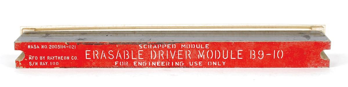 Rare Apollo Guidance Computer (AGC) module, 9.75 x 1 x 1.75, labeled on the red exterior, “Erasable Driver Module B9–10, NASA No. 2003114-021. Mfd by Raytheon Co., S/N Ray. 100.” Also marked, “Scrapped Module, For Engineering Use Only.” In very good to fine condition. This module was responsible for providing required voltages to read and write from the 2K word erasable memory in the AGC. The AGC was the primary computer onboard the Command Module and Lunar Module used to autonomously navigate and fly the spacecraft throughout all phases of the lunar mission. An extremely desirable space-age computer piece.