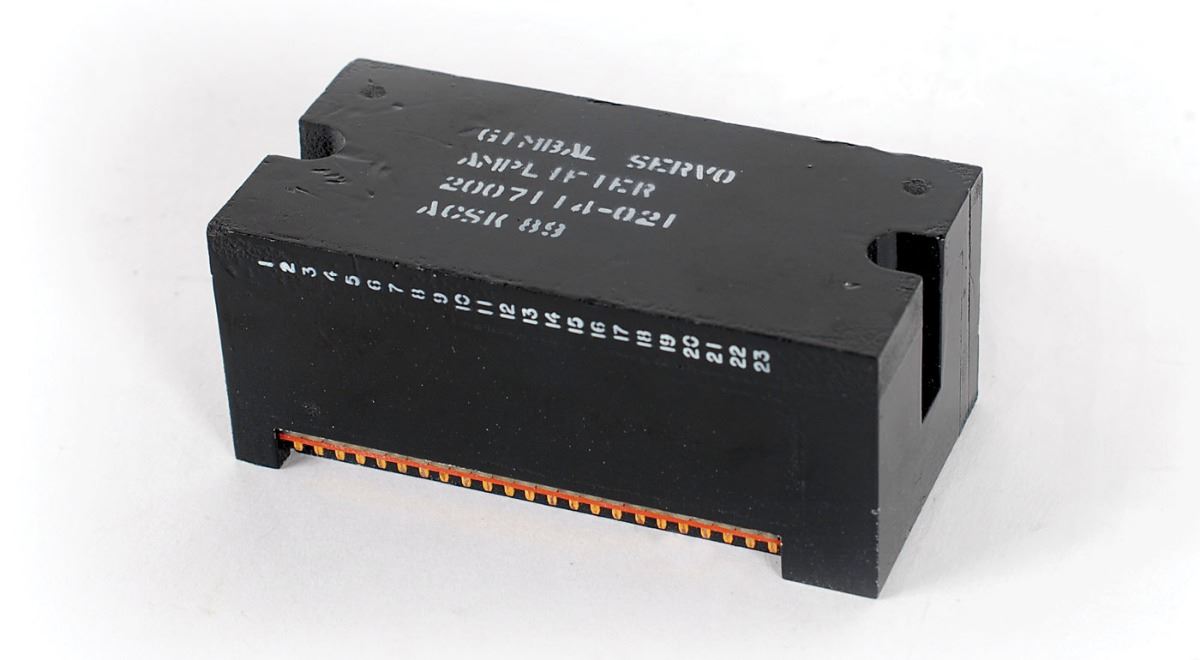 Black electronic component with 23 pins on one side, 3.75 x 1.75 x 1.5, stenciled in white text, “Gimbal Servo, Amplifier, 2007114-021, ACSK 89.” In fine condition.