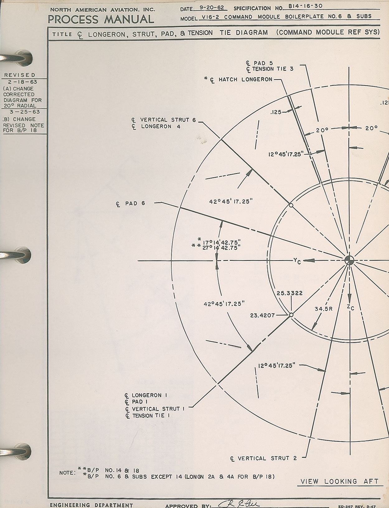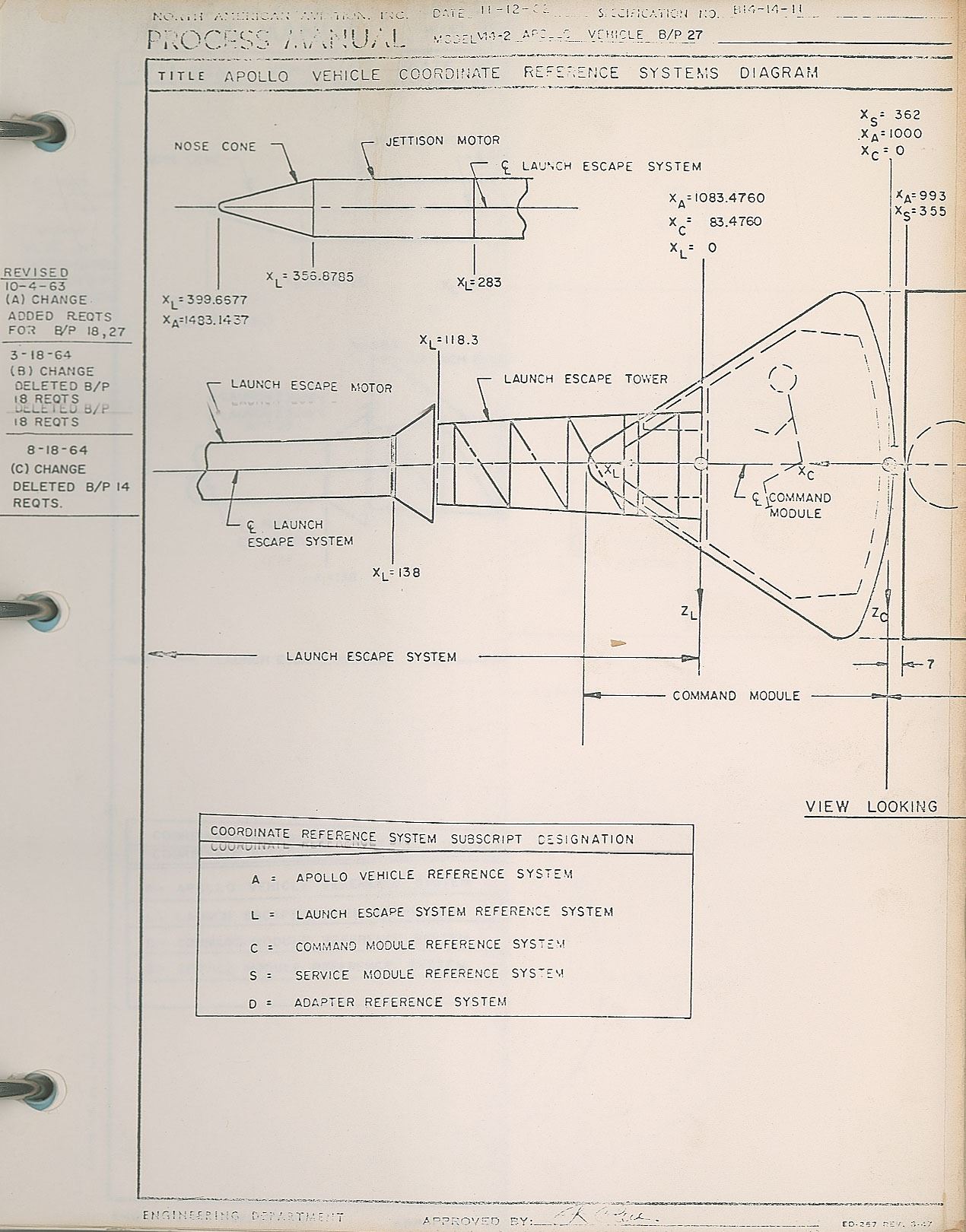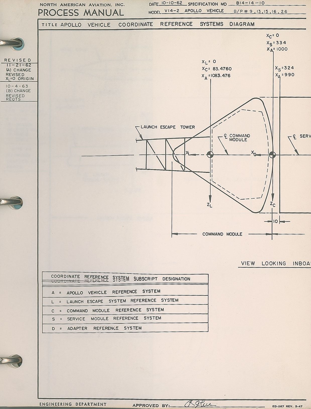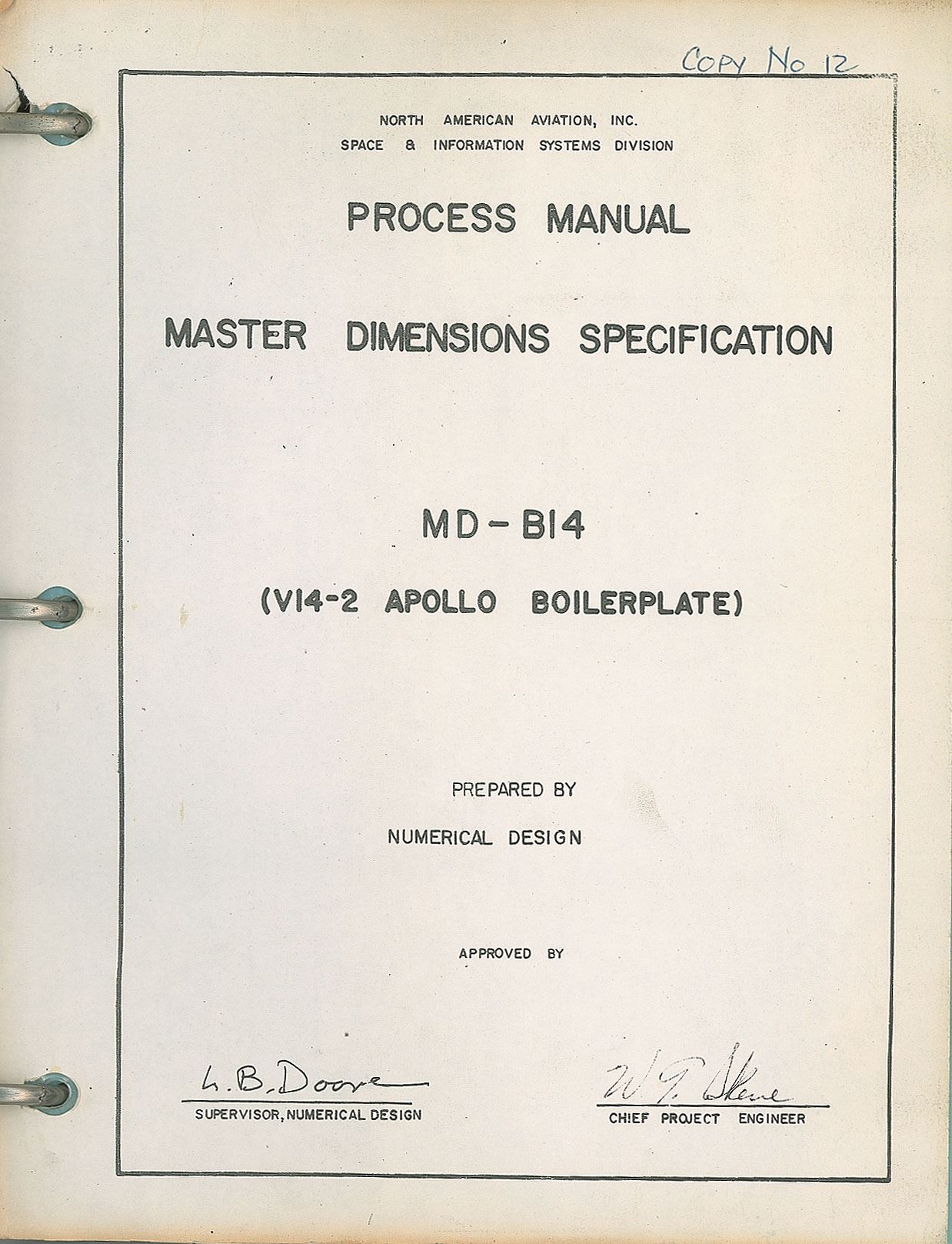 Scarce ring-bound North American Aviation manual entitled "Process Manual, Master Dimensions Specification, MD–B14 (V14–2 Apollo Boilerplate)," prepared by Numerical Design with upper right of title page annotated "Copy No. 12." The manual, featuring material compiled between 1962 and 1965, features five sections with tabs titled: "14. Apollo Vehicle," "15. Launch Escape System," "16. Command Module," "17. Service Module," and "18. Adapter." Housed in a blue three-ring binder with spine marked: "Master Dimensions Specification, Apollo, MD–B14." In very good to fine condition.