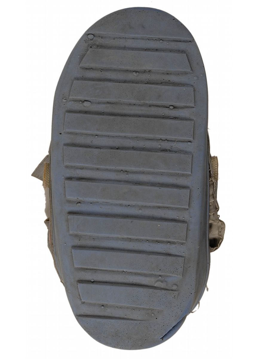 NASA KSC PAO contracted (by blueprint) high fidelity, model mock-up of the Apollo A7L outer moon boot. Boot measures 12.75? long, and is comprised of a one-piece rubber/silicone inner and outer sole, a Beta cloth throat which closes with two Velcro straps, and with several metal straps along the top edge. This boot was used by NASA’s PAO for public educational, space center lobby displays, and at the KSC's Spaceport USA now known as KSCVC. Areas of the cloth separating from the sole, otherwise fine condition.