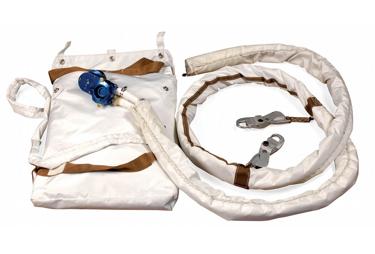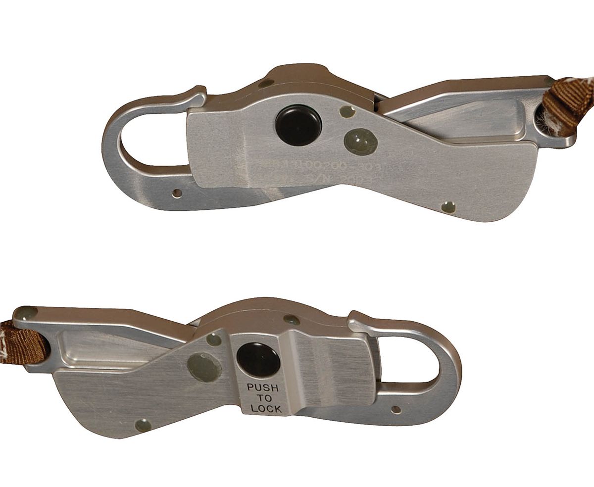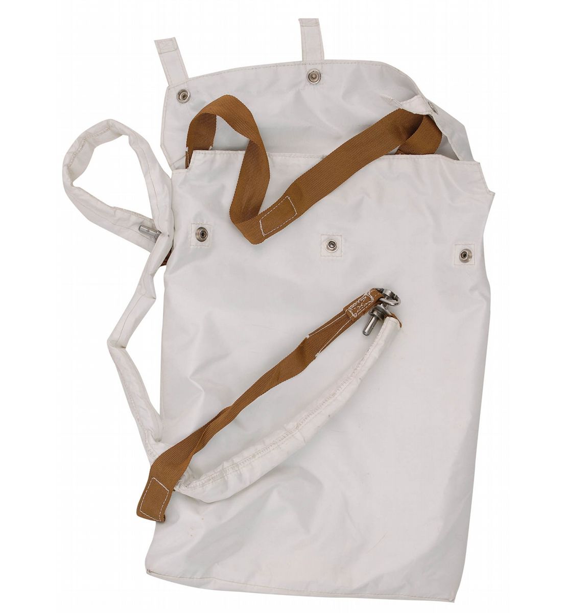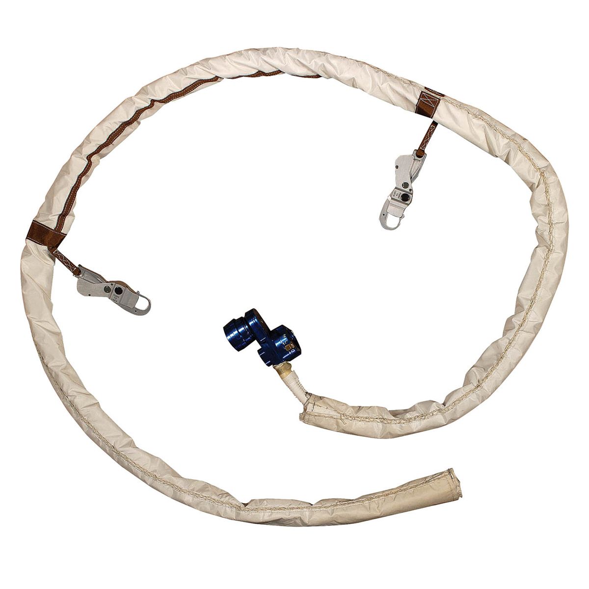 Very likely one-of-a-kind Apollo Buddy Secondary Life Support System. Part is designated Class III for training, with “Class III” etched into suit connector. This system was designed to go from space suit to space suit in an emergency on the lunar surface, to supply LCG cooling water to two astronauts using one PLSS. The system includes an umbilical cord which measures almost 8.5 feet long, consisting of a blue flow-dividing connector at one end, with an ordinary connector at one end coupled with a receptacle to accept a second PLSS water connector, which leads to two parallel plastic tubes inside. Tubes are surrounded by hand-stitched Beta cloth. Two metal lanyards are attached to the hose by stitched brown webbing to provide strain relief for the umbilical. The entire hose is accompanied by its snap-up Beta cloth thermally insulated stowage bag with lanyard used for storage.