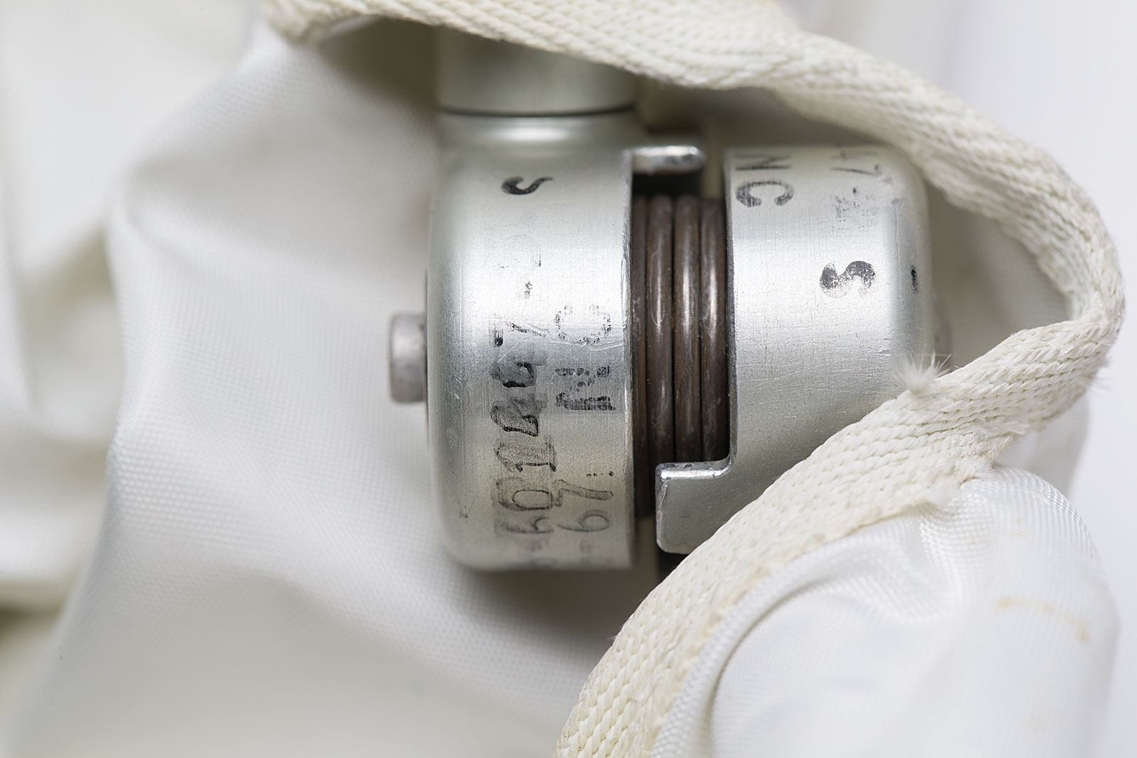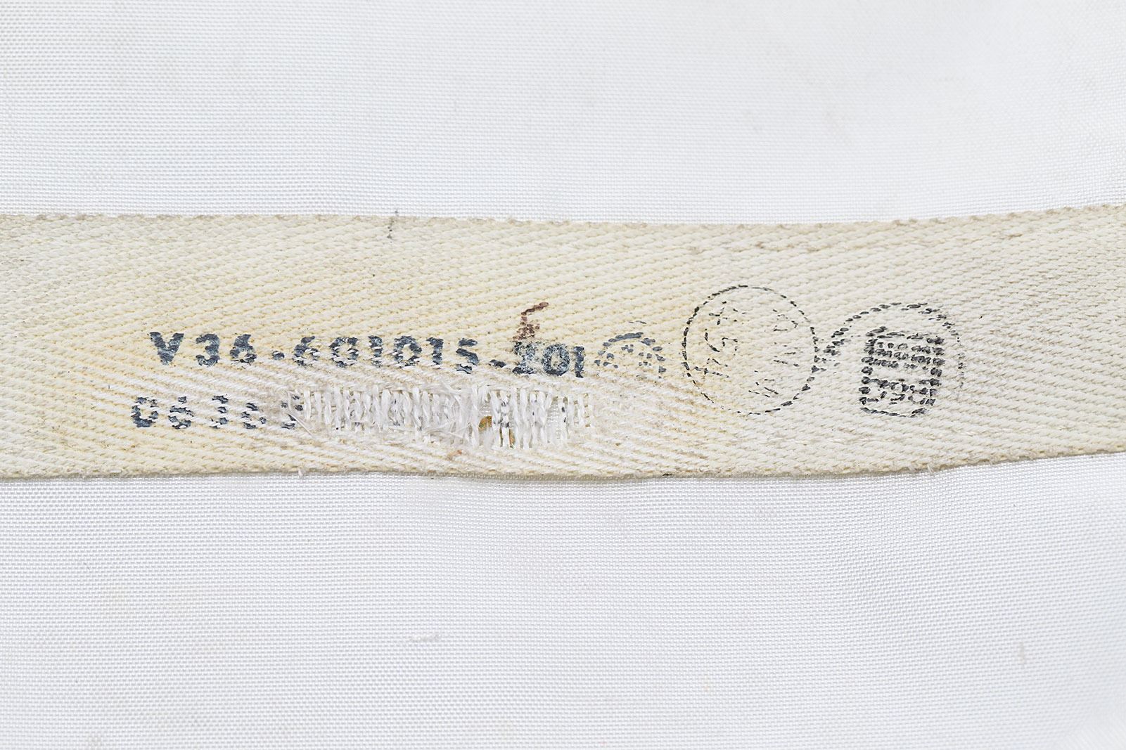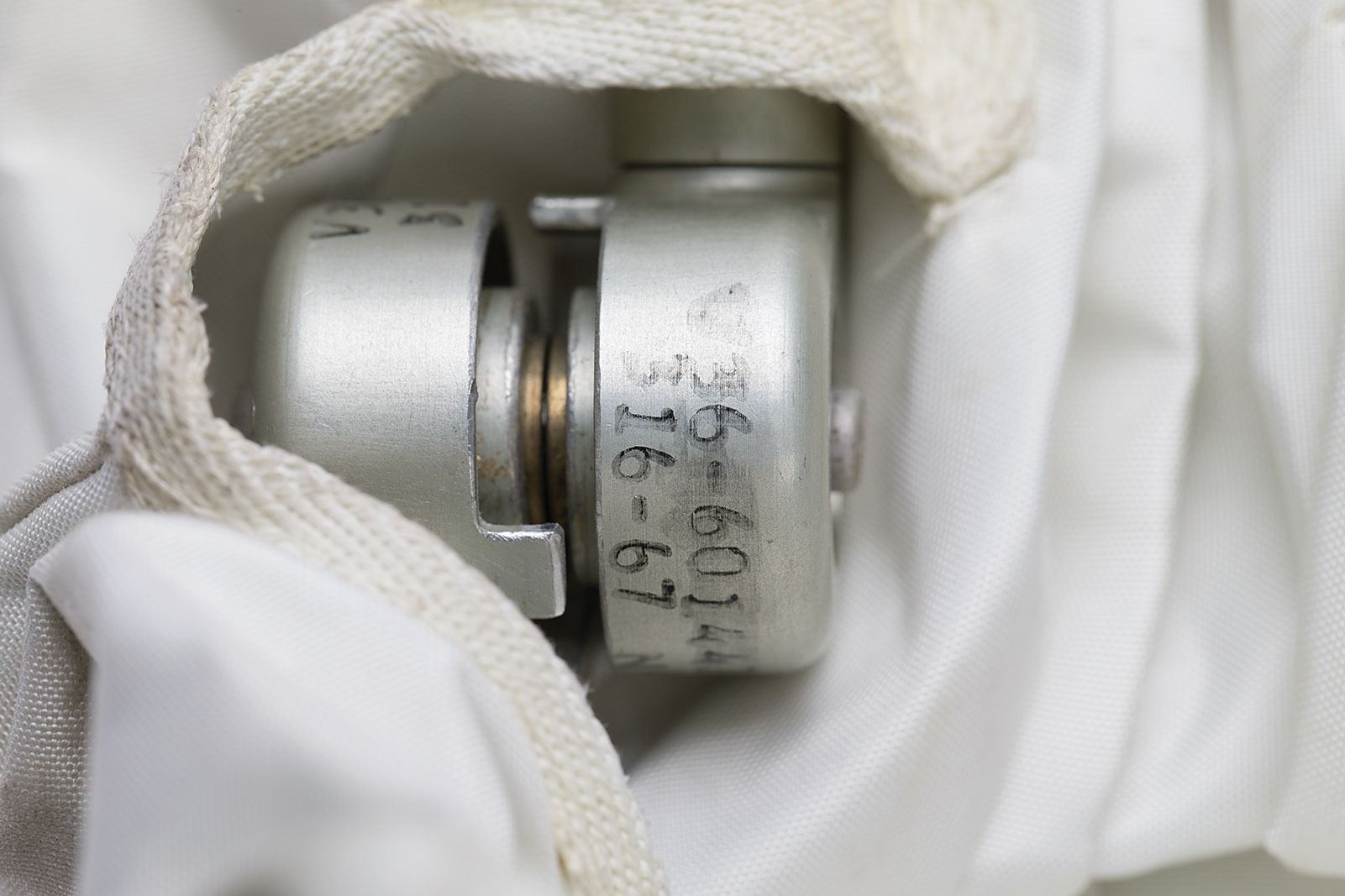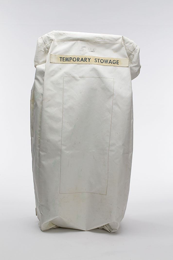 Apollo Command Module Beta Cloth Temporary Stowage Bag, measuring 14? x 27.5?, featuring a patch on the front reading, "Temporary Stowage." The reverse is marked with part numbers, "V36-601015-201," with the number below obliterated. The bag has a spring-loaded hinge closure. In fine condition, with scattered soiling.