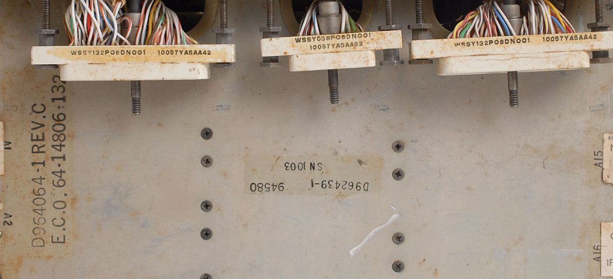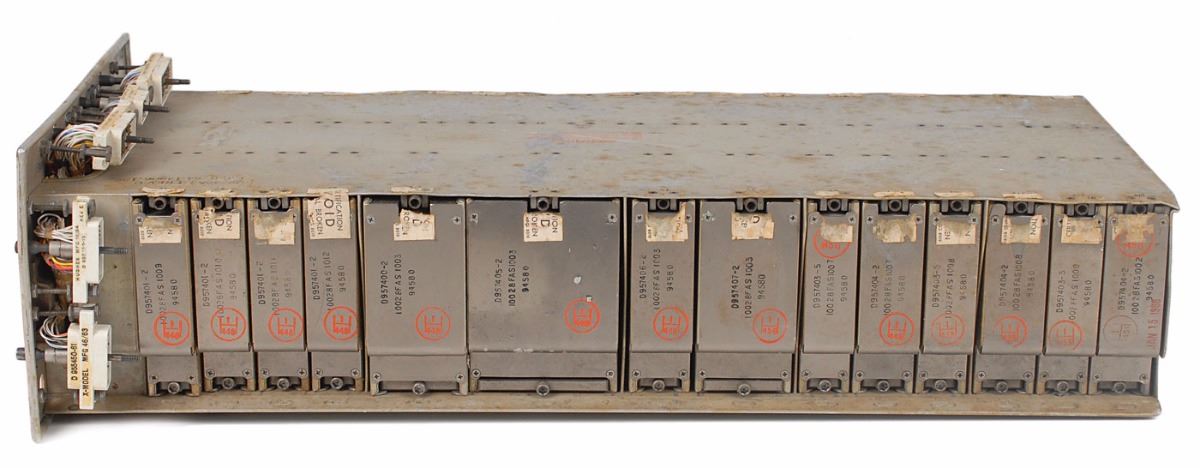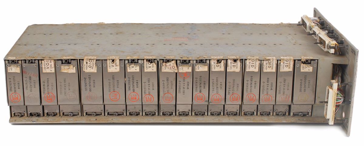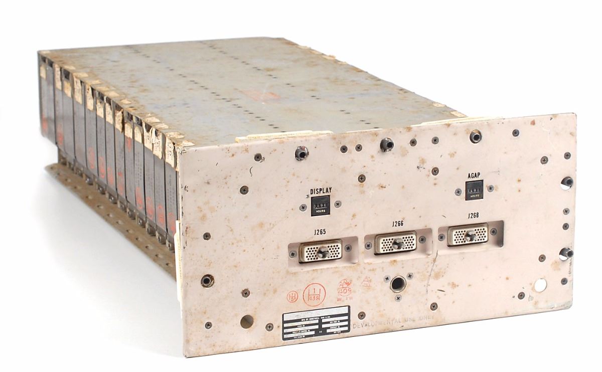 Apollo Command Module Block I Display Attitude Gyro Accelerometer Electronic Control Assembly manufactured by Honeywell, measuring 11.5 x 5.5 x 22, with an affixed parts label reading, “Control Assy Electronic Display/Attitude Gyro Accelerometer, NAA/S & ID Control No. E901-0170-0004, Mfr Serial No. 10028FAD1009, Mfr Part No. DBG220D1, Contract No. M3J7XA-406004, Mfr Date 5 Oct 1964.” Stamped beside this label is “Developmental Use Only.” The face has three serial inputs labeled “J265,” “J266,” and “J268,” as well as “Display” and “Agap” hour counters, and the primary assembly unit contains 31 modules labeled from “A1” through “A31.” In very good condition, with heavy soiling to the face and dings to the body. This electronic assembly functioned as part of the Apollo Command Module Stabilization & Control System providing control signals to CM Body Mounted Attitude Gyros and also served as the interface between attitude reference sensors and spacecraft panel electronic displays.