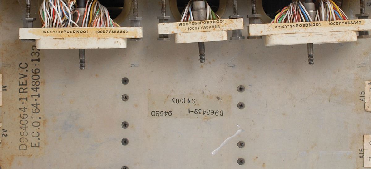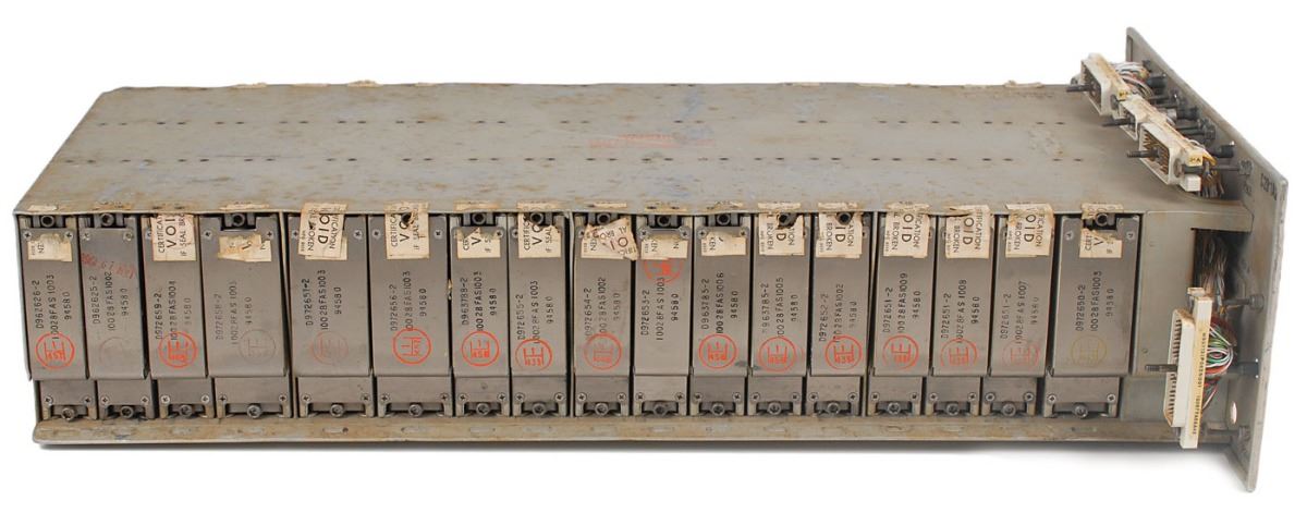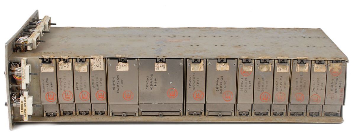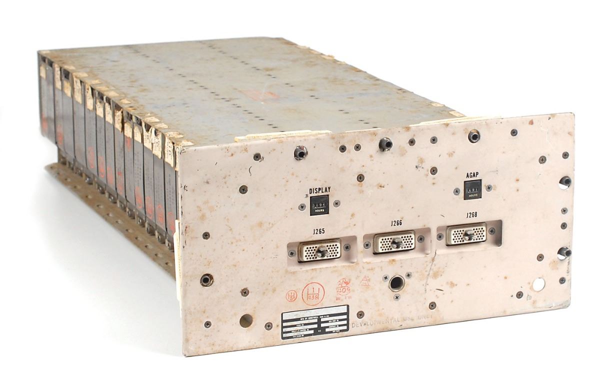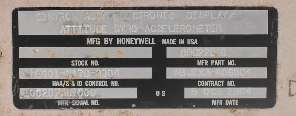 Apollo Command Module Block I Display Attitude Gyro Accelerometer Electronic Control Assembly manufactured by Honeywell, measuring 11.5 x 5.5 x 22, with an affixed parts label reading, “Control Assy Electronic Display/Attitude Gyro Accelerometer, NAA/S & ID Control No. E901-0170-0004, Mfr Serial No. 10028FAD1009, Mfr Part No. DBG220D1, Contract No. M3J7XA-406004, Mfr Date 5 Oct 1964.” Stamped beside this label is “Developmental Use Only.” The face has three serial inputs labeled “J265,” “J266,” and “J268,” as well as “Display” and “Agap” hour counters, and the primary assembly unit contains 31 modules labeled from “A1” through “A31.” In very good condition, with heavy soiling to the face and dings to the body. This electronic assembly functioned as part of the Apollo Command Module Stabilization & Control System providing control signals to CM Body Mounted Attitude Gyros and also served as the interface between attitude reference sensors and spacecraft panel electronic displays. Oversized.