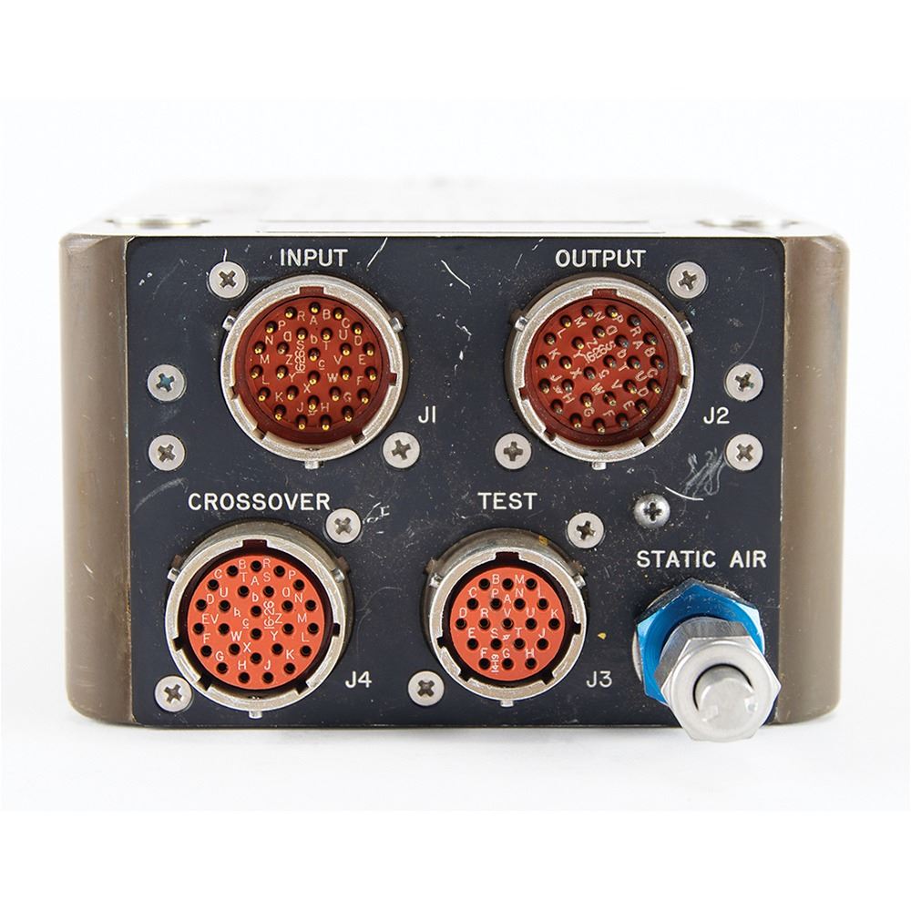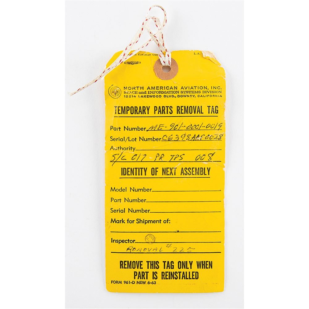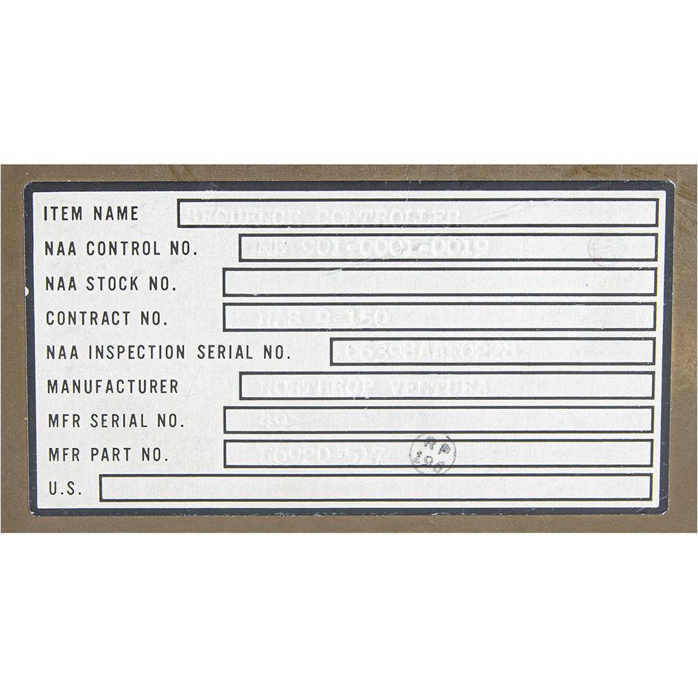 Flown Apollo Command Module Block I Earth Landing Sequence Controller (ELSC) flown on the Apollo 4 mission, measuring 7.25 x 4.5 x 3, bearing a large parts tag affixed to the top, reading: "Item Name: Sequence Controller, NAA Control No. ME 901-0001-0019, Contract No. NAS 9-150, NAA Inspection Serial No. 06398AAF0228, Manufacturer: Northrop Ventura, Mfr Serial No. 49, Mfr Part No. R6920-517." One side is stamped in black text, "S/C 017, Post Recov Item." The unit has four connector ports labeled "J1" through "J4," and a blue "Static Air" port. A plate to the underside reads: “Current Equalizing Module.†Includes the North American Aviation 'Temporary Parts Removal Tag,’ which reads: “Part Number ME-901-0001-0019, Serial/Lot Number C6398AAF0028, S/C 017 PR TPS 008, Removal #225.†In fine condition, with light scattered marks.