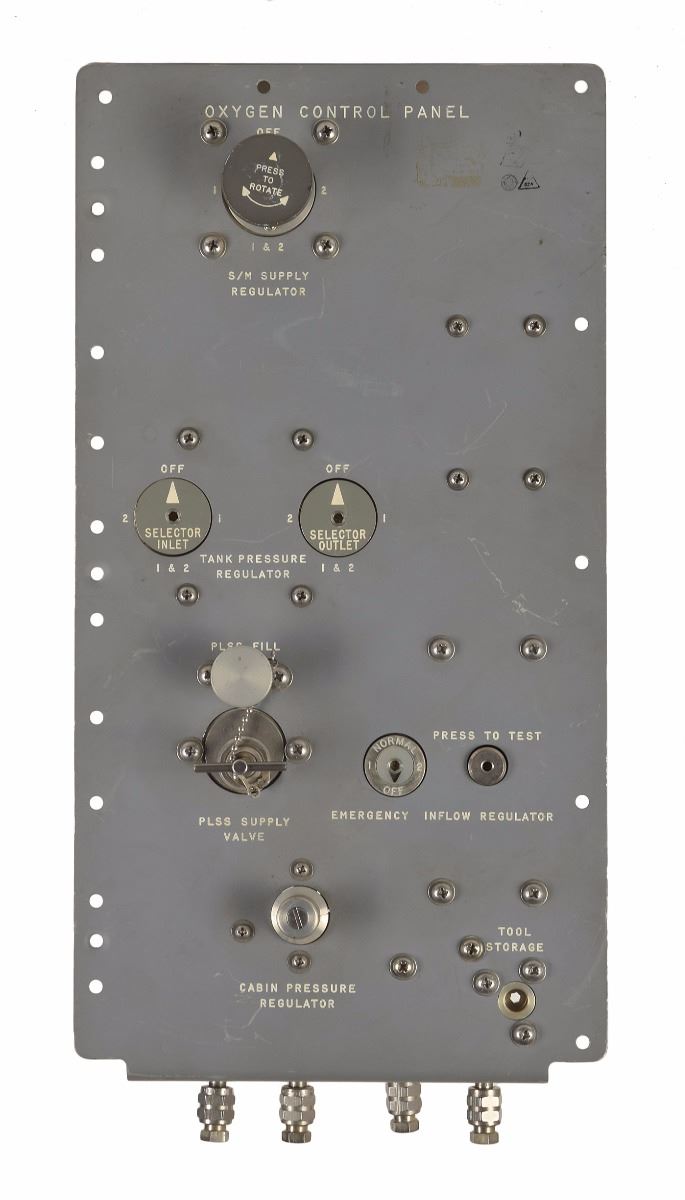 Apollo Block I Oxygen Control Panel by AiResearch Manufacturing Corp., measuring approximately 8.5 x 17.75 x 6.5. Designed to control oxygen supply in the Command Module, the panel features several buttons and inlets related to oxygen regulation, including: "S/M Supply," "Tank Pressure, "Emergency Inflow," and "Cabin Pressure." Also features a space for "Tool Storage," and options related to the PLSS (Primary Life Support System) and supply valve. Mechanical parts to reverse bear inspection stamps and several affixed green metal AiResearch labels. In fine condition. Panel includes a pressure transducer, a decidedly expensive component that was used in non-spaceflight systems and is often removed for separate sale. Deriving from the early pre-lunar Apollo mission, this Block 1 control panel was a vital instrument related to flight systems development and qualification of all unmanned missions.