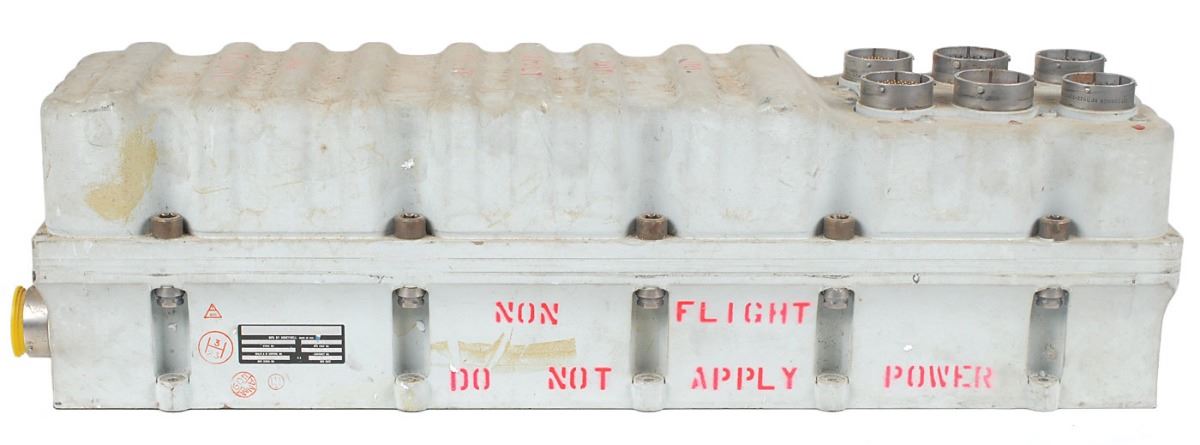 Apollo CM Block I Prototype Electronic Display Assembly manufactured by Honeywell, 21.5 x 6 x 5.5, with an affixed parts label reading, “Electronic Display Assembly, NAA/S & ID Control No. ME901-0710-0021, Mfr Serial No. EM-1, Mfr Part No. FBG285A1, Contract No. M5J7XAZ-450012A, Mfr Date Sept. 1965.” The unit has a thick gray metal housing stenciled in red, “Non Flight, Do Not Apply Power,” with six connectors on the top and two ports on one end. Scattered marks, dings, and soiling, otherwise fine condition. As part of the Apollo Command Module Stabilization and Control System, this electronics assembly provided the interface between signal sources to be displayed (derived from the inertial navigation system) and the main display console crew reference displays to include the Flight Direction Attitude Indicators and Gimbal Position Indicators. Oversized.