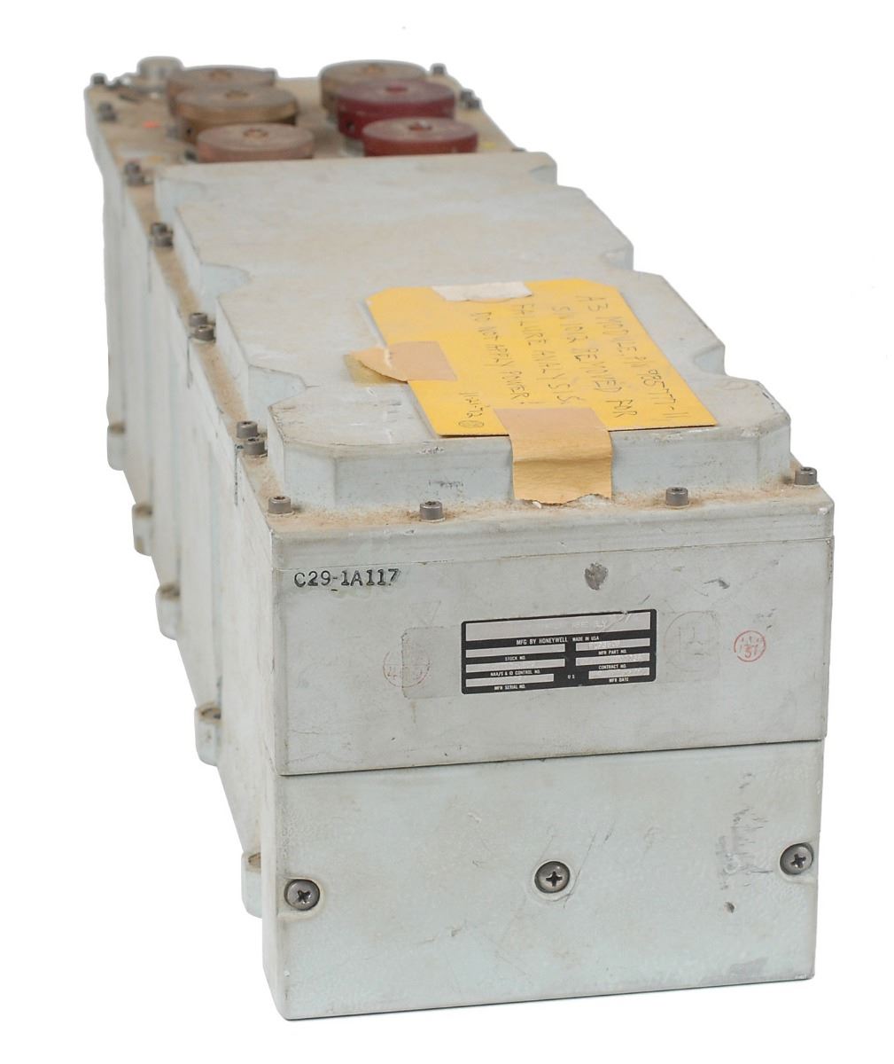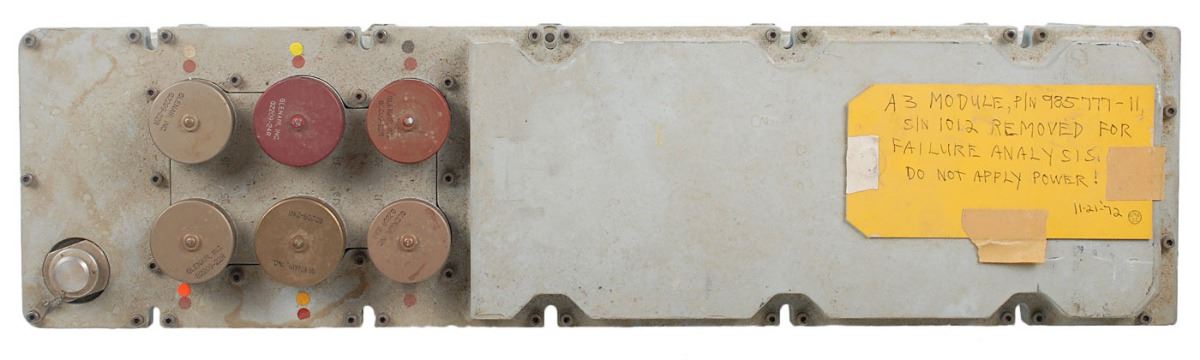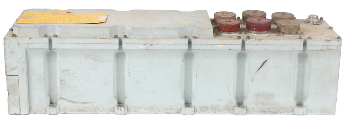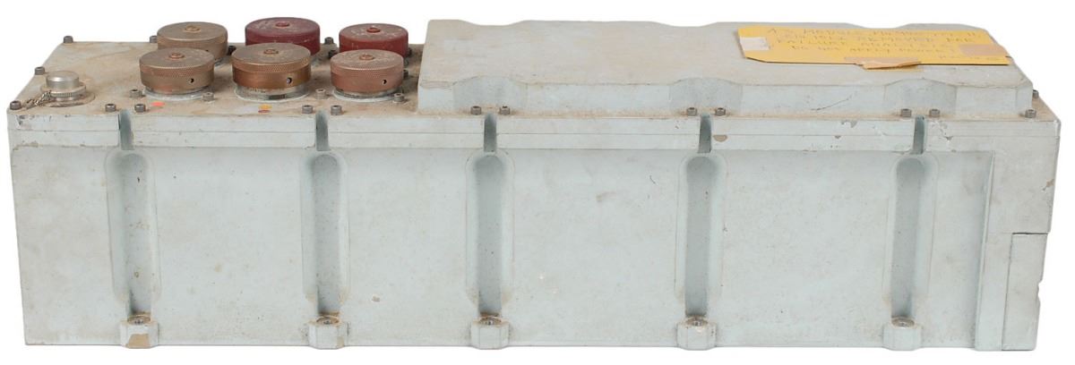 Apollo Command Module (Block II) Control and Stabilization System Electronic Display Assembly (EDA) manufactured by Honeywell, 22 x 6 x 6, with an affixed parts label reading, “Electronic Display Assembly, NAA/S & ID Control No. ME901-0710-0502, Mfr Serial No. 10028AAD1023, Mfr Part No. BG285G6, Contract No. M5J7XAZ-470005A, Mfr Date 10 Aug. 1969.” The unit has a thick gray metal housing with six connectors on the top covered with “Glenair, Inc.” caps. A temporary parts removal tag is also affixed on top with a note reading, “A3 Module, P/N 985777-11, S/N 1012 removed for failure analysis, do not apply power! 11-21-72.” Scattered marks, dings, and soiling, otherwise fine condition. As part of the Apollo Command Module Stabilization and Control System, this flight-ready electronics assembly provided the interface between signal sources to be displayed (derived from the inertial navigation system) and the main display console crew reference displays to include the Flight Direction Attitude Indicators and Gimbal Position Indicators. A fantastic piece of Command Module hardware manufactured less than a month after the historic Apollo 11 mission. Oversized.