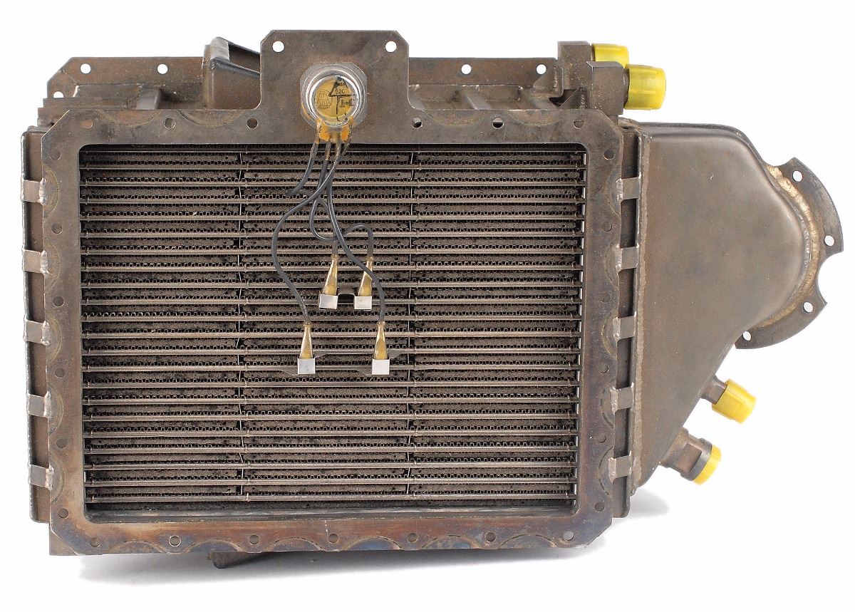 Apollo Command Module (Block II) Environmental Control Unit (ECU) Evaporator, measuring 13 x 8 x 6, stenciled on one side with part numbers, “812582-10 Assy. DWO 93922, SN 41.” In fine condition. One of two evaporators used to cool water-glycol mixture circulated within the Apollo Command Module. The glycol loop removed waste heat from astronaut space suits and supported temperature control of spacecraft atmosphere. Two of these evaporators, one for the primary and the other for the secondary coolant system, are made of special corrosion-resistant stainless steel plates and fin passages for the water-glycol arranged in a series of stacks alternated with sintered felt metal wicks, which were fed water through a plate with tiny holes. Evaporation cooled the plates which in turn cooled the water-glycol passing through, allowing the removal of excess heat at a rate of about 8,000 BTU per hour. A necessity for maintaining comfortable conditions for astronauts as they journeyed through space.
