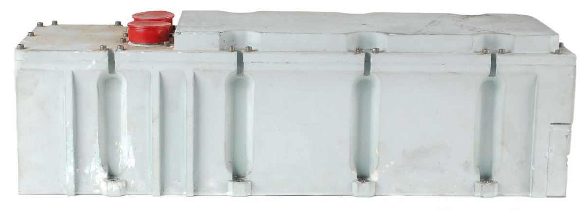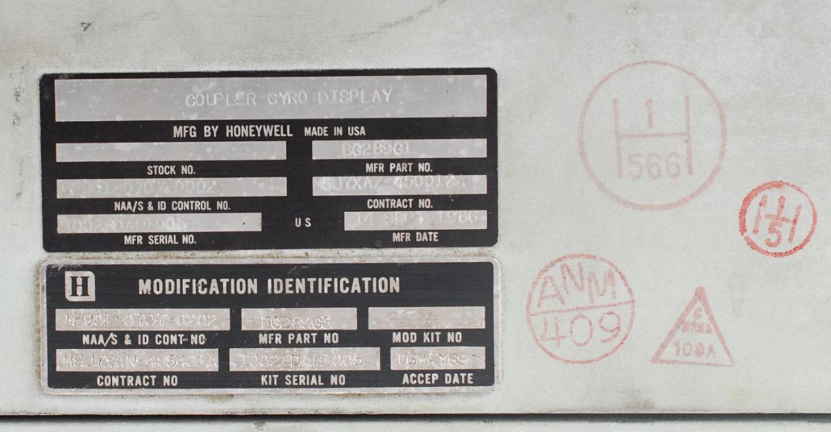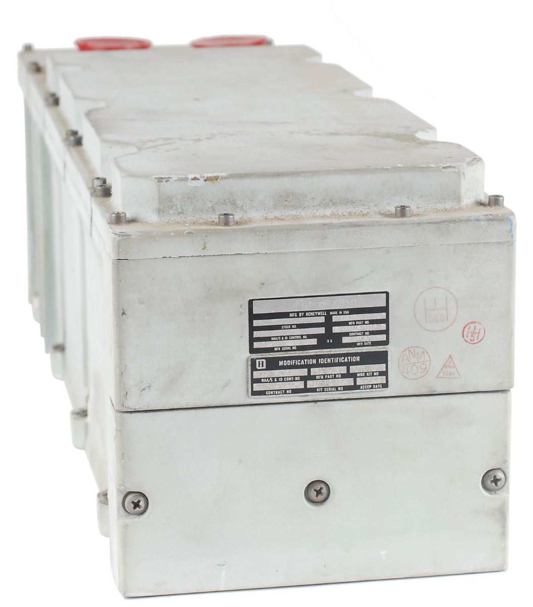 Apollo CM Block II Gyro Display Coupler manufactured by Honeywell, 20 x 6 x 6.5, with an affixed parts label reading, “Coupler Gyro Display, NAA/S & ID Control No. ME901-0707-0002, Mfr Serial No. 10028DAH1005, Mfr Part No. BG281G1, Contract No. M5J7XAZ-450012A, Mfr Date 14 Sept. 1966.” An additional modification tag is affixed below. The unit has a thick gray metal housing with two red-capped ports labeled “J1” and “J2.” Scattered marks, dings, and soiling, otherwise fine condition. Part of the Apollo Command Module Stabilization and Control System, the GDC provided the interface between body rate (roll/yaw/pitch) sensors and panel displays to give an accurate readout of spacecraft attitude relative to a given reference coordinate system. Oversized.
