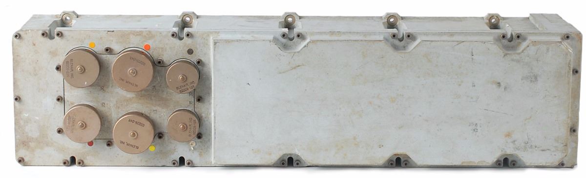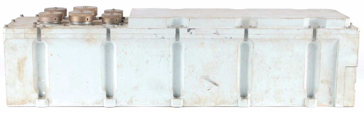 Apollo Command Module Block II Reaction Jet and Engine On-Off Controller (RJ/EC) manufactured by Honeywell, 23.5 x 5.75 x 6, with an affixed parts label reading, “Control Reaction Jet and Engine On-Off, NAA/S & ID Control No. ME901-0706-0402, Mfr Serial No. 10028AAF1023, Mfr Part No. BG287HS, Contract No. N7J7XAH-470005A, Mfr Date 21 Mar 1969.” Scattered marks, dings, and soiling, otherwise fine condition. Part of the Apollo Command Module Stabilization and Control System, the RJ/EC includes solenoid drivers and logic circuits to translate spacecraft computer or manually initiated commands into firing of the Reaction Control System (RCS) attitude control thrusters and the Service Propulsion System main engine. The RCS firings were important to the CM as they allowed adjustment to attitude without affecting the critical accuracy of orbital, trans-lunar, and trans-earth trajectories. Oversized.