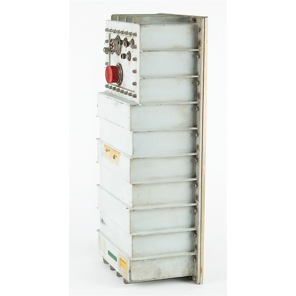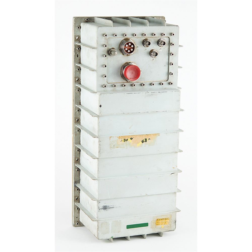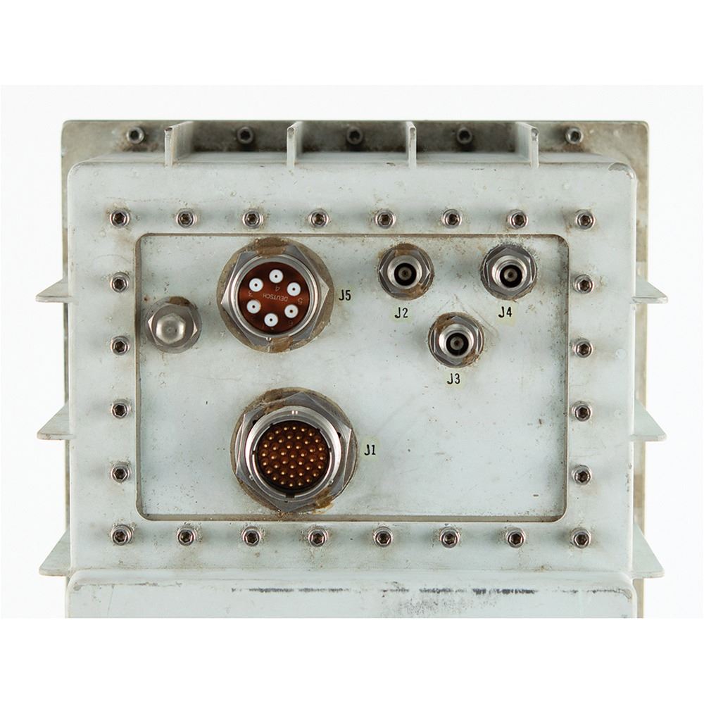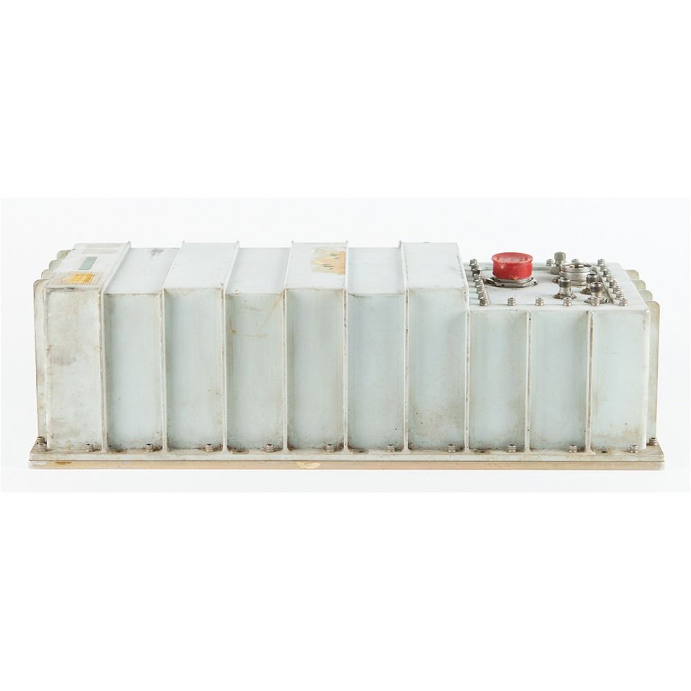 An early Apollo Command Module Block II Unified S-Band transponder manufactured by Motorola, measures 9.5Ë x 21Ë x 6Ë, weighs 31 pounds, with five ‘J’ ports to the top, which also bears an affixed “D.V. Calibration†label numbered “MW 69-117†and dated “Jul 68.†The bottom end bears metal parts tag: “Unified S-Band Equipment, NAA S&ID PN ME 478-0070-0002, Stock No. PP2, Contract No. NAS 9-150, Date of Mfr. 7/26/66, Mfd. by Motorola for the Apollo Spacecraft.†In fine condition, with scattered scuffs and wear.