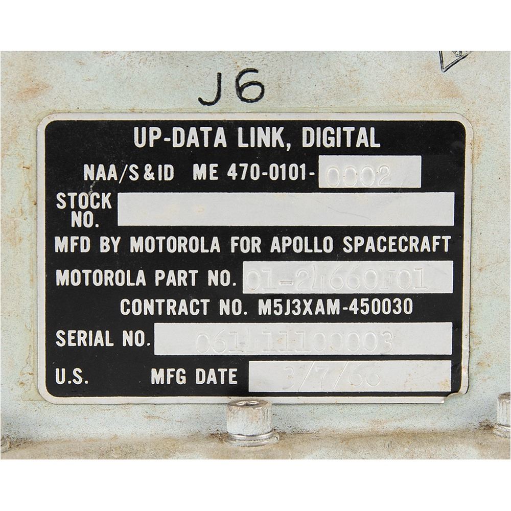 Apollo Command Module (Block II) Up-Data Link (UDL) equipment manufactured by Motorola, measuring approximately 9″ x 17.5″ x 6.5″, with a tag on the end reading: "Up-Data Link, Digital, NAA/S & ID ME470-0101-0002…Mfd by Motorola for Apollo Spacecraft, Motorola Part No. 01-24660F01, Contract No. M5J3XAM-450030, Serial No. 061411100003, Mfg Date 3/7/66." The unit is labeled "C28-1A103†on the top, and features connectors “J1†through “J5†on top, and another, “J6,†on the side. In very good to fine condition, with overall wear and soiling.