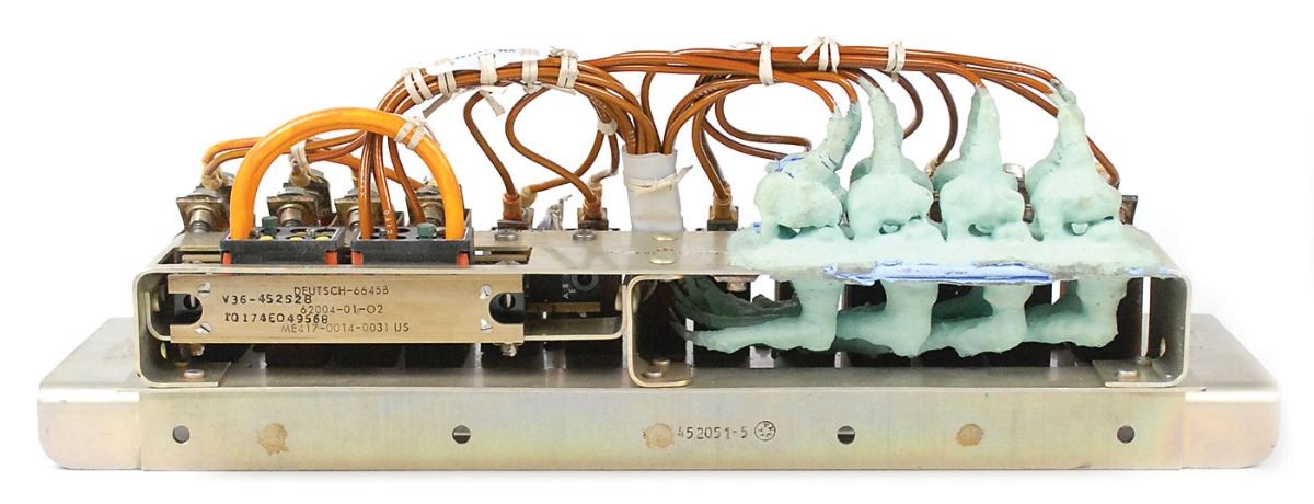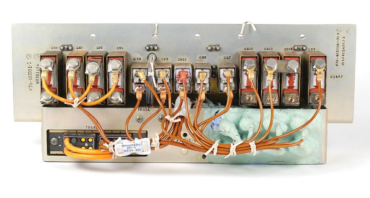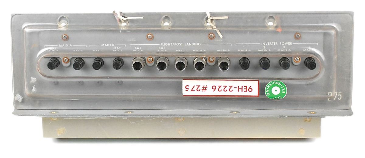 Apollo-era Command Module breaker panel. This production representative for flight application panel measures 16 x 7.5, retains its internal components, and is numbered “275,” in the lower right corner. Panel has 13 circuit breakers divided into four categories: “Main A,” “Main B,” “Flight/Post Landing,” and “Inverter Power.” This panel would be located in the lower equipment bay of the Command Module. In fine condition. Oversized.