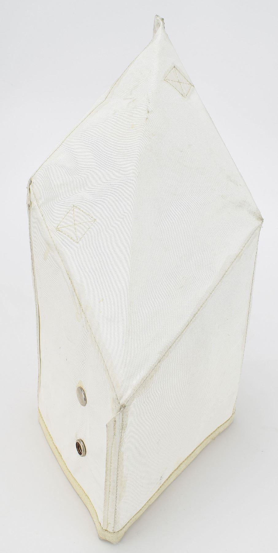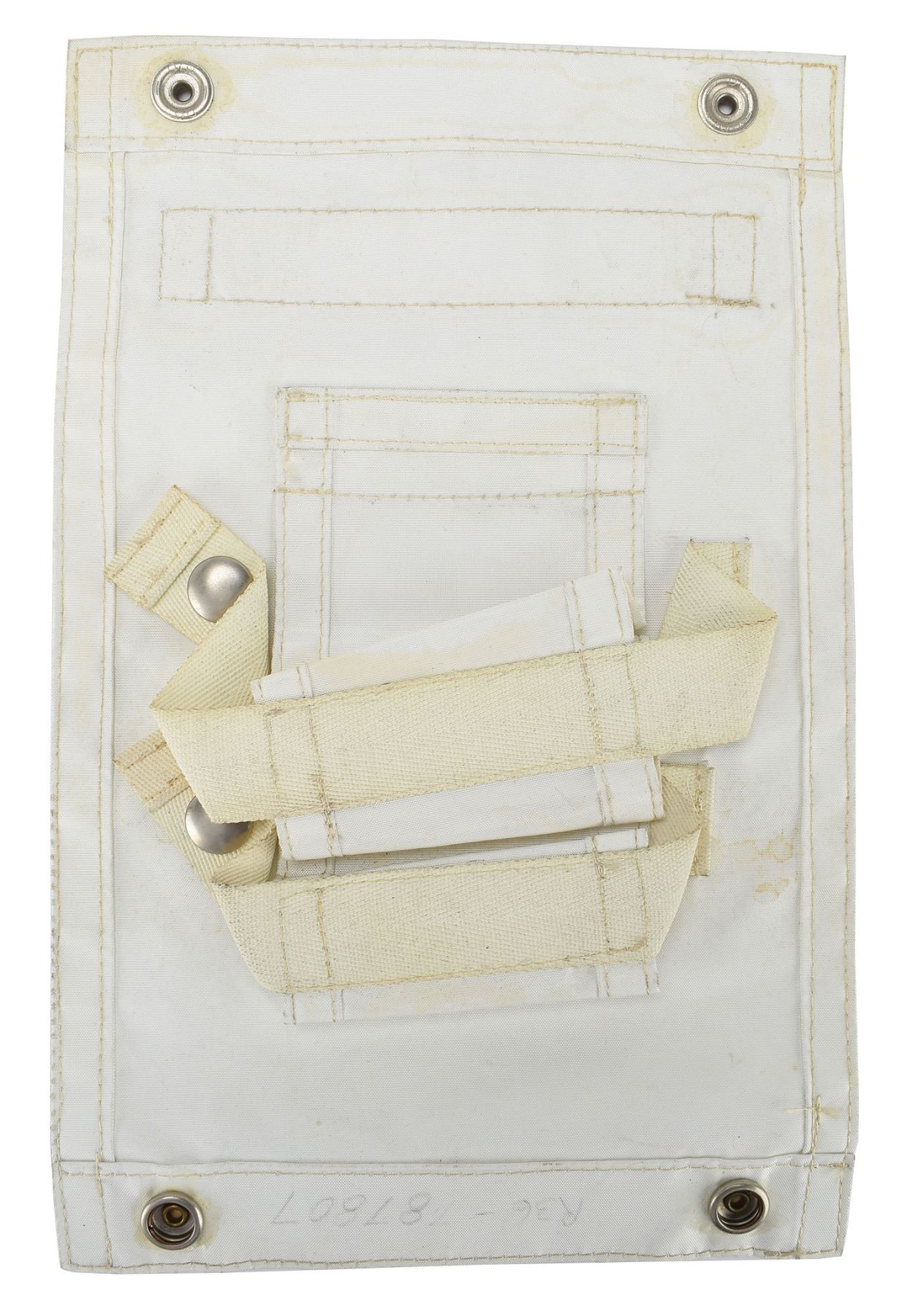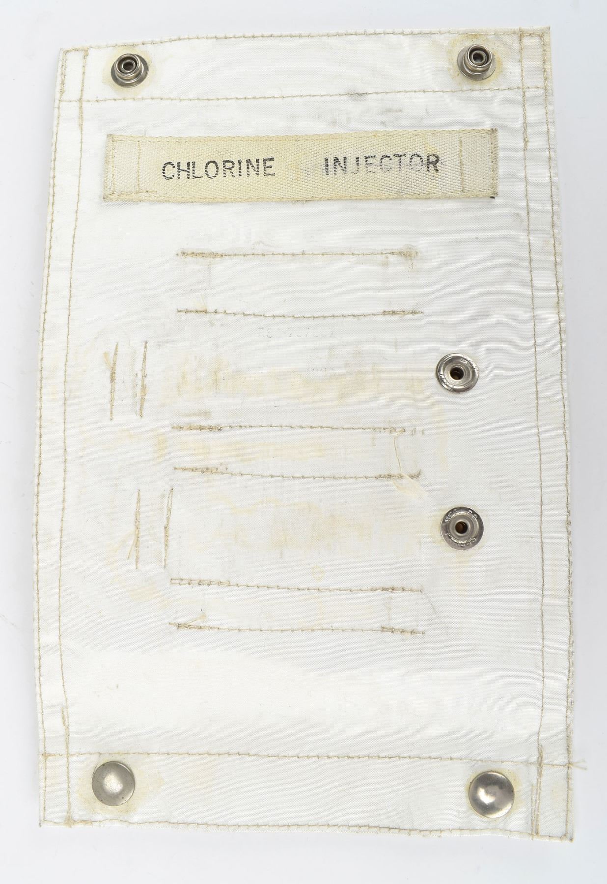 Two Apollo Command Module developmental Beta cloth bags: one 7? x 11? Beta cloth panel marked "Chlorine Injector," with two snap-secured pouches on the reverse; and one somewhat irregularly shaped unmarked Beta cloth bag, measuring approximately 9? x 9? x 13? when open, featuring an angled diamond-shaped upper panel. In overall very good condition, with scattered soiling.