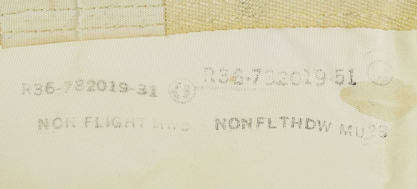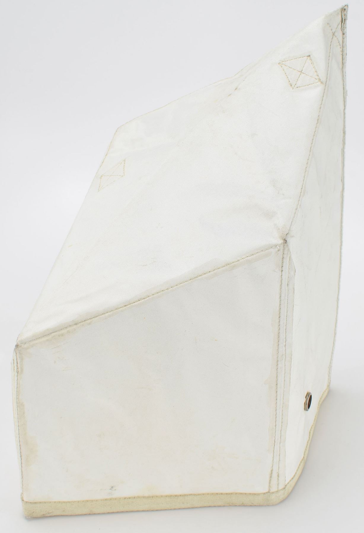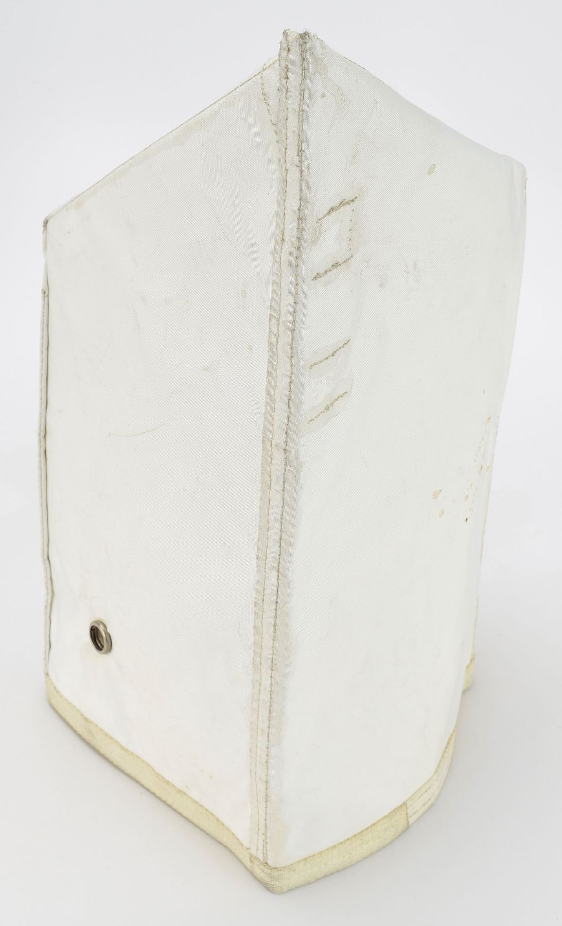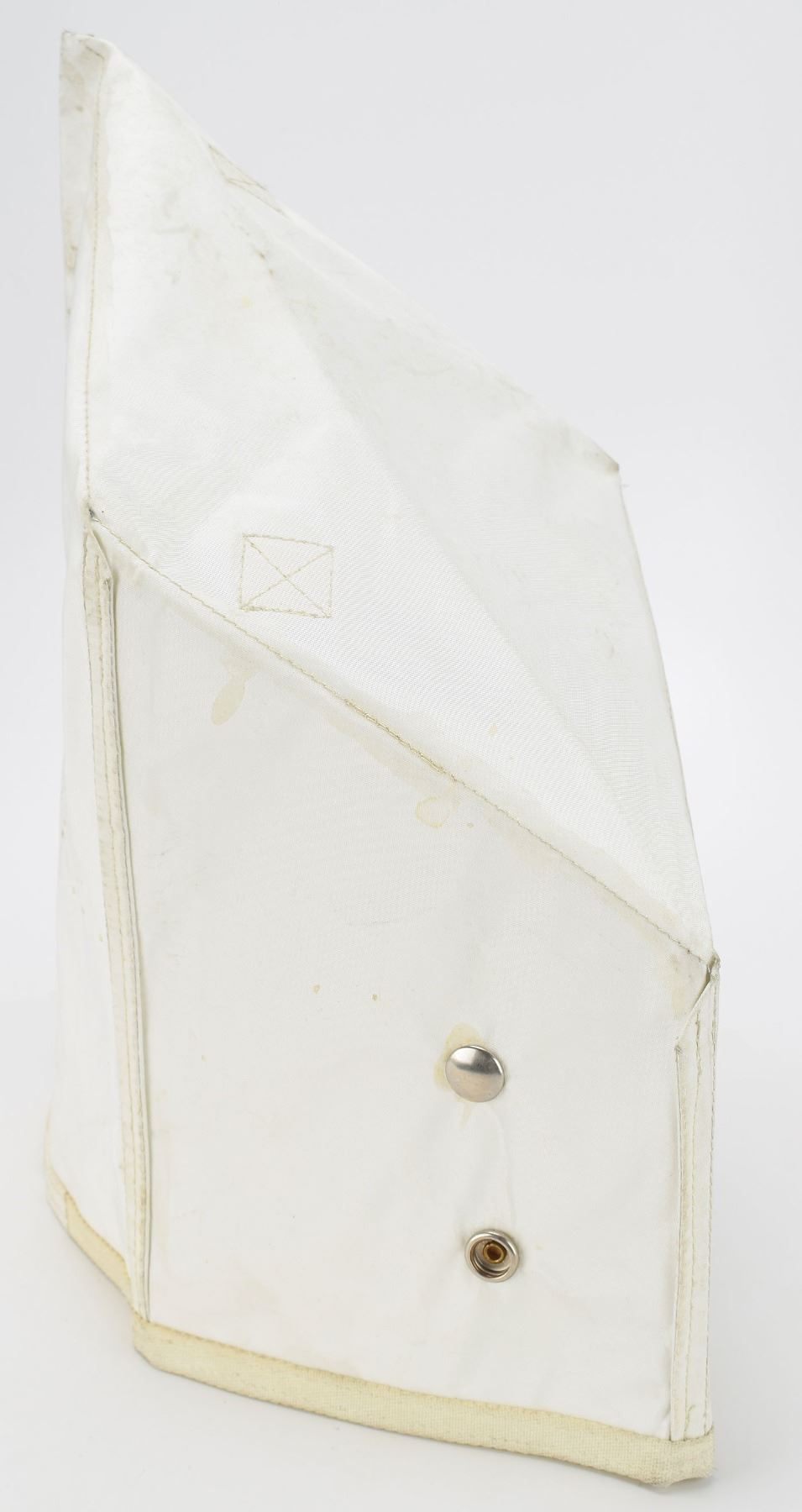 Two Apollo Command Module developmental Beta cloth bags: one 7? x 11? Beta cloth panel marked "Chlorine Injector," with two snap-secured pouches on the reverse; and one somewhat irregularly shaped unmarked Beta cloth bag, measuring approximately 9? x 9? x 13? when open, featuring an angled diamond-shaped upper panel. In overall very good condition, with scattered soiling.