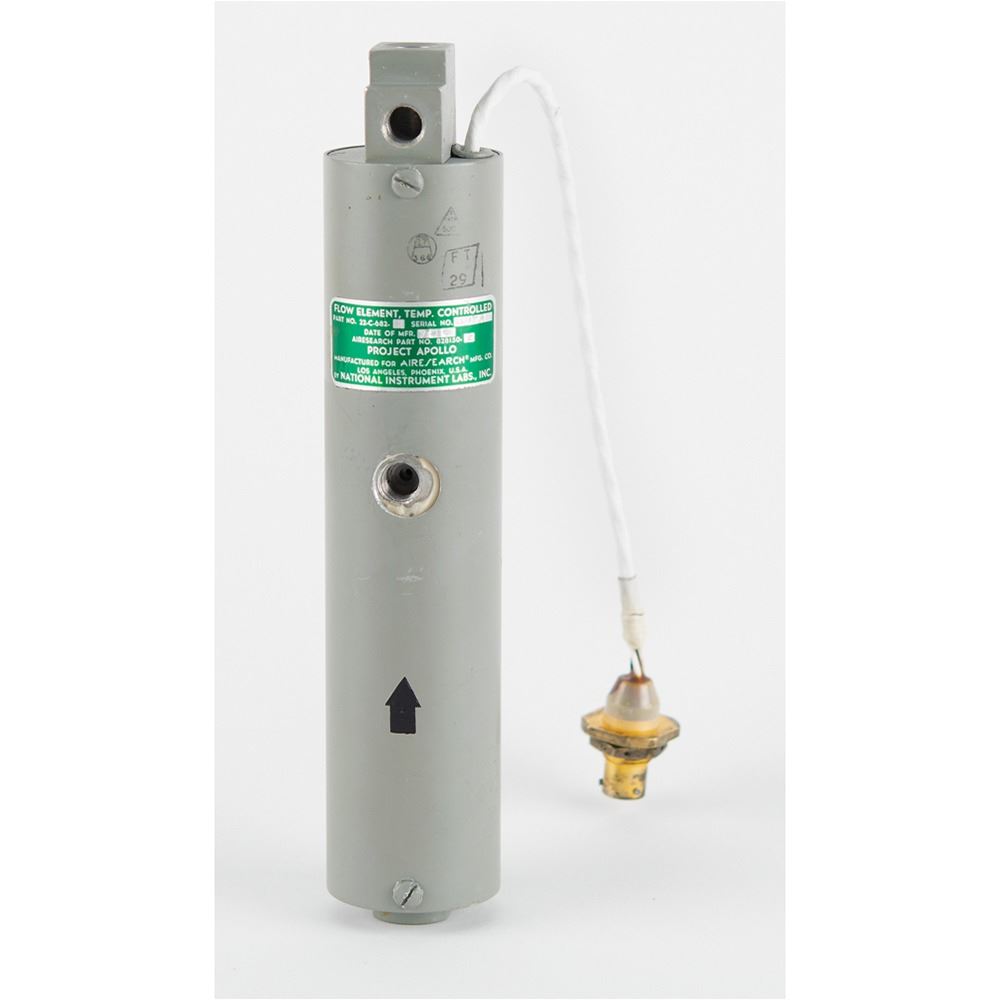 Temperature control flow element associated with the Apollo Command Module (Block I) Environmental Control System (ECS), measuring 9Ë long and 1.75Ë in diameter, with a green Airesearch label on the body: "Flow Element, Temp. Controlled, Part No. 22-C-682-2, Serial No. 2399-A, Date of Mfr. 7 21 65, Airesearch Part No. 828150-2, Project Apollo." The unit retains its white cord with four-pin connector. In fine condition.