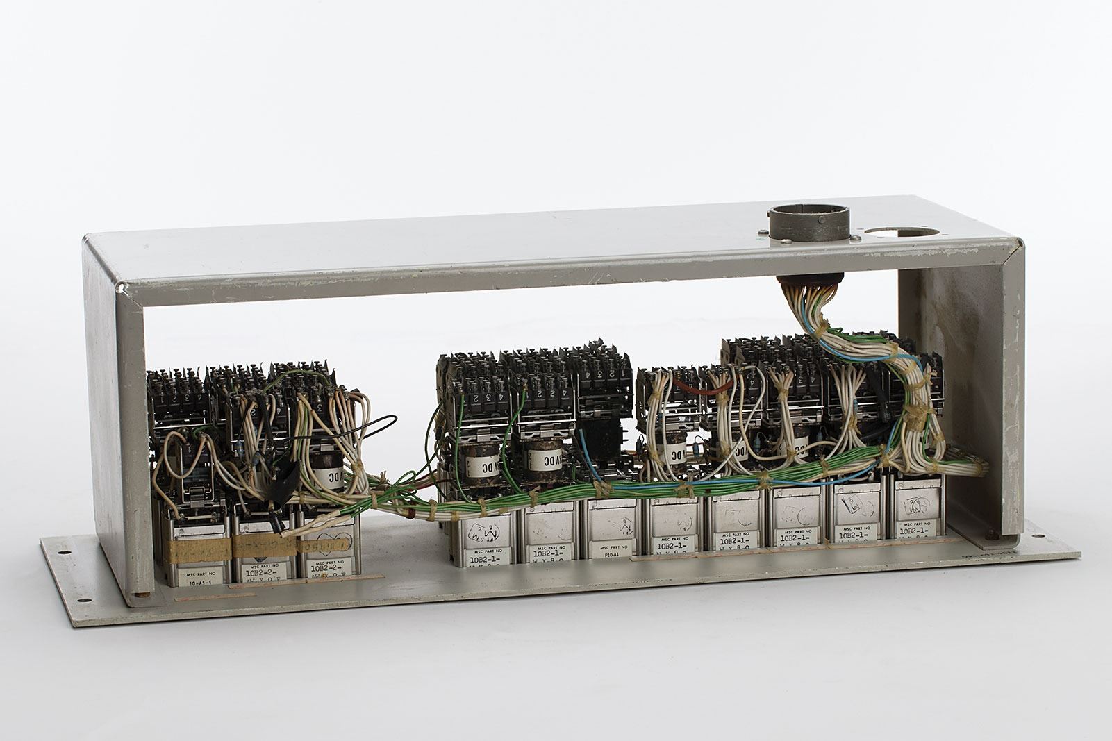 Apollo Command Module Flight Simulator Camera Control Panel used to simulate flight conditions as the crew trained, measuring 19? x 7? x 6?, with the front of the panel labeled, "Camera Control Panel." The backlit buttons are divided into sections: "C/M Window" (with buttons for "Earth," "Stars," and "Earth/Stars Matted"); "C/M Telescope" (with buttons for ""Earth," "Stars," and "Earth/Stars Matted"); "TV Control Console" (with buttons for "Earth," "Stars," "Earth/Stars Matted," "Window Monitor (On-Line)," "Ready," and "SCT Monitor (On-Line)"); and "Test" (with buttons for "Window Monitor," "Telescope Monitor," "TV Console Monitor," "Matting Ampl Ch. 2," "Matting Ampl Ch. 1," "Earth Lights On," and "Earth Lights Off"). Additional buttons are marked "Stand-By (Test)," "C/M Operate," and "Clear." In fine condition, with one button missing.
