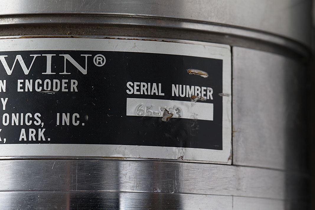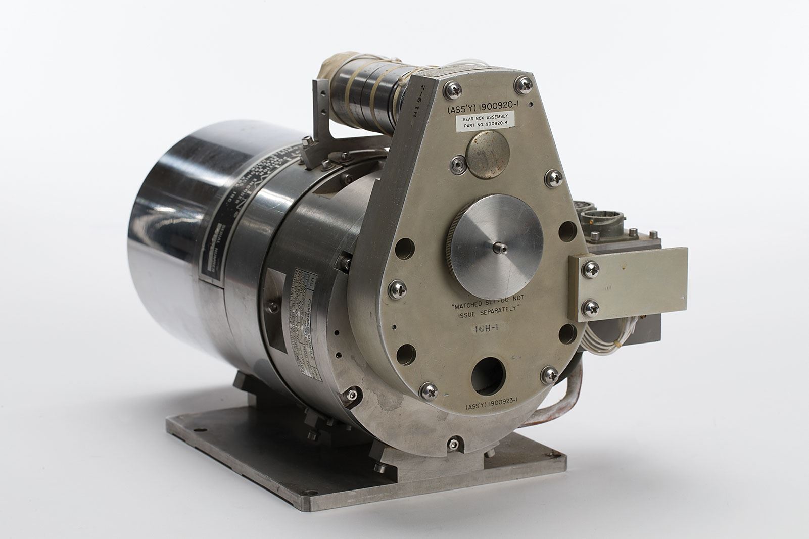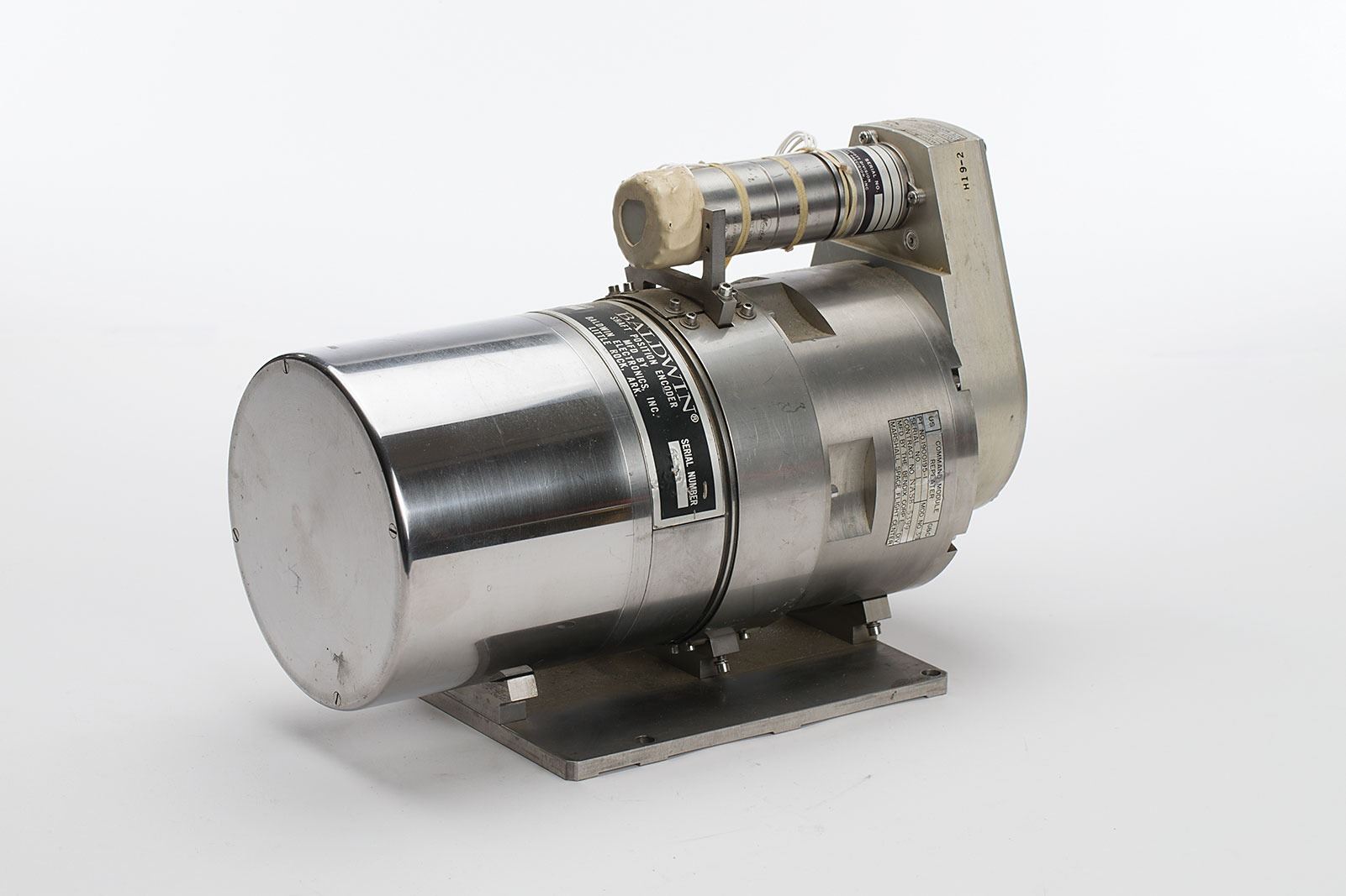 Apollo Command Module Flight Simulator Repeater, measuring 12? x 8.5? x 8? and weighing 37 pounds, with a Marshall Space Flight Center/Bendix Corp. label on the side, reading: "Command Module Repeater, Pt No. 1900195-1, Mod No. 34, Serial No. 1, Contract No. NAS8-5399." The main cylinder has an additional Baldwin tag, reading: Shaft Position Encoder, Model Number 511CB, Serial Number 65-753." The smaller cylinder above bears a Kearfott label, identifying "Part No. CT20352001, Mtr. Gen. Ghd., Serial No. 9." In fine condition.