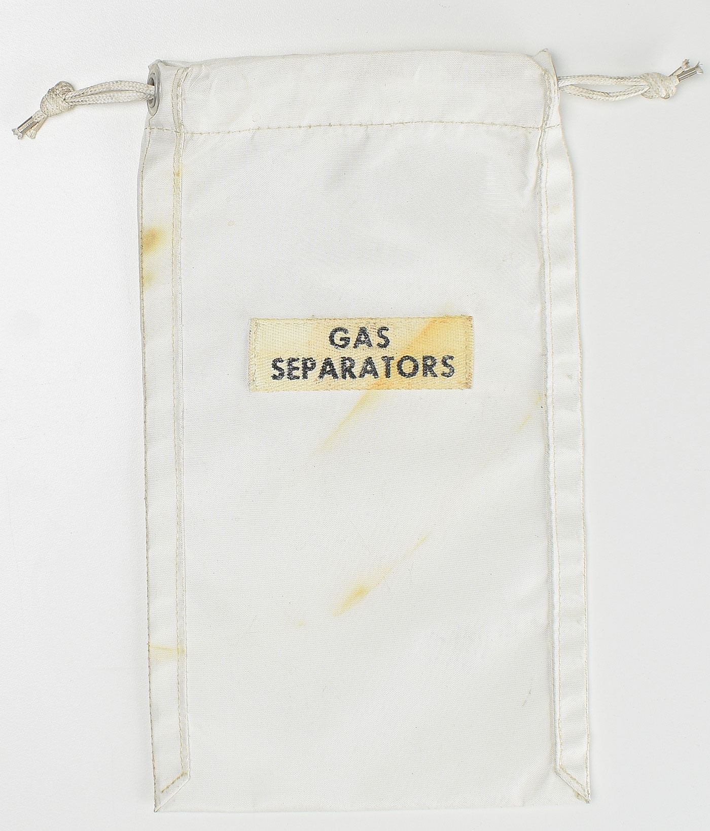 Apollo Command Module Beta cloth drawstring pouch labeled "Gas Separators" on the front, measuring 6? x 10.25?, marked on the reverse with the part number, "V36-784013-51." The interior is also marked "06362-AAJ3312, V36-784013-51." In very good to fine condition, with scattered staining.