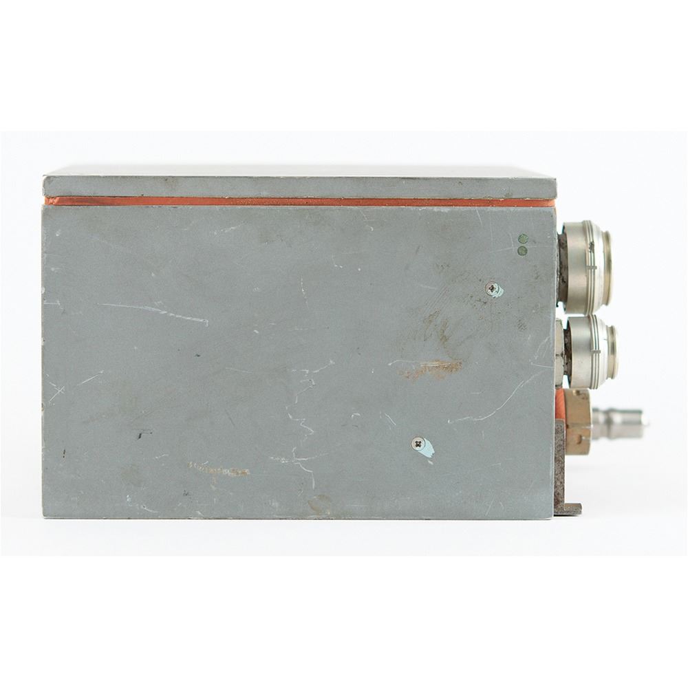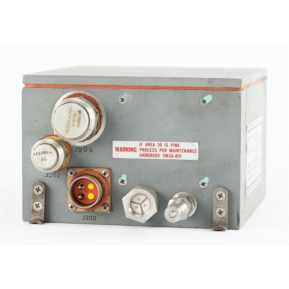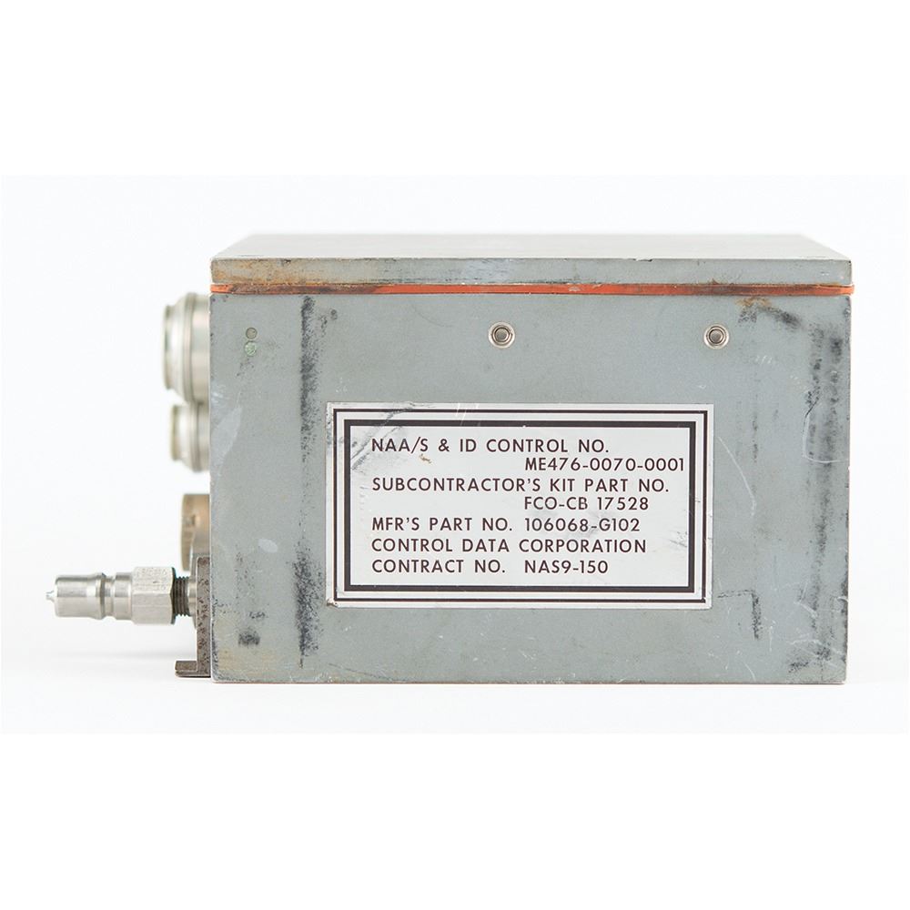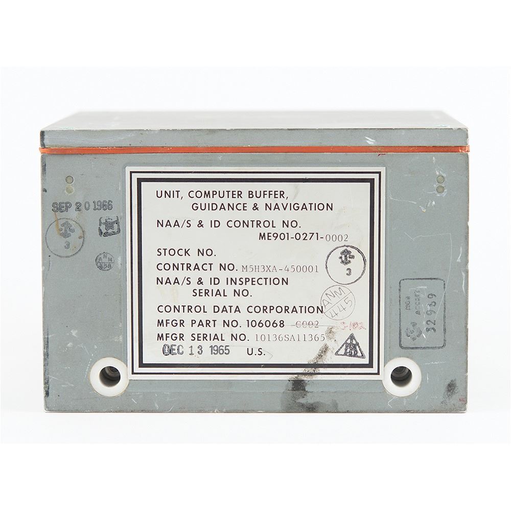 Apollo CM Guidance and Navigation Computer Buffer Unit, measuring 6Ë x 4Ë x 6Ë, bearing a large Control Data Corporation affixed to the reverse: "Unit, Computer Buffer, Guidance & Navigation, NAA/S & ID Control No. ME901-0271-0002, Contract No. M5H3XA-450001…Part No. 106068-C002, Mfgr Serial No. 10136SA11365, Dec. 13 1965." The opposite side has three connection ports labeled "J200," "J202," and "J203." In fine condition. The Computer Buffer Unit was part of a system of pre-flight ground check out equipment to confirm the Apollo Guidance Computer (AGC) was fully operational for the lunar mission.