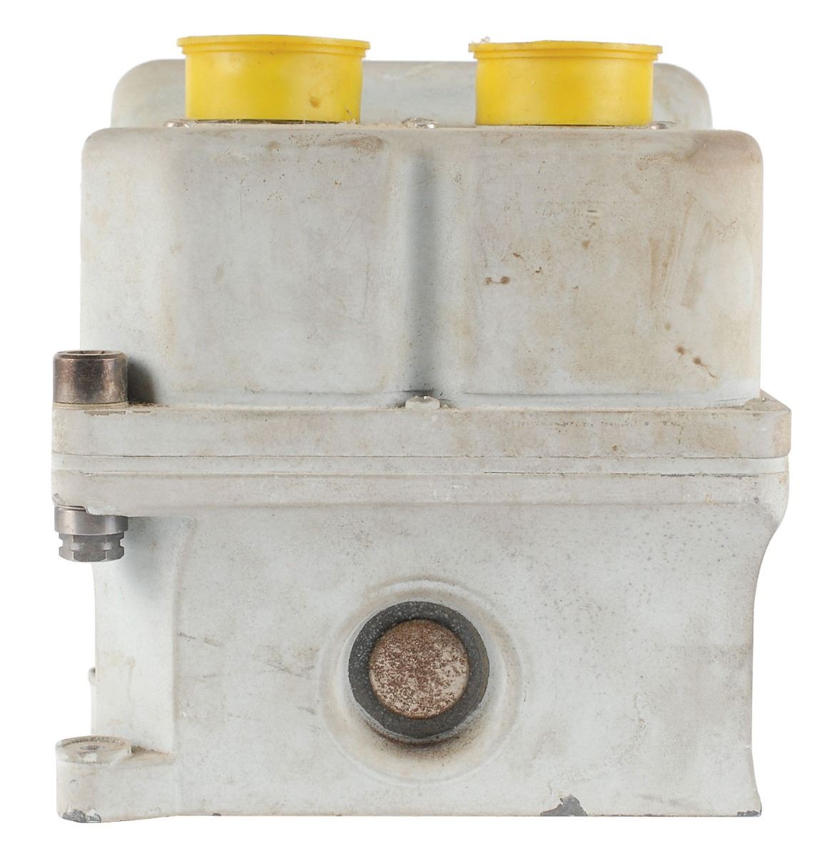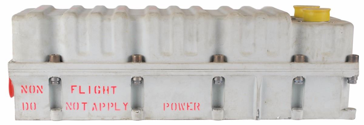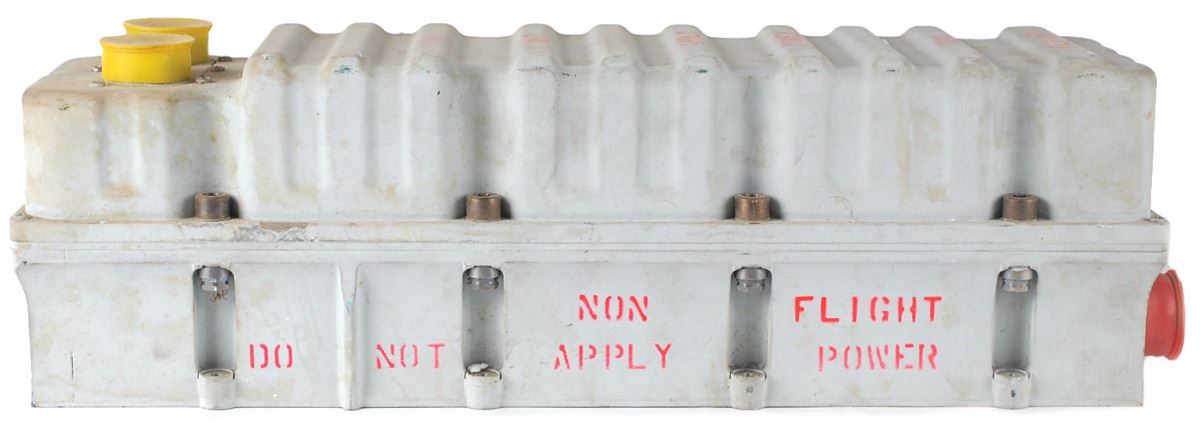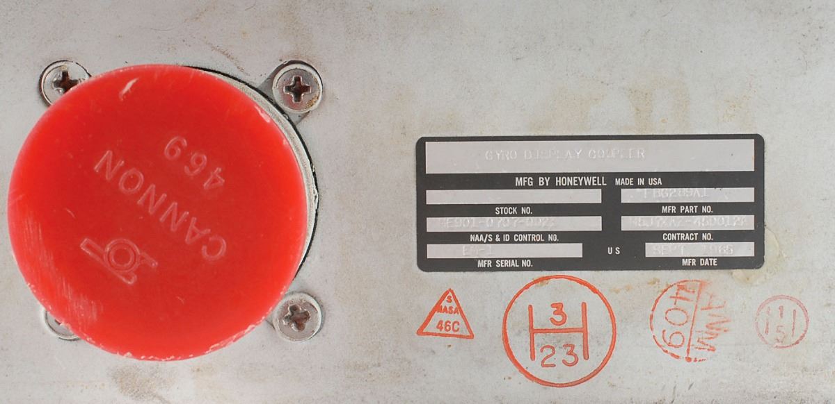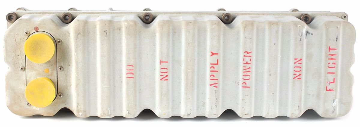Apollo Command Module Gyro Display Coupler manufactured by Honeywell, 19.25 x 6 x 6, with an affixed parts label reading, “Gyro Display Coupler, NAA/S & ID Control No. E901-0707-0021, Mfr Serial No. EM-1, Mfr Part No. FBG289A1, Contract No. M5J7XAZ-450012A, Mfr Date Sept. 1965.” The unit has a thick gray metal housing stenciled in red, “Non Flight, Do Not Apply Power,” with a red-capped output near the parts label and two yellow-capped inputs on the top of the opposite end. Scattered marks, dings, and soiling, otherwise fine condition. The Gyro Display Coupler was used to give a reading of the spacecraft's actual attitude compared to its intended altitude, allowing the crew to maneuver and stay on course.