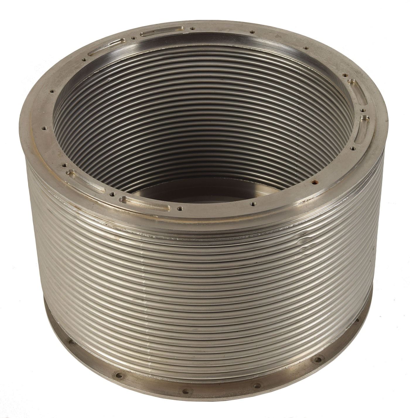 Apollo Optical Unit sextant bellows assembly, approximately 11? in diameter and 6.75? in height, made of stainless steel and consisting of a doubled ring wall, with part and manufacturing numbers stamped into lower base ring, "Flexonics 107921, A. C. Spark Plug 1899952, Serial No. 83B5603," and dated "8–26–63." In fine condition. This bellows was used to form a seal between the Apollo Optical Unit Assembly sextant side and the Command Module wall. Isolating the optical unit from structural stress, the bellows' flexibility slowed for slight changes in the Command Module wall as the pressure changed from earth atmospheric to space vacuum. An integral part of the Apollo Optical Unit sextant, which allowed astronauts to update the IMU's settings based on sightings of stars and planets.