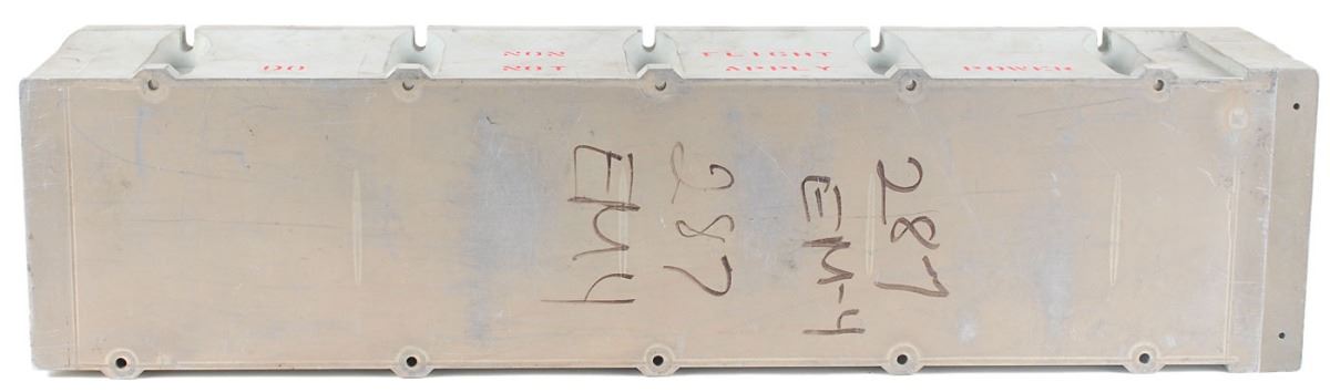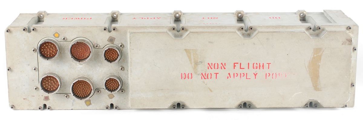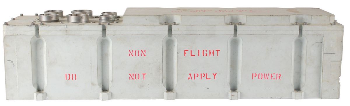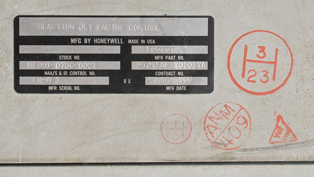 Early Apollo Command Module Reaction Jet Controller manufactured by Honeywell, 23.5 x 6 x 6, with an affixed parts label reading, “Reaction Jet Engine Control, NAA/S & ID Control No. ME901-0706-0021, Mfr Serial No. EM-4-1, Mfr Part No. FBG287B1, Contract No. M7J7XAF-205017A, Mfr Date Mar 1966.” The unit has a thick gray metal housing stenciled in red, “Non Flight, Do Not Apply Power,” with four connection ports on the top. Scattered dings, soiling, and toned adhesive remnants, otherwise fine condition. Oversized.