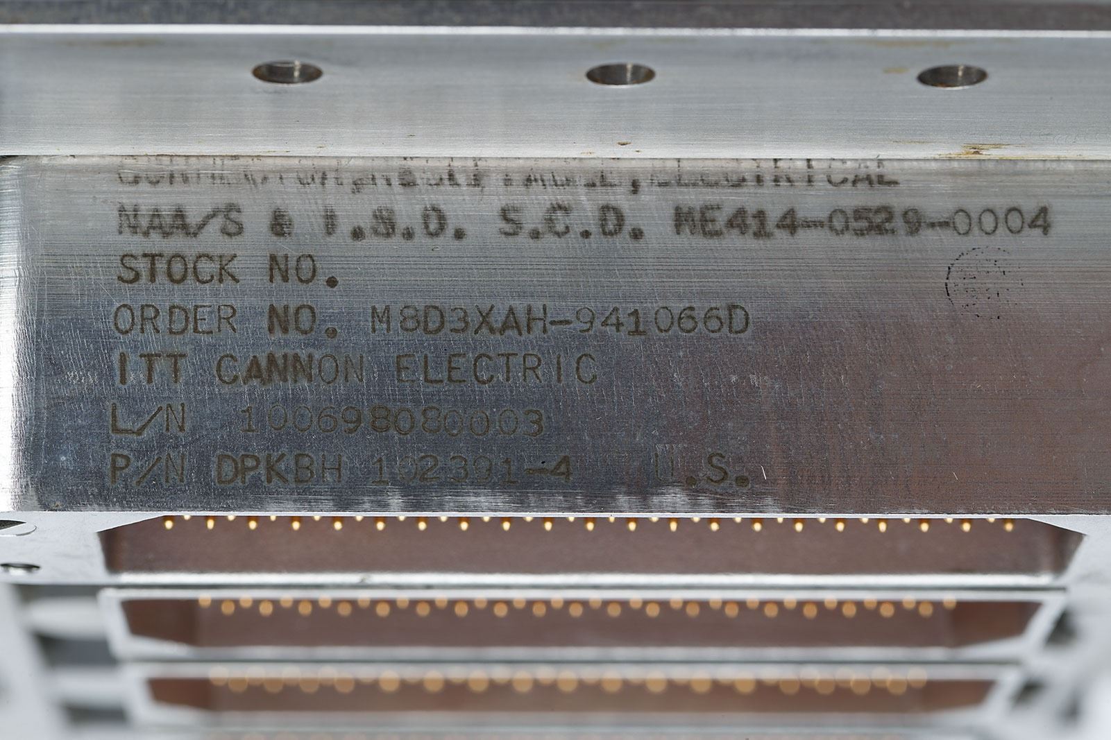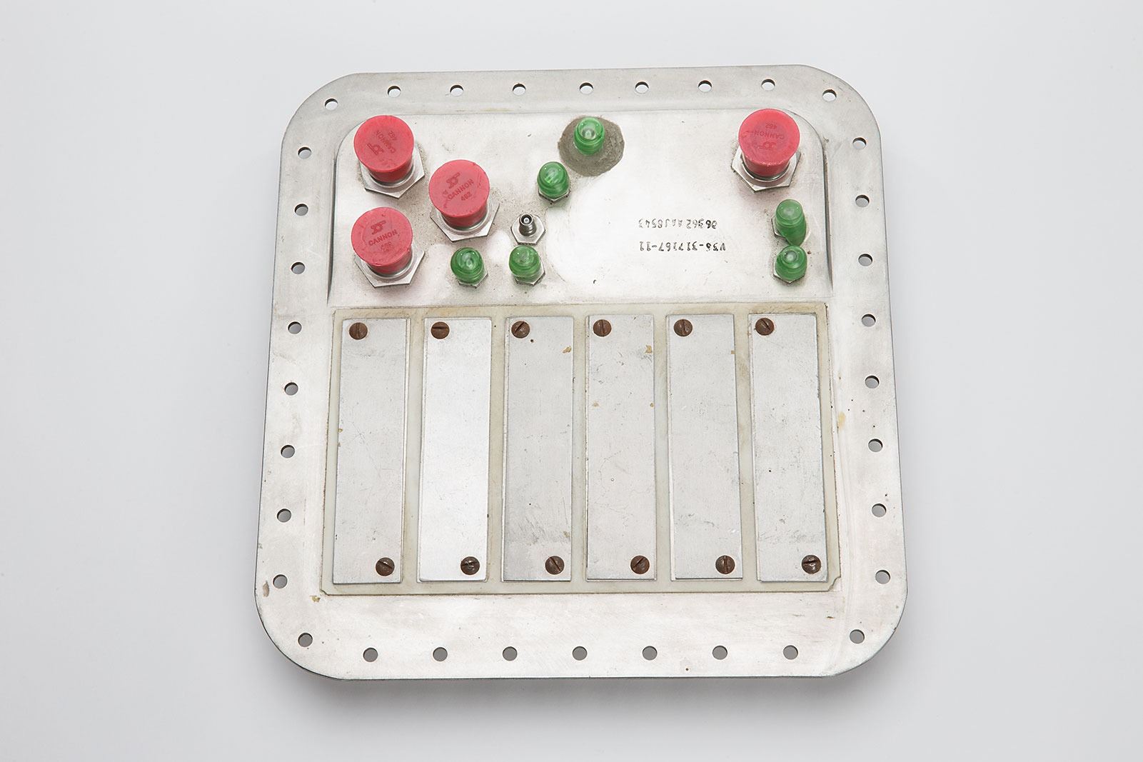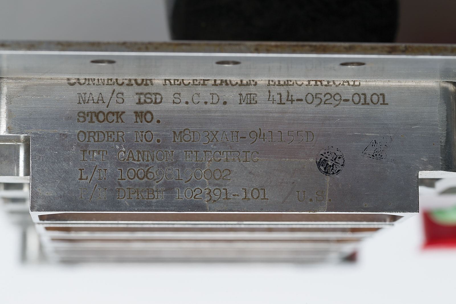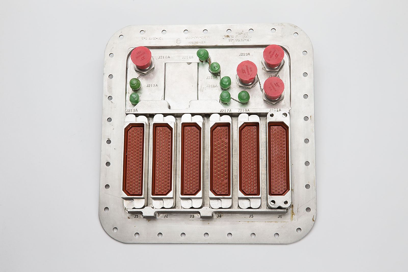 Apollo CM/SM Umbilical Disconnect, measuring 9.75? x 10? x 2?, marked on the front: "V36-317167-11, 06362AAJ8543." The panel has several ports capped with green rubber domes and red plastic caps, and six electrical ports covered with metal blanks. The panel incorporated connections between the Command Module and Service Module that were pyrotechnically separated just prior to CM Earth reentry. In fine condition.