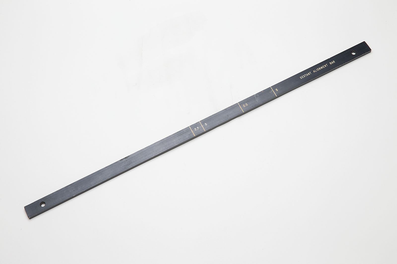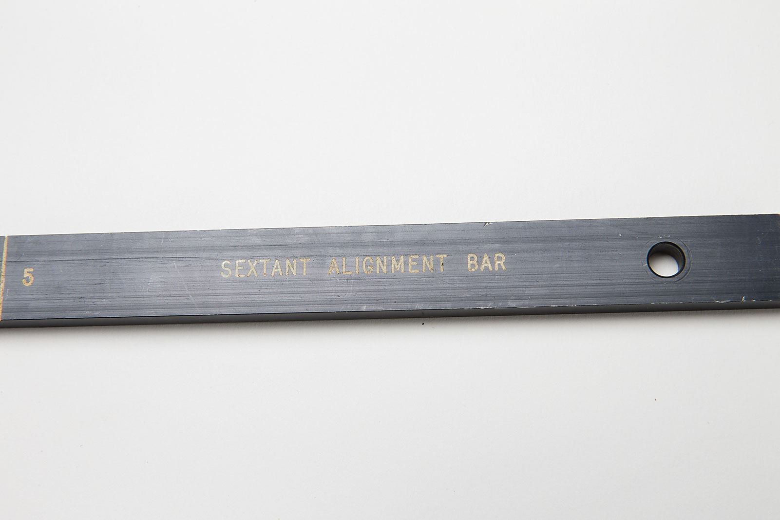 Apollo CM sextant alignment bar, measuring 22.5? x .75? x .25?, marked in white text, "Sextant Alignment Bar," with alignment lines and numbers "2.5" and "5." The slim black metal bar has mounting holes at each end. In fine condition.