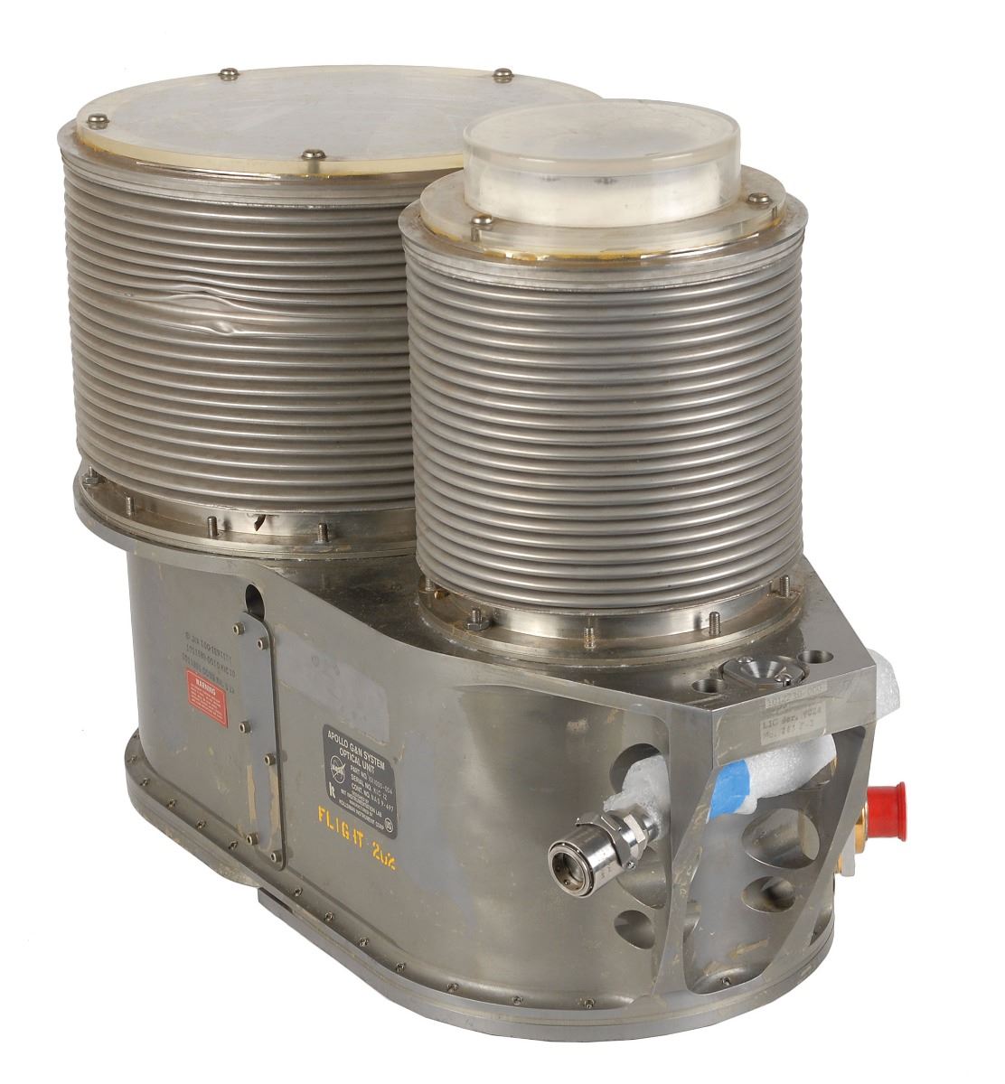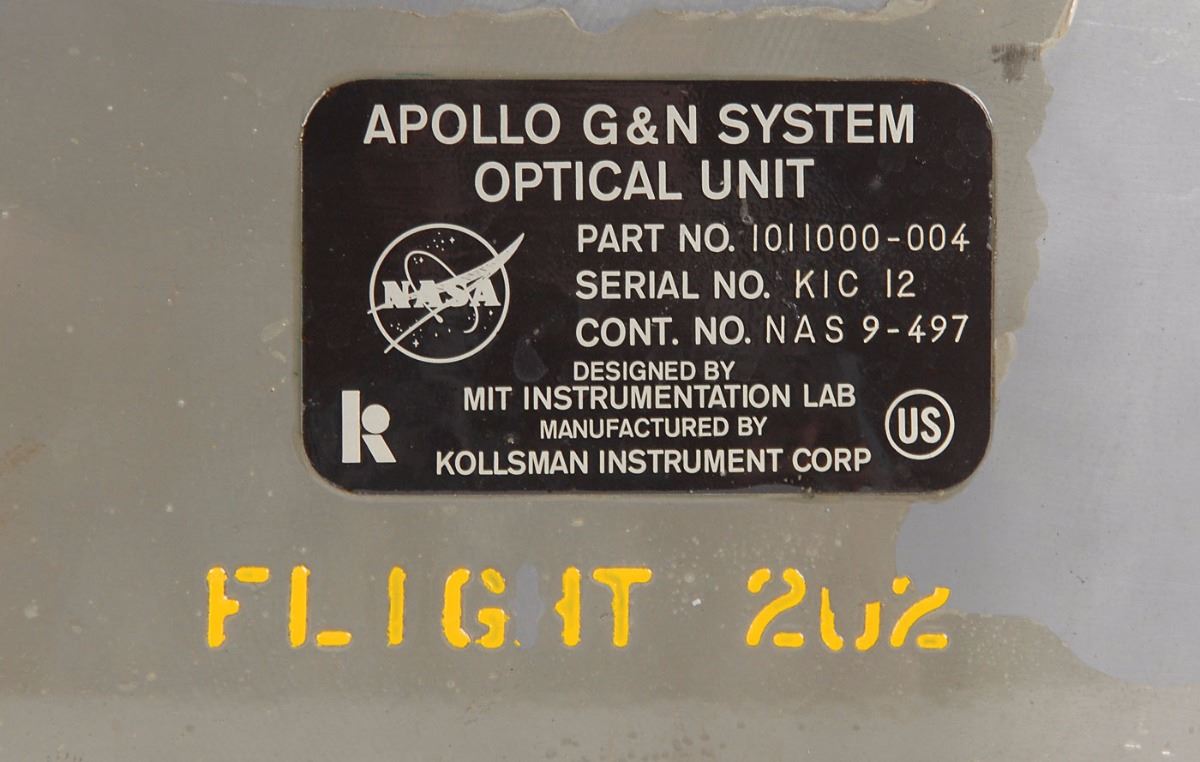 Exceptional Apollo CSM sextant presumed flown by consignor on the unmanned AS-202 mission on August 25, 1966, measuring 22 x 11 x 14, bearing a parts tag on the main metal housing, reading: “Apollo G&N System Optical Unit, Part No. 1011000-004, Serial No. KIC 12, Cont. No. NAS 9-497, Designed by MIT Instrumentation Lab, Manufactured by Kollsman Instrument Corp.” Below the tag is the yellow text designating the piece as flight hardware, “Flight 202.” In fine condition, with the main sextant mirror having been re-silvered by the original contractor as it had been heat-damaged in re-entry.
