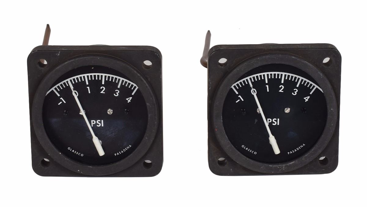 Pair of Apollo Command Module (Block I) differential pressure gauges, measuring 2.25 x 2.25 x 1.5, manufactured by the Glassco Instrument Co., both bearing green labels identifying them as "P/N G-3877" and "NASA P/N 20M32076," with manufacture dates of November 1966. In overall fine condition. These pressure gauges were installed in the docking tunnel to provide the crew with awareness of pressure difference between the Apollo capsule interior and the exterior of the forward hatch.