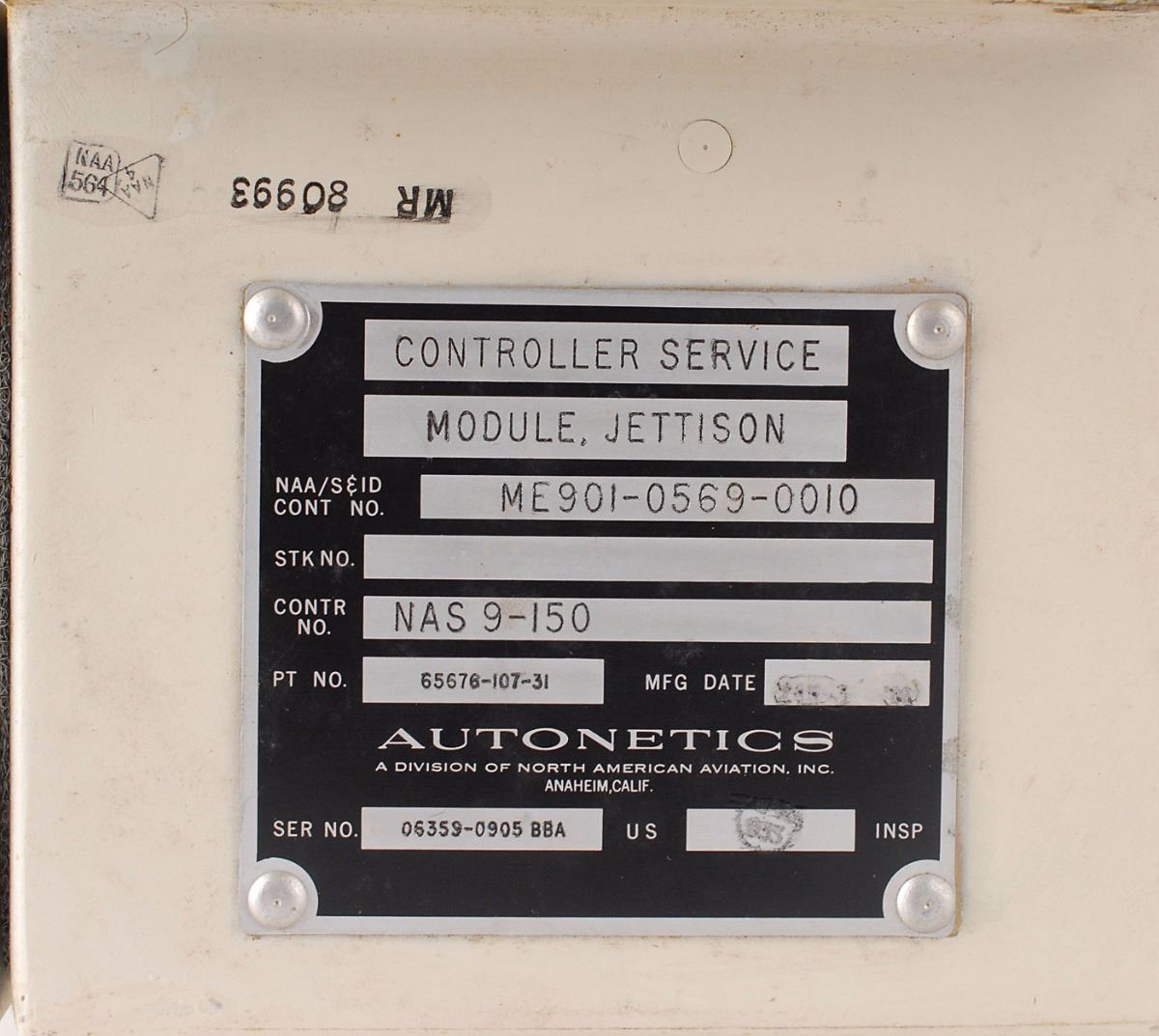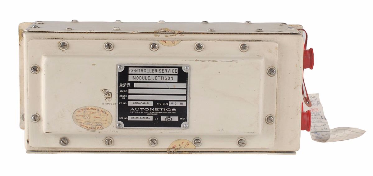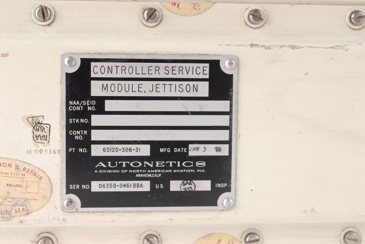 Apollo Service Module (CSM) Jettison Sequence Controller (Block I configuration), 13.5 x 5 x 5.5, manufactured by Autonetics and bearing an identification plaque on the top panel, reading: “Controller Service Module, Jettison, Pt. No. 65120-306-31, Mfg Date Jan 3 ’66, Ser No. 06359-0461BBA.” Another plaque attached to the side notes additional information including “NAA/S&ID Cont No. ME901-0569-0010, Contr No. NAS 9-150, Pt No. 65676-107-31, er No. 06359-0905BBA.” The opposite side has four connectors covered with red caps, labeled “J1,” “J2,” “J3,” and “J4.” An Autonetics modification and repair label is affixed to the top panel, which also bears two broken inspection seals on the sides. A North American Aviation parts tag is also tied to the piece through one of the bolt holes. In fine condition, with scattered dings and soiling. The Jettison Sequence Controller, mounted in the Service Module, automated firing of the Service Module roll R-4D reaction control system thrusters at the correct time and sequence during separation from the Command Module (just prior to CM reentry). Retro-firing of the R-4Ds opened the distance between the CM and SM to prevent re-contact/collision.