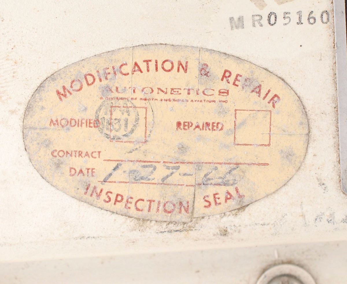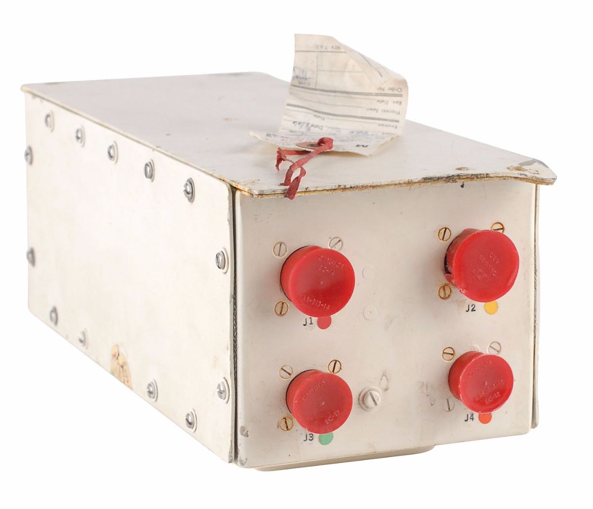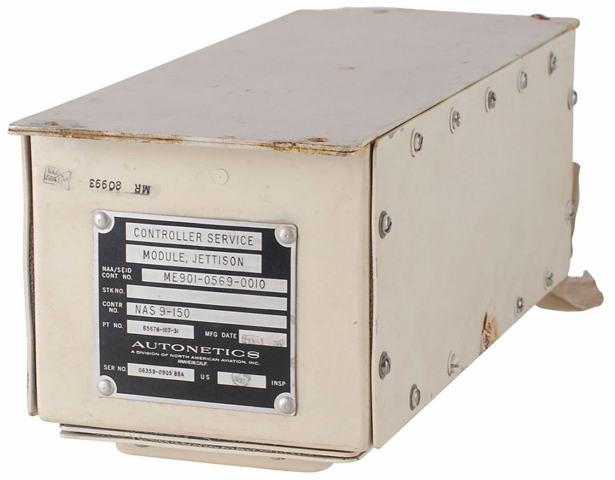Apollo Service Module (CSM) Jettison Sequence Controller (Block I configuration), 13.5 x 5 x 5.5, manufactured by Autonetics and bearing an identification plaque on the top panel, reading: “Controller Service Module, Jettison, Pt. No. 65120-306-31, Mfg Date Jan 3 ’66, Ser No. 06359-0461BBA.” Another plaque attached to the side notes additional information including “NAA/S&ID Cont No. ME901-0569-0010, Contr No. NAS 9-150, Pt No. 65676-107-31, er No. 06359-0905BBA.” The opposite side has four connectors covered with red caps, labeled “J1,” “J2,” “J3,” and “J4.” An Autonetics modification and repair label is affixed to the top panel, which also bears two broken inspection seals on the sides. A North American Aviation parts tag is also tied to the piece through one of the bolt holes. In fine condition, with scattered dings and soiling. The Jettison Sequence Controller, mounted in the Service Module, automated firing of the Service Module roll R-4D reaction control system thrusters at the correct time and sequence during separation from the Command Module (just prior to CM reentry). Retro-firing of the R-4Ds opened the distance between the CM and SM to prevent re-contact/collision.