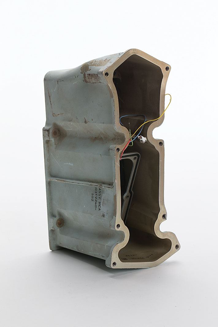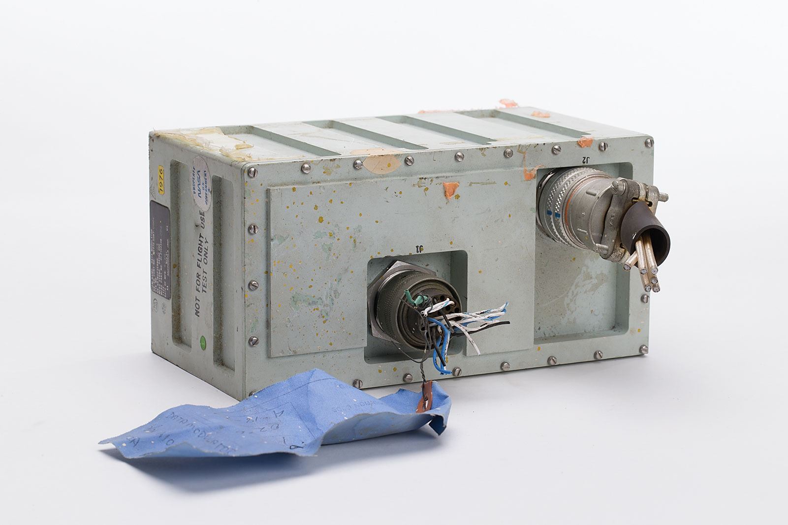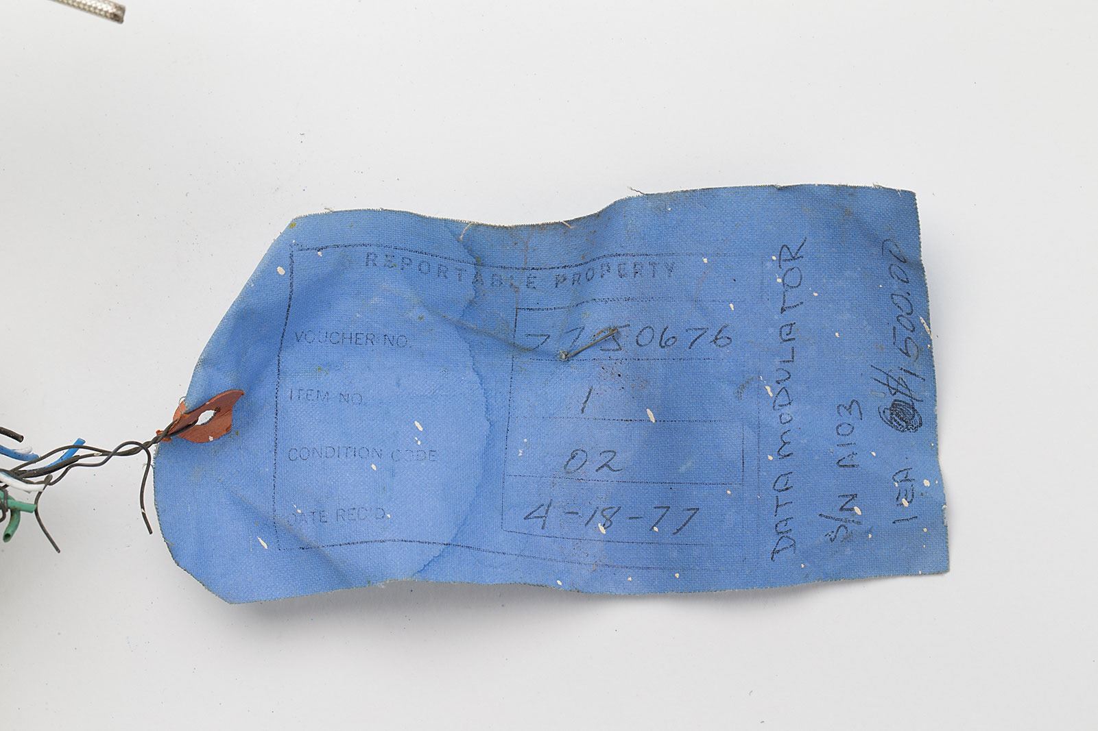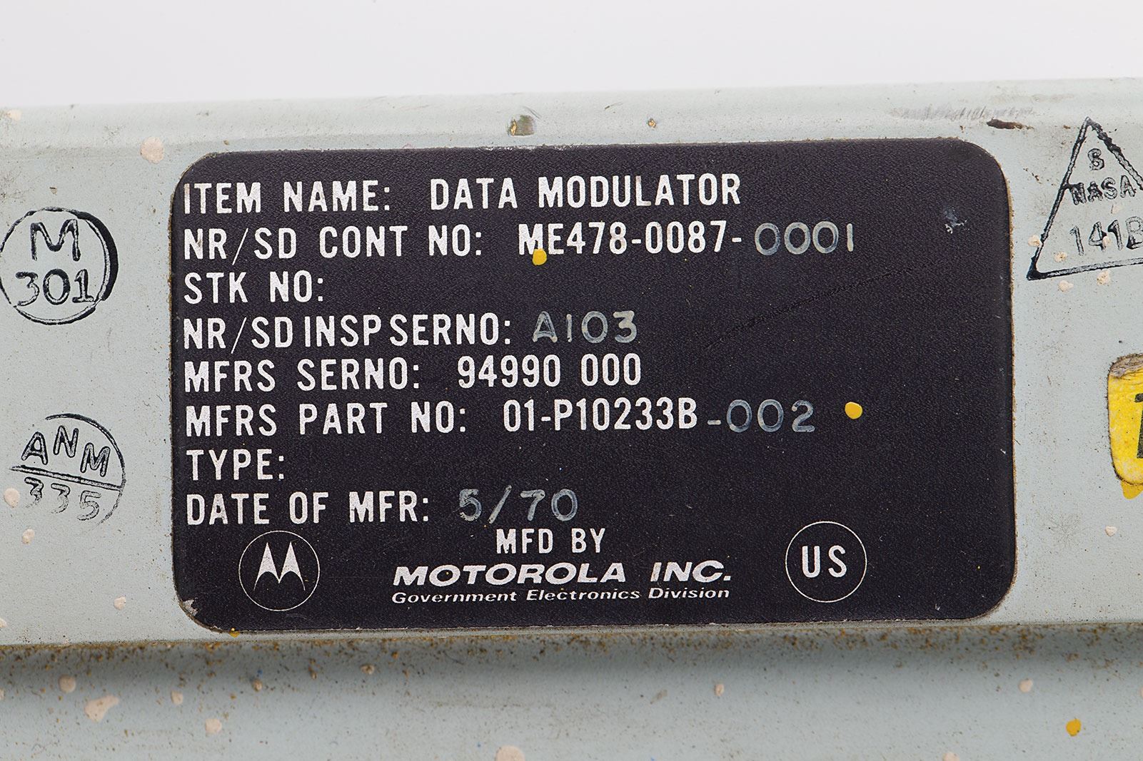 Apollo CSM Data Modulator (Block II version), measuring 4.25? x 4.75? x 8.25?, with a Motorola tag on one end, reading: "Item Name: Data Modulator, NR/SD Cont No: ME478-0087-0001…NR/SD Insp Serno: A103, Mfrs Serno: 94990 000, Mfrs Part No: 01-P10233B-002…Date of Mfr: 5/70." The unit is marked, "Not For Flight Use, Test Only." A blue property tag is attached, as are two cut wire connectors. In fine condition. Accompanied by a damaged housing for the Command Module Audio Center Equipment (ACE). The ACE distributed crew intercom and voice signals from the crew headsets to the spacecraft telecommunications system.
