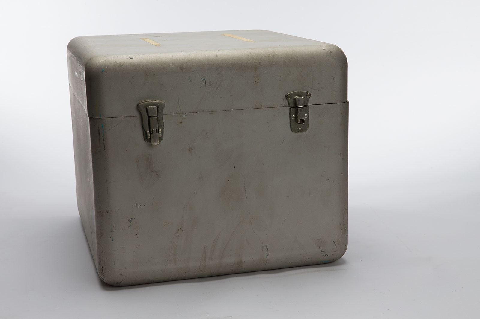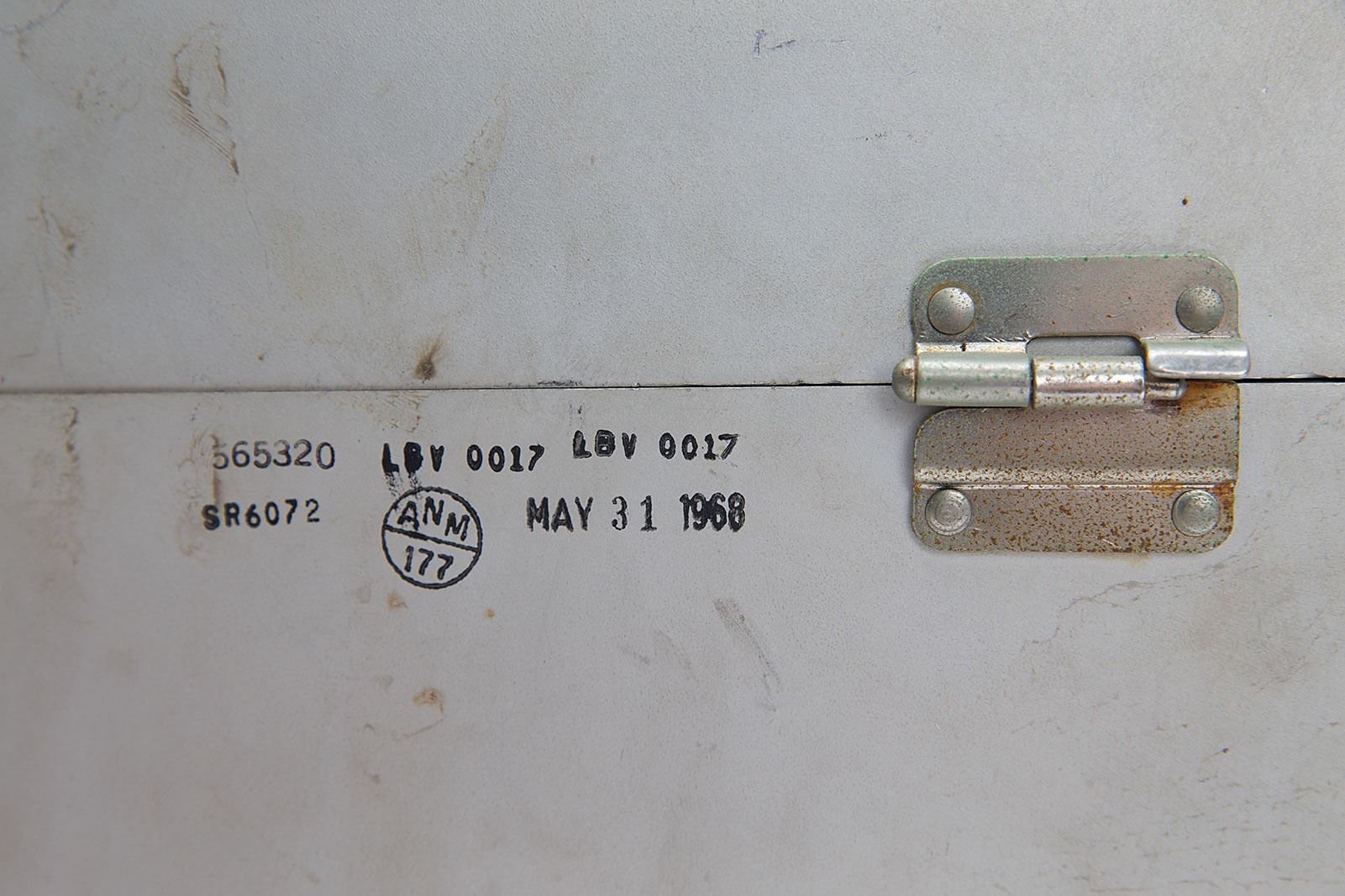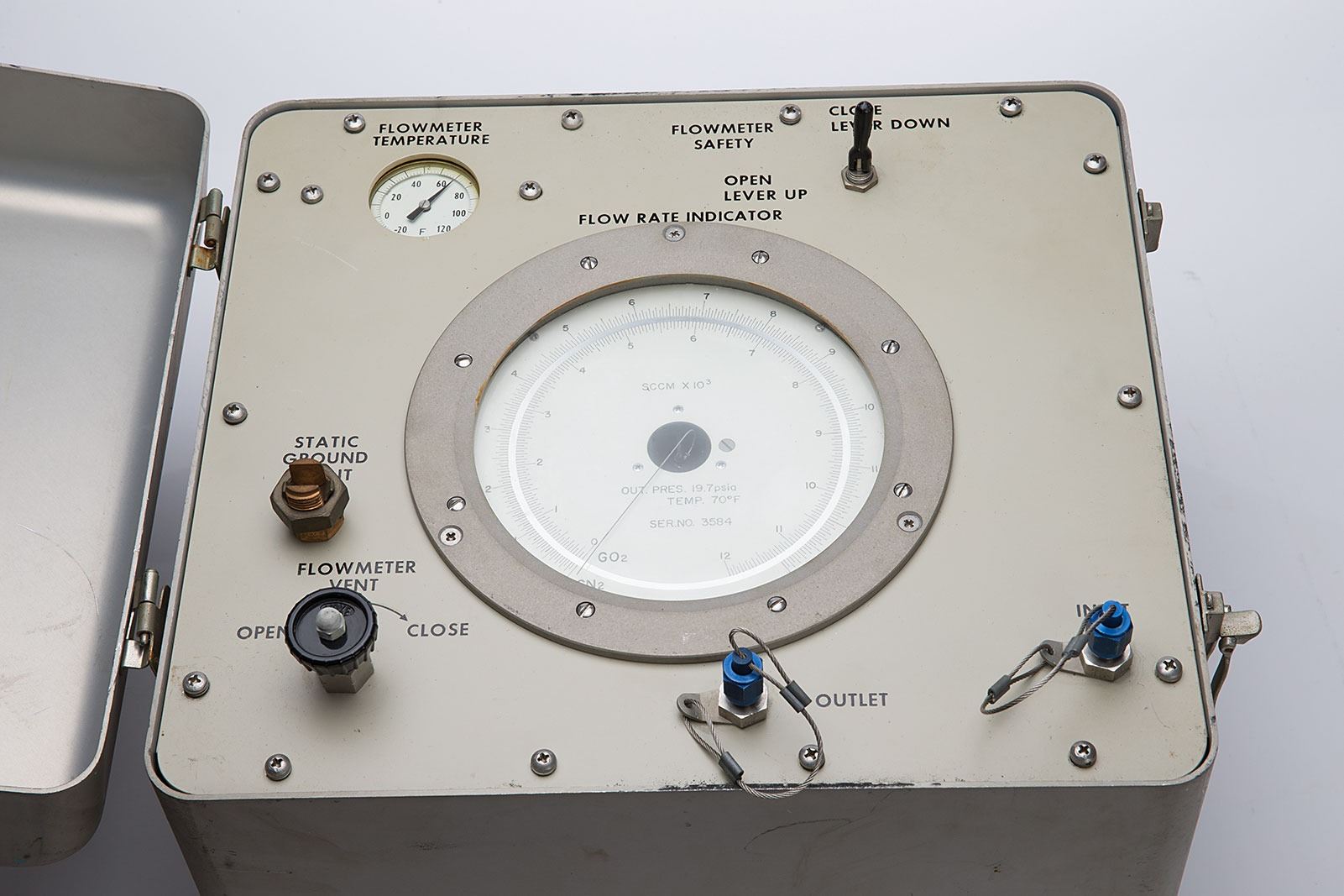 Apollo CSM Flowmeter Test Set used for measuring gaseous oxygen and nitrogen, measuring 15? x 13.5? x 12?, marked inside the cover with a part number, "Assy G16-844024." The gray metal case opens to reveal a panel with a large "Flow Rate Indicator" gauge, "Flowmeter Temperature" gauge, inlet and outlet ports, flowmeter safety lever, static ground point, and flowmeter vent knob. In fine condition, with one broken latch.