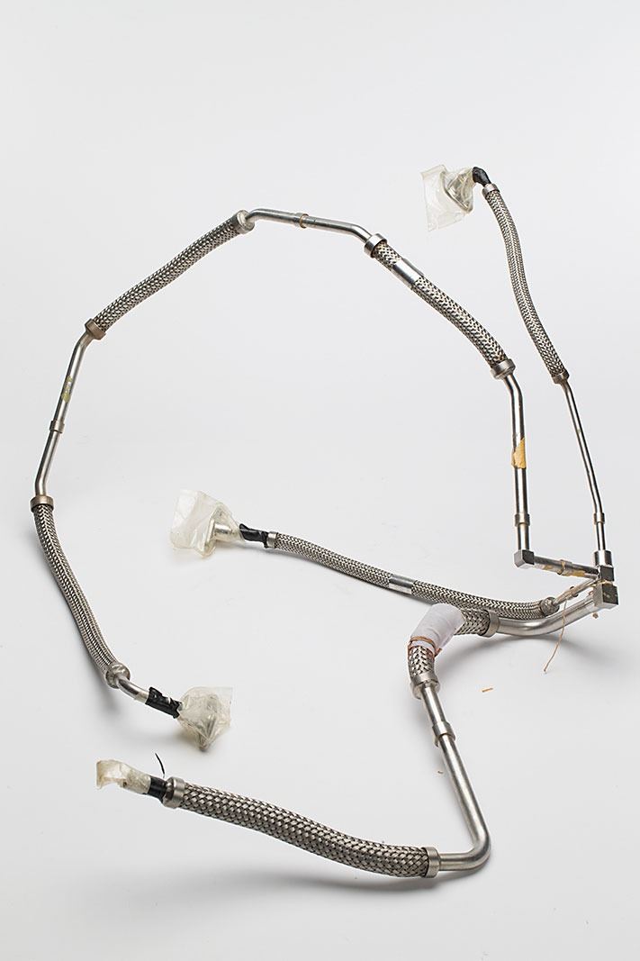 Apollo CSM SPS Cryogenic Hose used in the propellant pressurization system (helium), comprising several flexible braided metal hoses connected via stiff piping, marked on a metal tag: "ME271-0091-0078, Rev. A-03, MBC P/N 73622-018, Rev. D, S/N 16519-003, 180 PSI Proof, 2-76." In fine condition.
