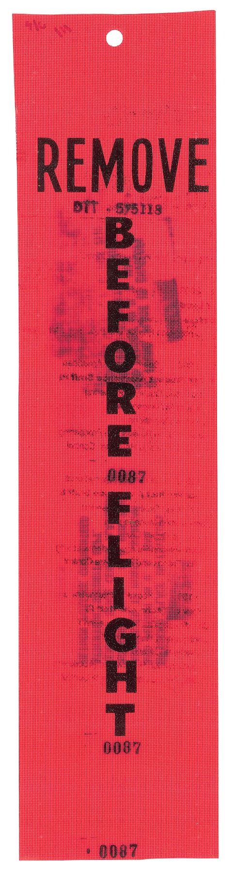 Uncommon bright red 3 x 12.5 streamer removed from an Apollo command and service module (CSM), marked in bold lettering: "Removed Before Flight," with stamped part numbers: "DTT—575118" and "0087." In fine condition. Accompanied by a copy of a certificate of authenticity from C. L. 'Buddy' Corbin of the Apollo Launch Team at North American Rockwell, in full: "This is to certify that this Removed Before Flight streamer was used on the Apollo Command and Service Modules. Each streamers location and use on the Apollo CSM had to be logged. Prior to flight all streamers had to be removed and checked off the log. Any streamer not checked off the log was considered left on the spacecraft and would require an investigation. Each streamer was individually numbered and was reused on the next spacecraft."