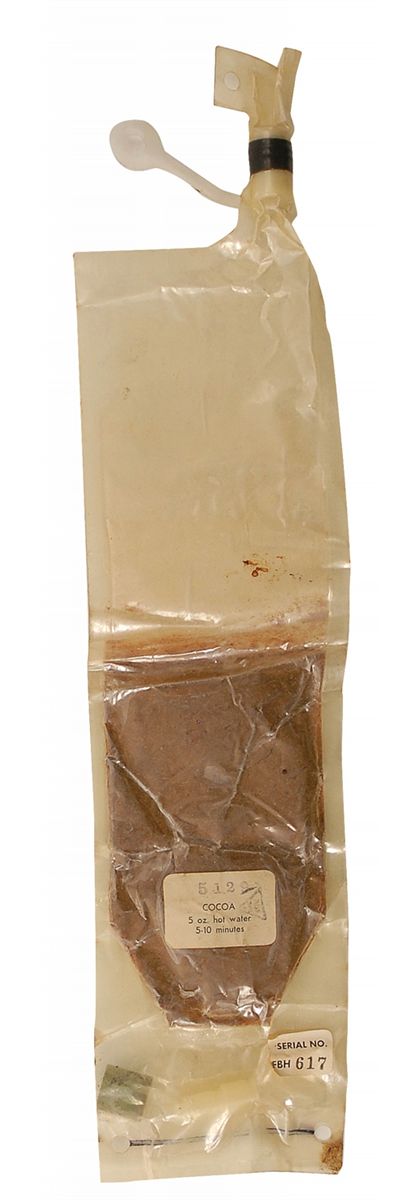 Unflown and unopened packet of cocoa. Sizable amount of cocoa is contained in its 3.5 x 13 pouch, with drinking nozzle at the top. Label near bottom reads, “Cocoa 5 oz. hot water. 5-10 minutes.” In fine condition, with expected age wear.