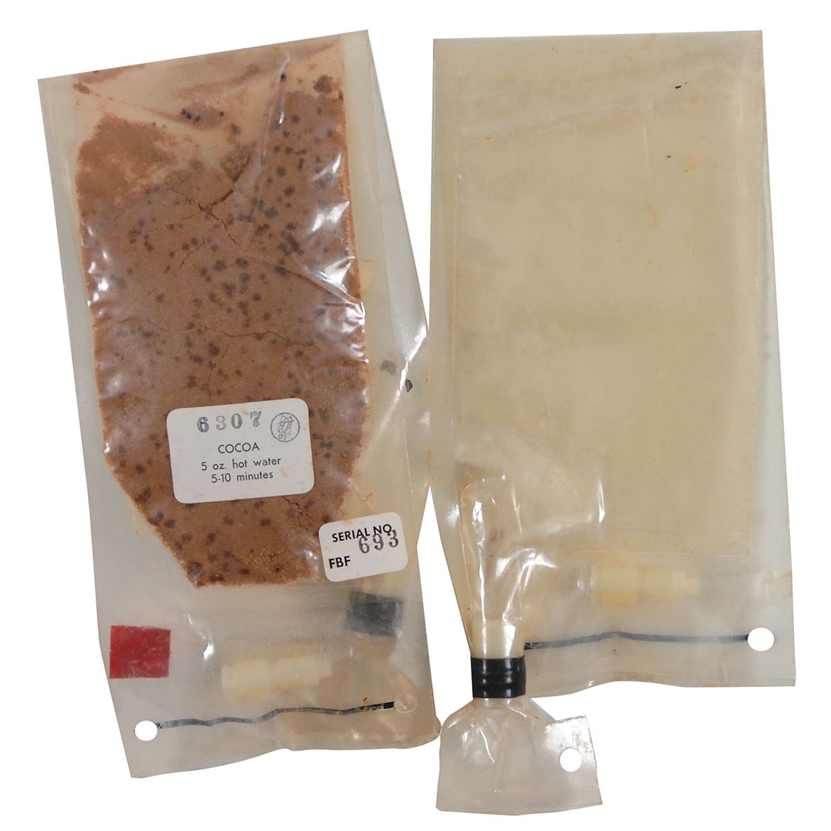 Unflown and unopened packet of cocoa. Sizable amount of cocoa is contained in its 3.5 x 13 pouch, with drinking nozzle at the top. Label near the bottom reads, “Cocoa 5 oz. hot water. 5–10 minutes.” Also includes an empty cocoa pouch. In fine condition, with expected age wear.