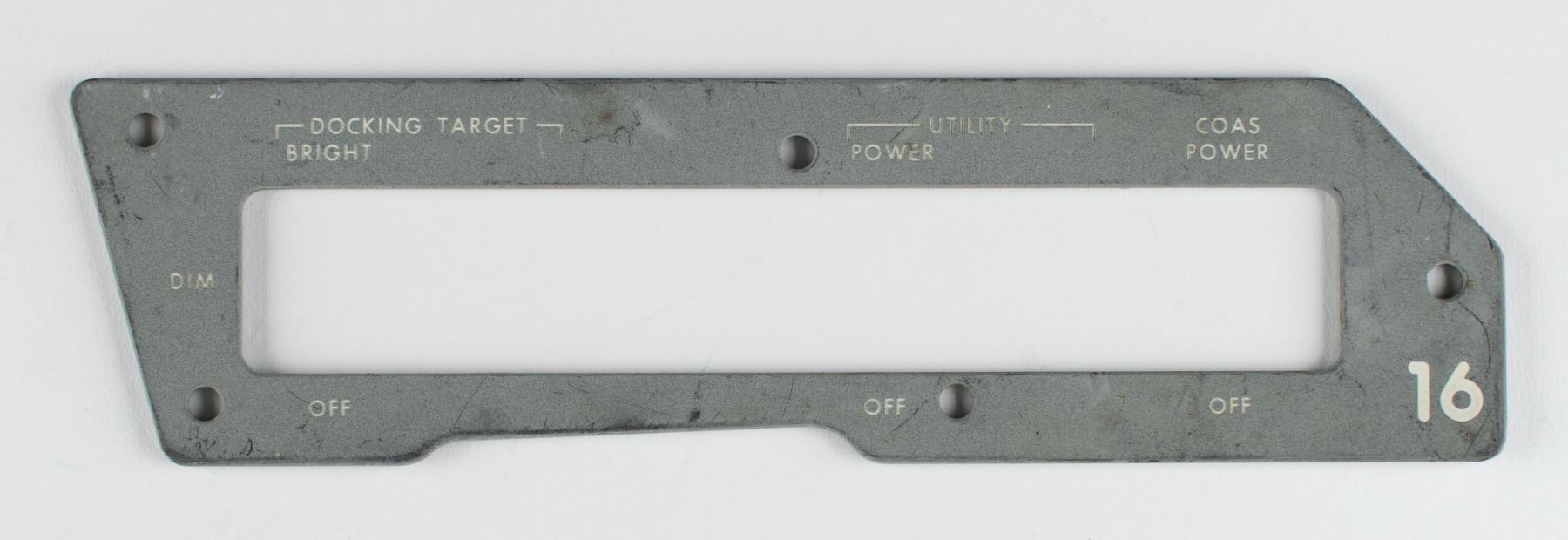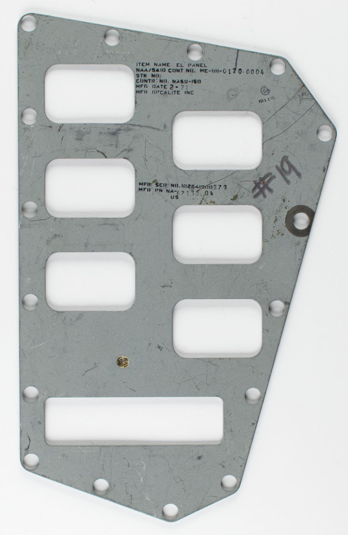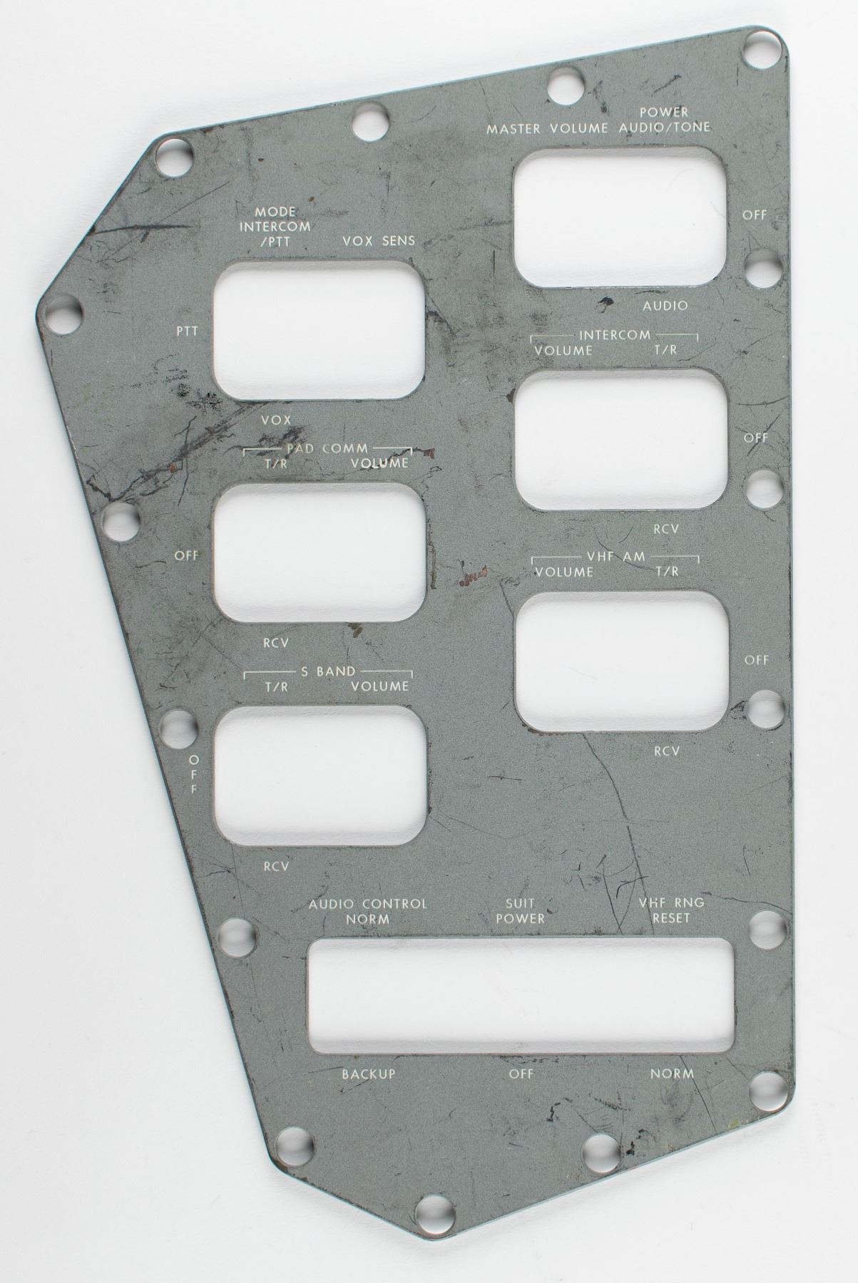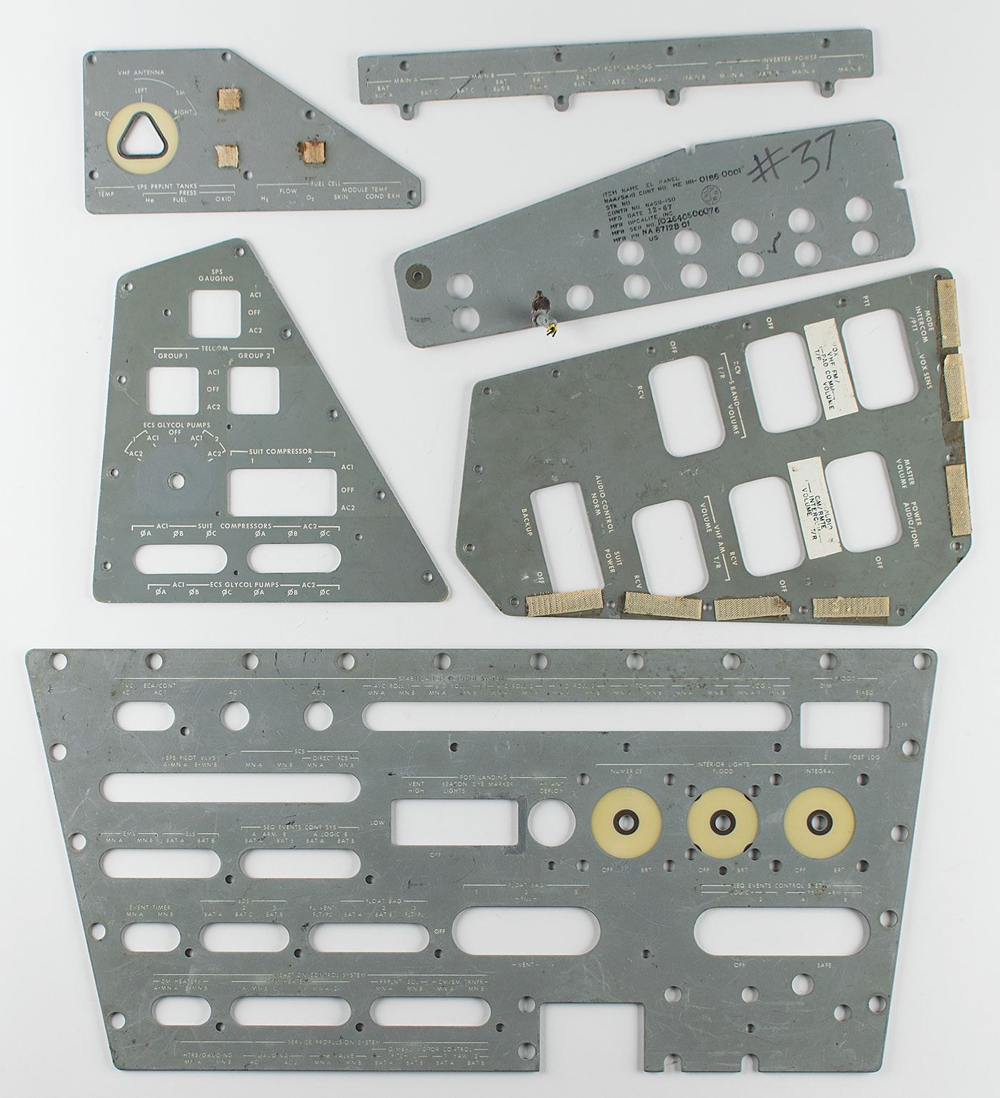 Collection of thirteen Apollo Command Module Block 1 and Block 2 mock-up control panel components, primarily consisting of electroluminescent overlays. The Apollo spacecraft saw the first application of electroluminescent lighting, which generated a blue glow that allowed astronauts to sleep or run exercises that required low light within the module. This grouping includes a mock-up audio control panel marked "6" on the face, featuring four knobs (attached with metal axles on wooden blocks, no electronics); a mock-up audio control panel featuring text related to volume controls and five knobs mounted in a similar manner, with some text plates missing; a telecommunications panel marked as "225" on the face, with part number "V36-762165-41" and several wooden blocks on the reverse; two different communications panels with markings related to volume and radio controls (one marked on the reverse with a manufacture date of "2-71"); a panel marked "16" with a long slot on the front and text associated with the docking target and COAS power, marked on the reverse with a manufacture date of "3-69"; a panel marked "VHF Antenna," with manufacture date of "12-68" on the reverse; a panel marked "229" on the face with circular holes for EPS groups, marked with a manufacture date of "12-67" on the reverse; a long rectangular panel for power systems, marked with a manufacture date of "12-67" on the reverse; three large trapezoid-shaped panels with text for environmental, propulsion, and stabilization control systems, one with a manufacture date of "12-67" and another with a date of "2-69," the third undated; and a panel with sections for "SPS Gauging," "Suit Compressor," and "Glycol Pumps." In overall very good to fine condition.