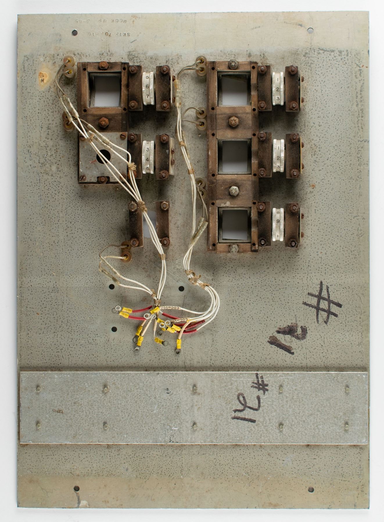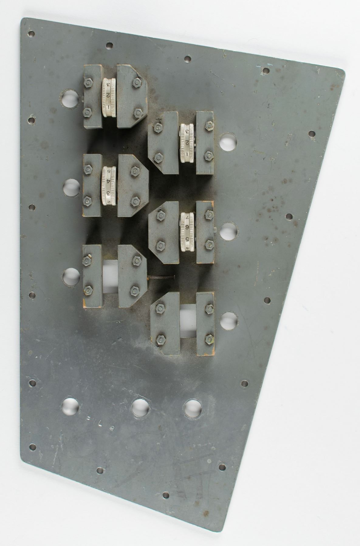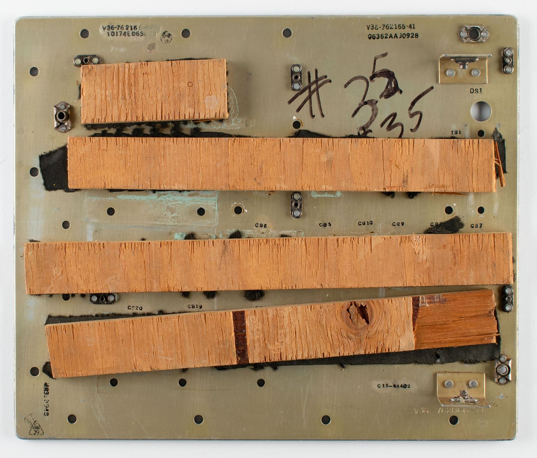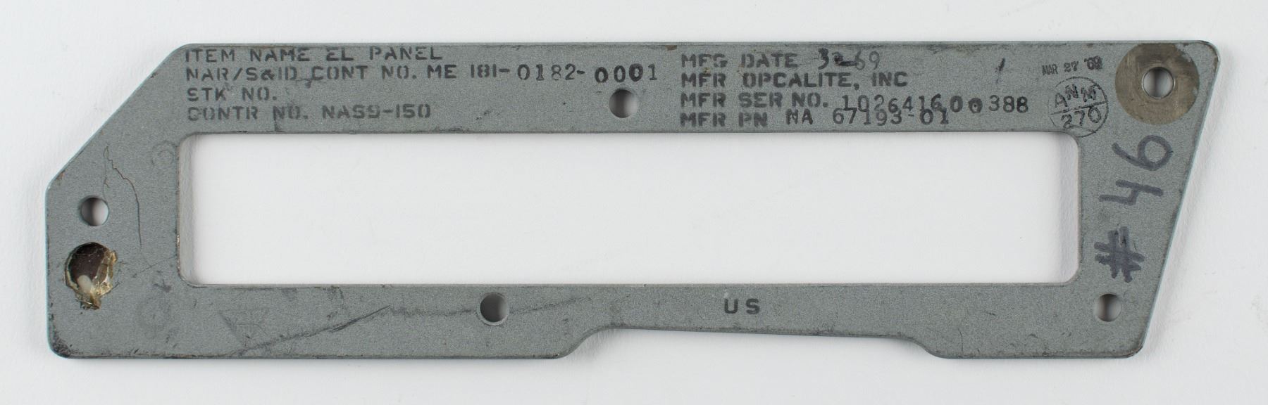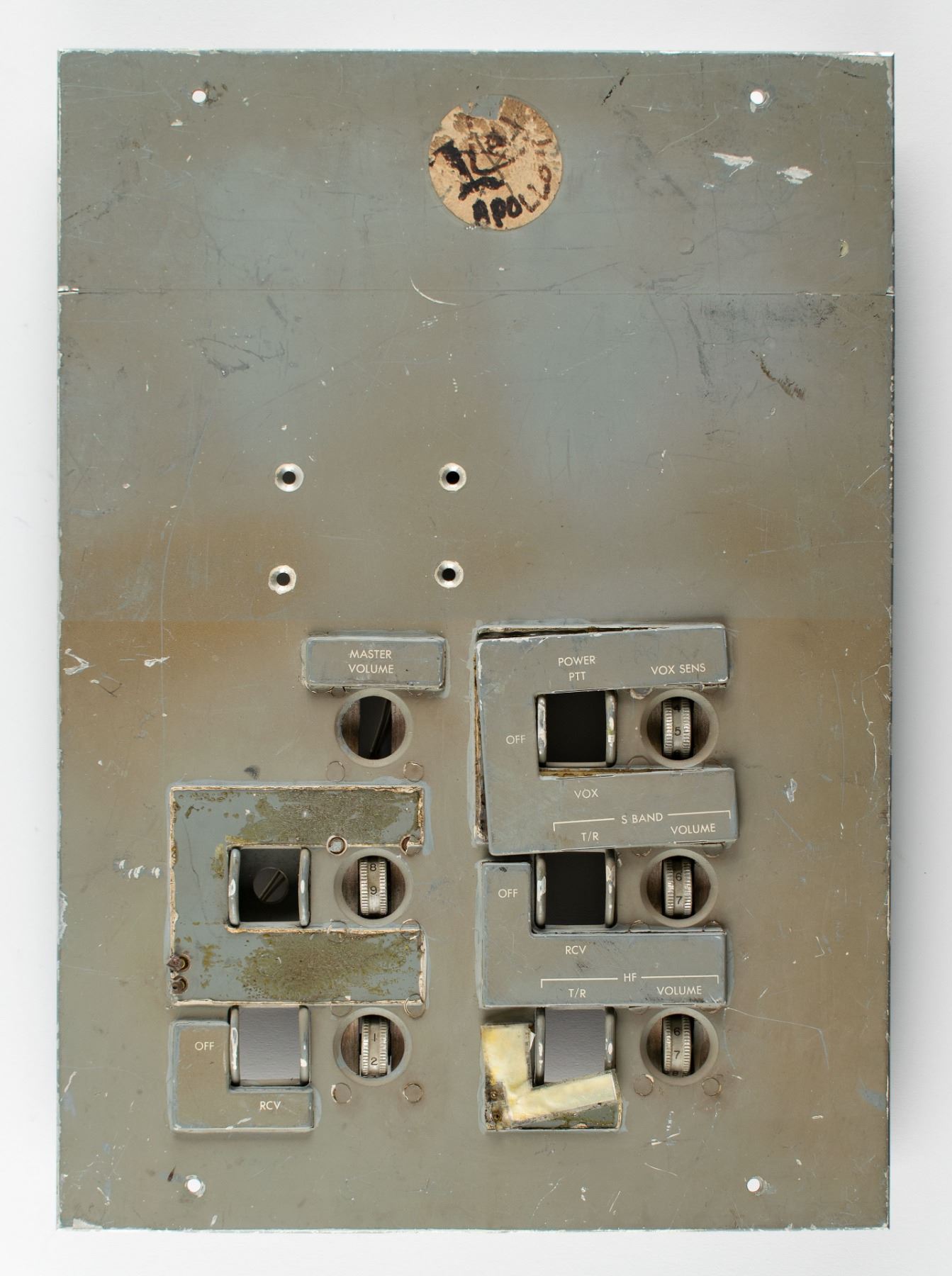 Collection of thirteen Apollo Command Module Block 1 and Block 2 mock-up control panel components, primarily consisting of electroluminescent overlays. The Apollo spacecraft saw the first application of electroluminescent lighting, which generated a blue glow that allowed astronauts to sleep or run exercises that required low light within the module. This grouping includes a mock-up audio control panel marked "6" on the face, featuring four knobs (attached with metal axles on wooden blocks, no electronics); a mock-up audio control panel featuring text related to volume controls and five knobs mounted in a similar manner, with some text plates missing; a telecommunications panel marked as "225" on the face, with part number "V36-762165-41" and several wooden blocks on the reverse; two different communications panels with markings related to volume and radio controls (one marked on the reverse with a manufacture date of "2-71"); a panel marked "16" with a long slot on the front and text associated with the docking target and COAS power, marked on the reverse with a manufacture date of "3-69"; a panel marked "VHF Antenna," with manufacture date of "12-68" on the reverse; a panel marked "229" on the face with circular holes for EPS groups, marked with a manufacture date of "12-67" on the reverse; a long rectangular panel for power systems, marked with a manufacture date of "12-67" on the reverse; three large trapezoid-shaped panels with text for environmental, propulsion, and stabilization control systems, one with a manufacture date of "12-67" and another with a date of "2-69," the third undated; and a panel with sections for "SPS Gauging," "Suit Compressor," and "Glycol Pumps." In overall very good to fine condition.