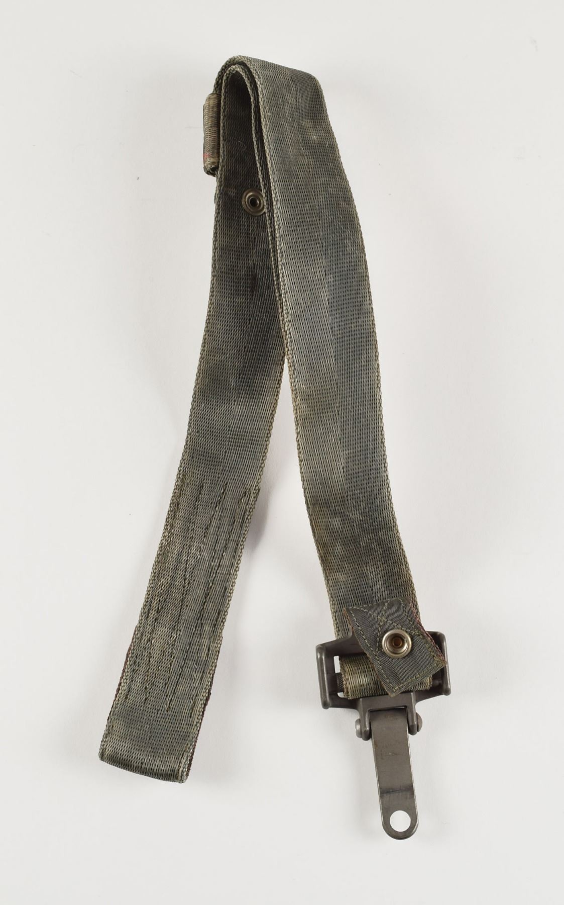 Apollo Command Module Block I crew restraint harness strap, approximately measuring 29? in length, with buckle, locking lever, and faded green nylon strap bearing two male and one female snap closures (one male snap missing); the small strap attached to buckle features a single female snap. In fine condition.