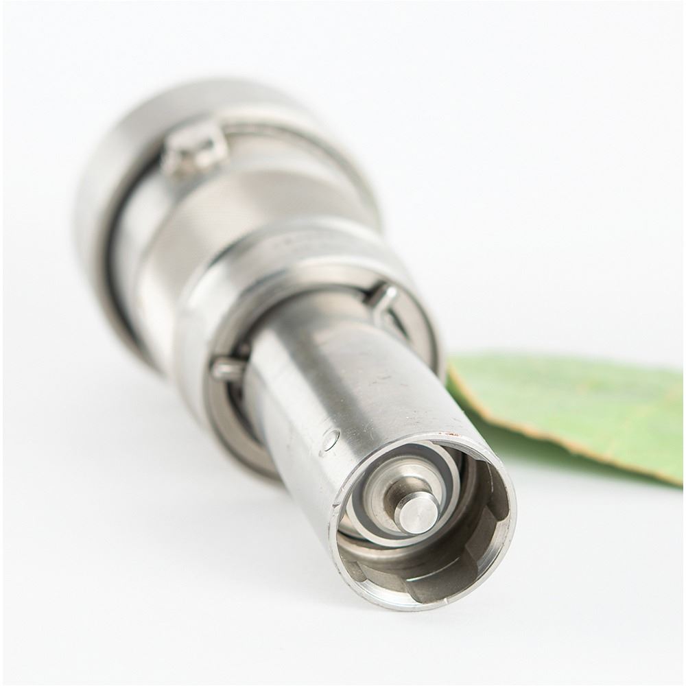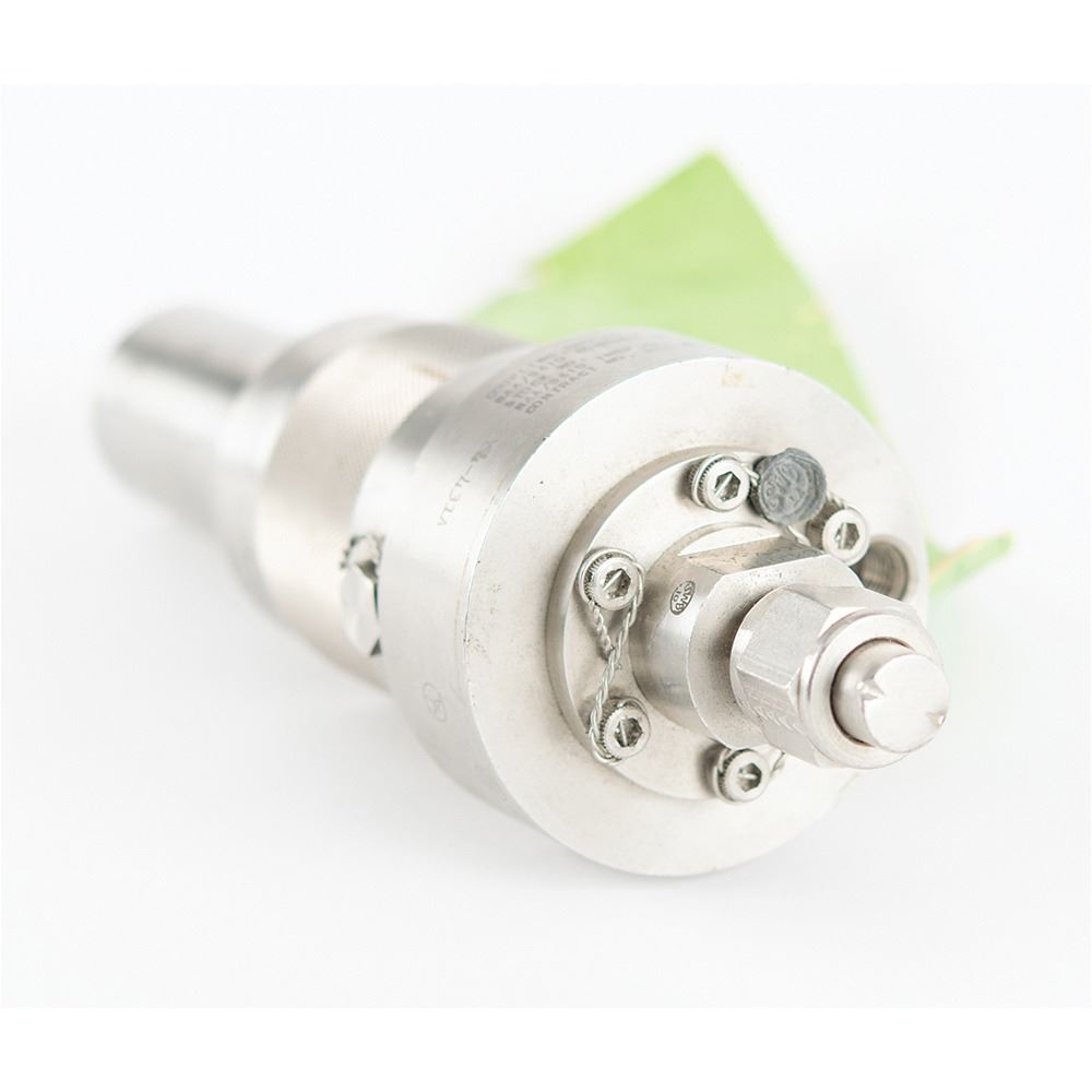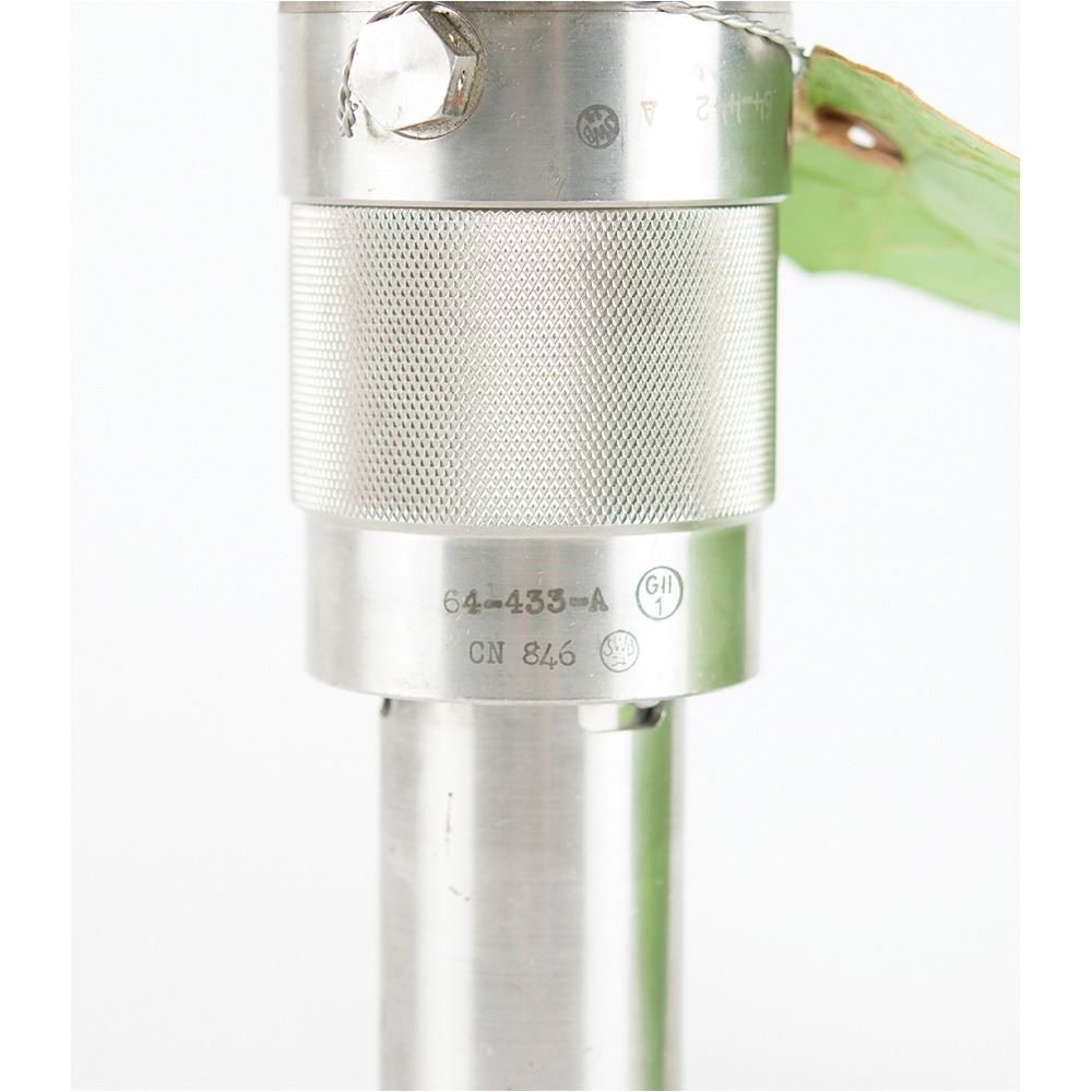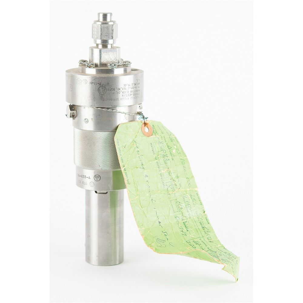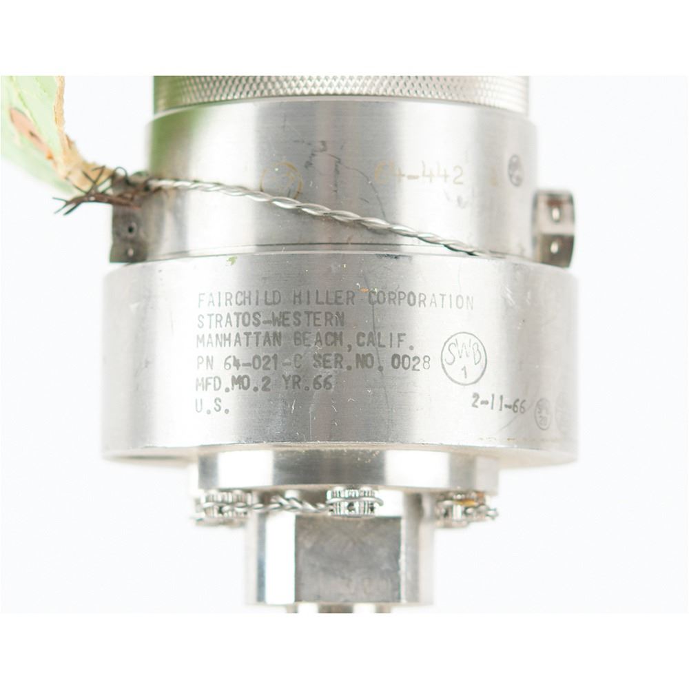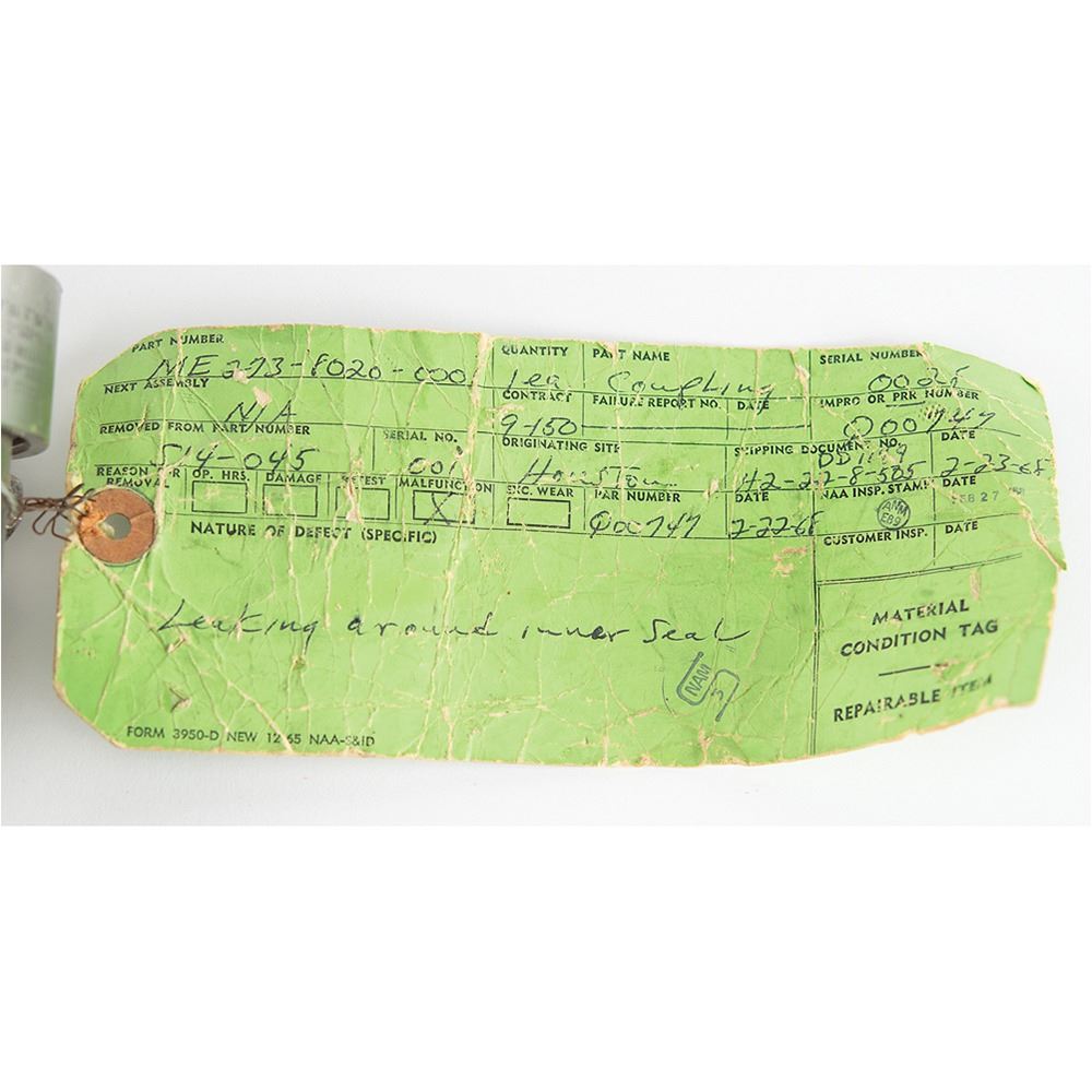 Cryogenic oxygen ground coupling used to fill the Apollo CSM's oxygen tanks pre-launch, measuring 10Ë long with a diameter of 3Ë, marked on the side: "Coupling, Ground, Fill, Oxy, NAA/S & ID Control No. ME278-8020-0001…Contract No. NAS9-150." This coupler would mate with a corresponding Service Module side coupler during pre-flight operation, with disconnect occurring upon retraction of the launch pad swing arms shortly before lift off. A worn material condition tag is attached, noting a "leak around inner seal." In fine condition.