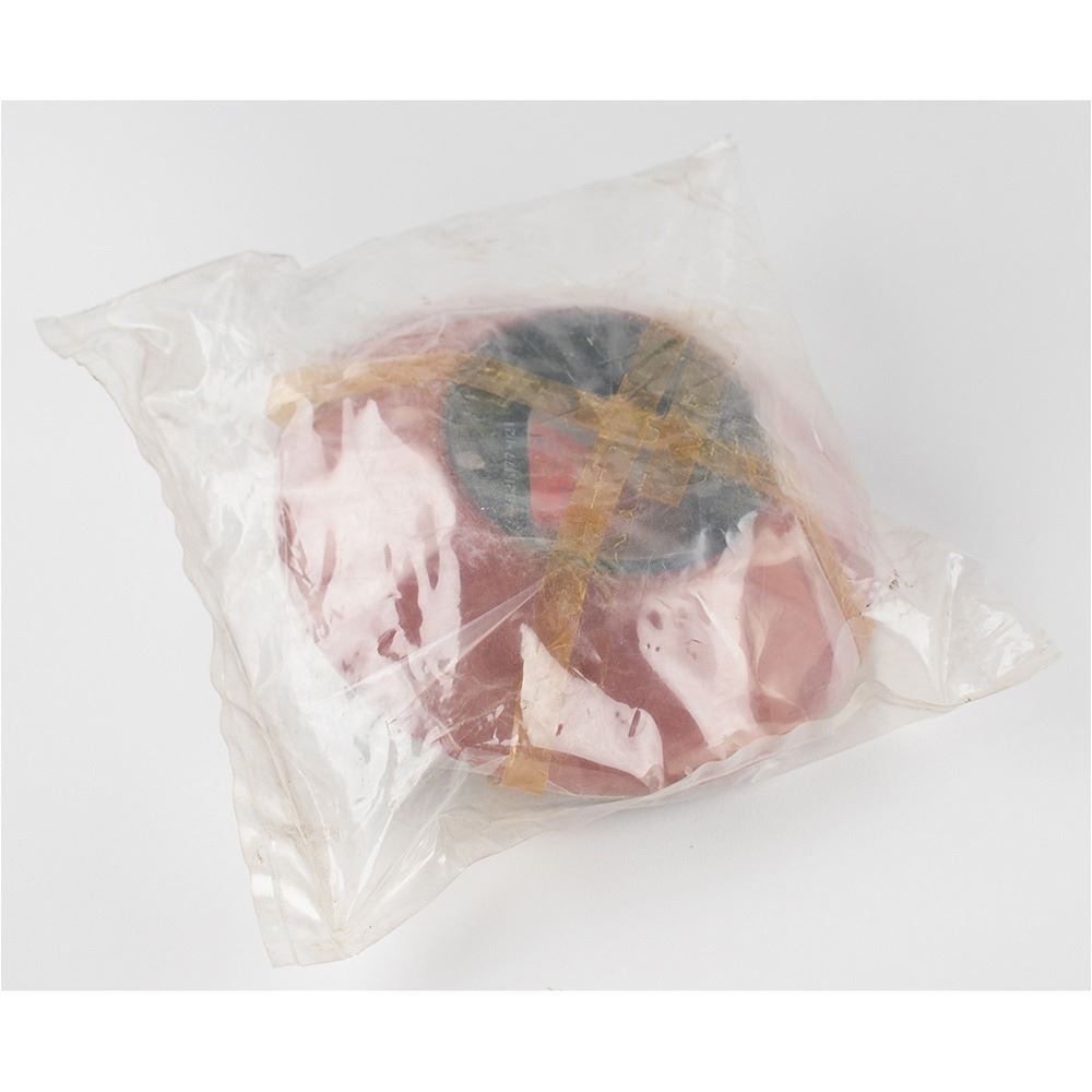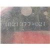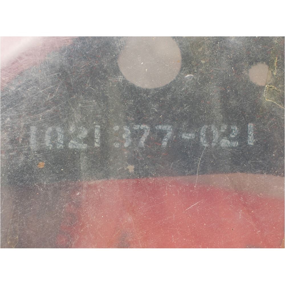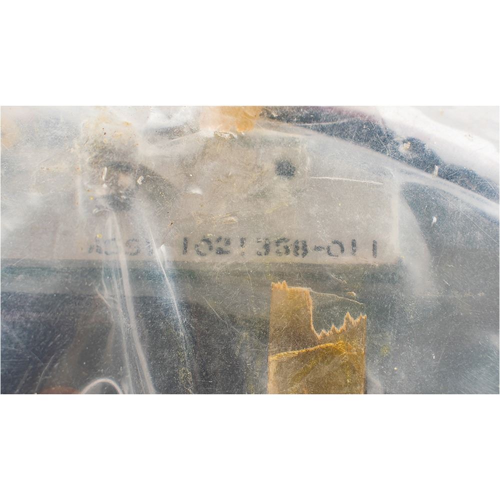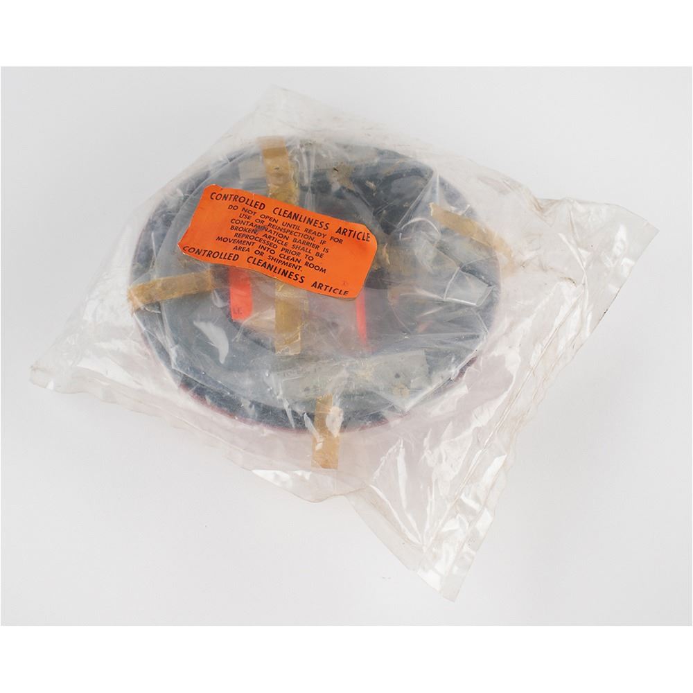 Apollo Command Module Optical Sextant Liner sealed in its original packaging. The red metal liner measures 8" in diameter, with stamped part numbers to top, "1021 377-021," and underside, "Assy 1021 358-011" and "Assy 1021 358-011." Packaging retains original "Controlled Cleanliness Article" label, and the interior appears to house a package of small ablative plugs.