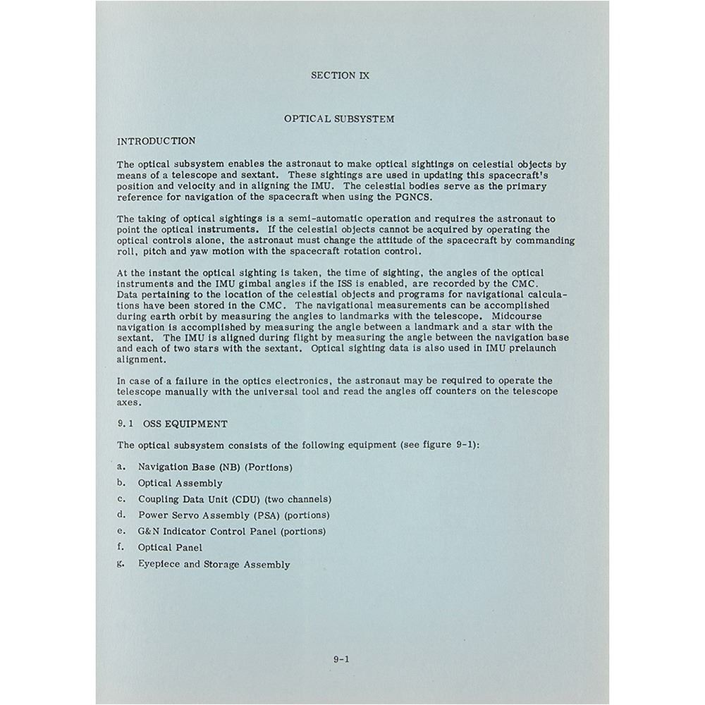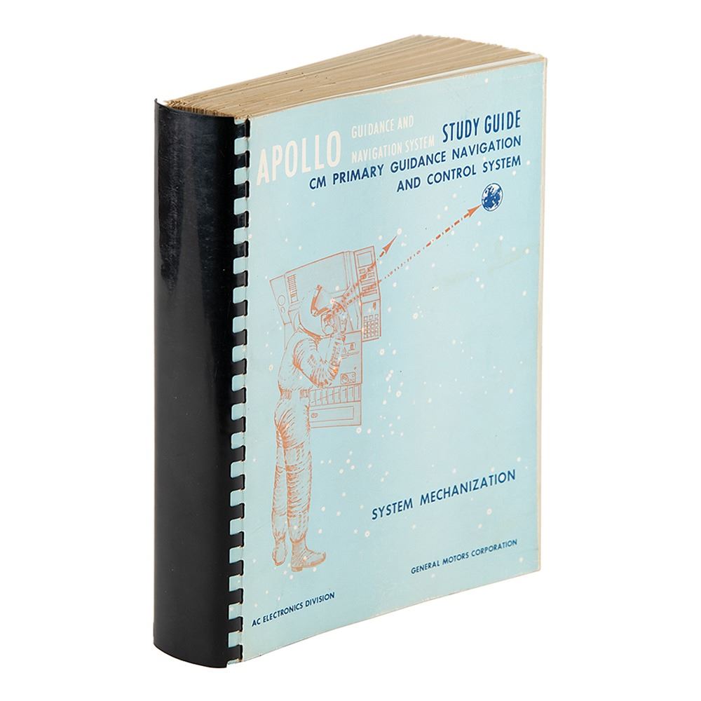 Spiral-bound original manual entitled “Apollo Command Module / Primary Guidance, Navigation and Control System / Student Study Guide / C/M PGNCS, Level III, System Mechanization Course SM-2100,†November 25, 1966, prepared by the AC Electronics Division of General Motors. The manual, 8.5Ë x 10.5Ë x 2.25Ë, approximately 395 pages, contains 10 sections—Introduction to the Primary Guidance, Navigation and Control Systems, Introduction to the Inertial Subsystem, Coupling Data Unit, ISS–System Modes of Operation, IMU Temperature Control System, Display and Control Panels of the Lower Equipment Bay, Power Supplies and Distribution, Signal Monitoring, Detection and Signal Conditioning, Optical Subsystem, and The Computer Subsystem. The manual contains an impressive array of over 200 detailed illustrations. A few annotations can be found inside. In fine condition, with some light staining and creasing to the covers.