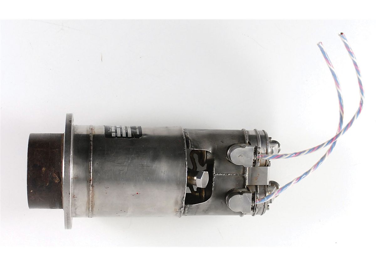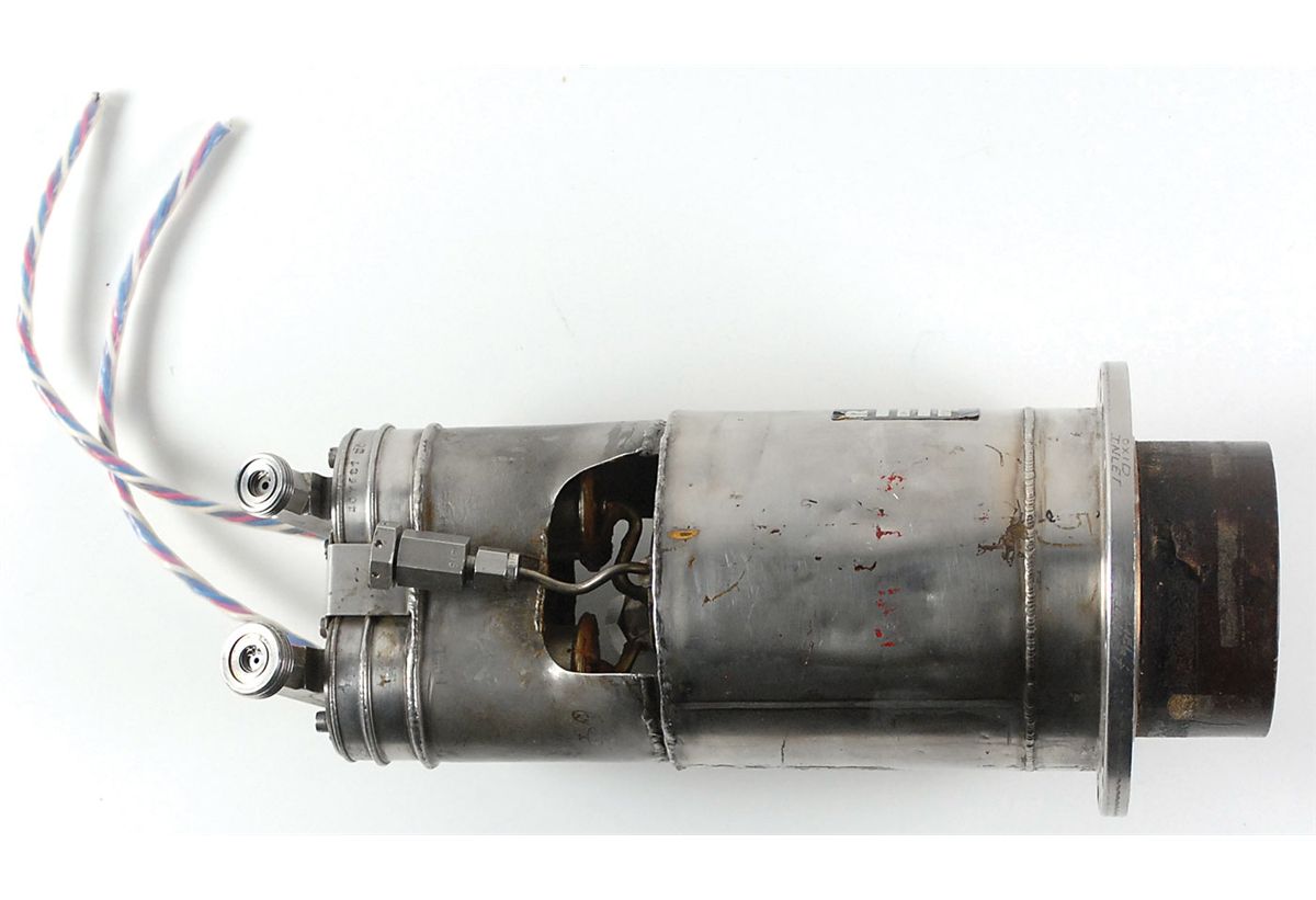 An Apollo Command Module Rocket Engine. Test-fired Rocketdyne model number SE-8 measures approximately 14? tall, weighs almost 9.5 pounds, with the fuel and oxidizer valve assemblies at the top, along with associated electrical connections, and a 3.5? ablative nozzle at the base. The engine internal components are comprised of a block of ablative material and sleeve (includes the exposed nozzle), a refractory throat insert, and stainless steel shell. A large Rocketdyne ID label affixed to the lower portion reads, in part: “Part Name – Rocket Engine, Part No. 99-106003 ASSY, Contract No. 8405, Model No. SE-8-2, Serial No. 4050594.” Both the valve assemblies are stamped “Test Only,” with one dated November 21, 1963. In fine condition, with expected light scorching from firing, and light dings and dents to body. Accompanied by two photocopies of the SE-8 engine details and their locations on the Command Module.