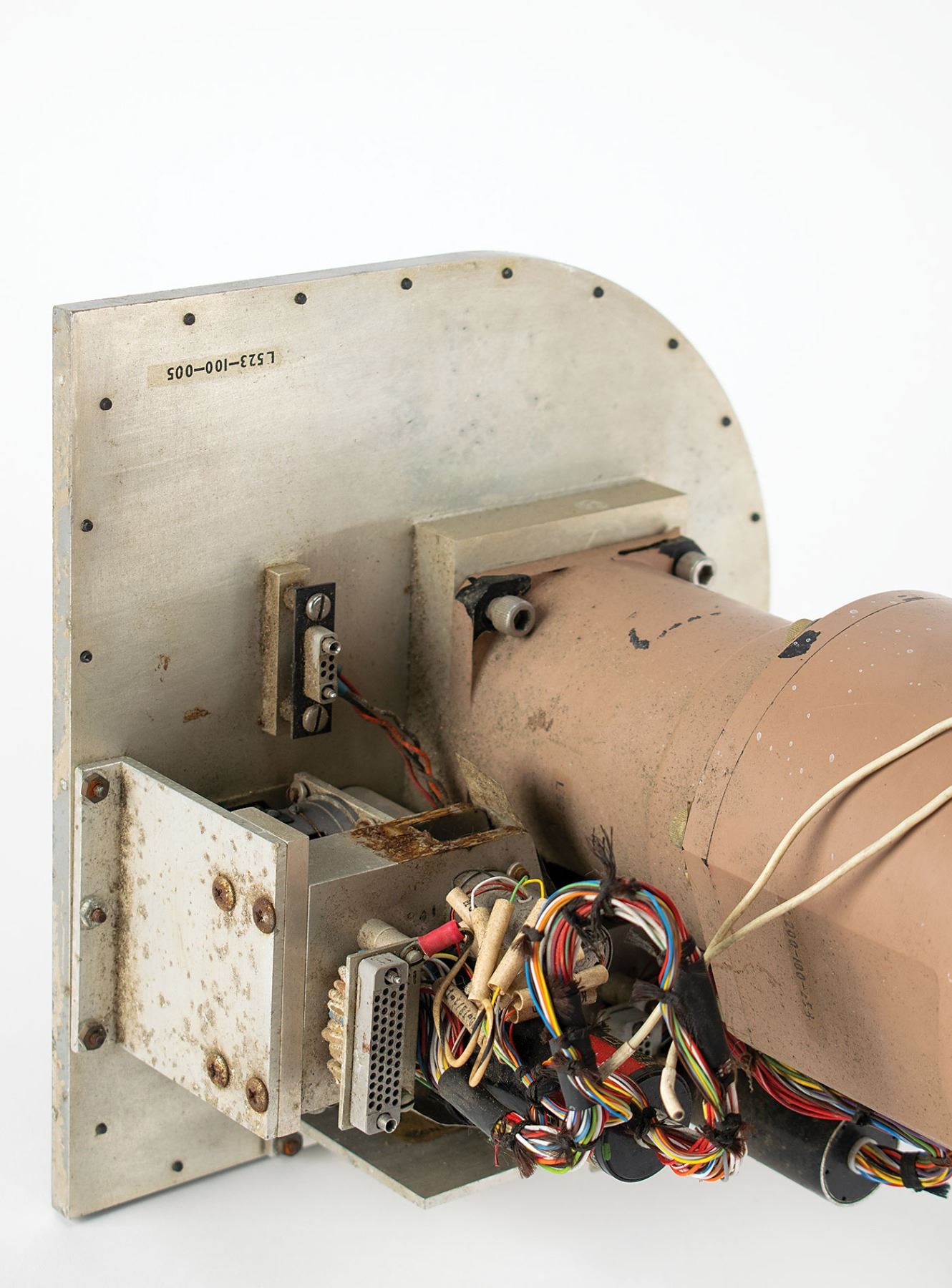 Two optical components from the sextant (SXT) and scanning telescope (SCT) of an Apollo Command Module simulator, famously called the 'Great Train Wreck' by John Young. The large optical assembly is for the scanning telescope (SCT), measuring approximately 38? x 16? x 9?, and comprises a long optical tube terminating in a lens marked "L200-100-208 ASS'Y"; on the other end is the interior faceplate that has indicators for shaft angle and trunnion measurements. The dials and partial electronics for these two windows remain intact behind the faceplate. The two round hex recess-head parts on the face plate that look like screws are actually emergency backup drive units. A space tool inserted in the hex recess could be used to unlock and then drive the shaft and trunnion of the SCT manually. The scanning telescope served as a 'finder' for stars and was a unity power (1X) instrument. The SCT was coupled electronically to the sextant and stars located in the center of the image in the SCT would be in, or near, the center of the field of view in the sextant. An angled eyepiece would have been attached to the front of the plate for looking through the Scanning Telescope.