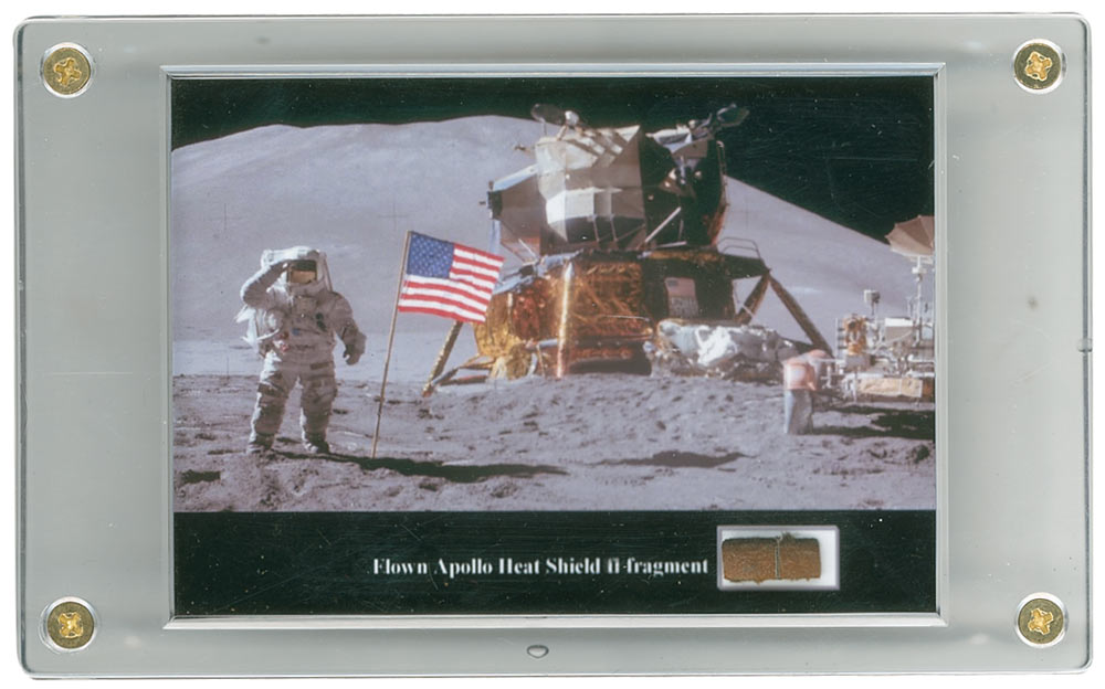 Flight-flown heat shield fragment taken from an Apollo command module after its return to Earth, removably encased in Lucite against a color photo of Jim Irwin saluting the American flag on the lunar surface, to an overall size of 5 x 3.