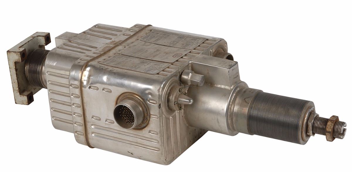 Apollo Command Service Module (CSM) Pitch Actuator utilized for ‘steering’ the spacecraft on its journey to and from the moon. The electro-mechanical actuator was installed in pairs on the Service Propulsion System (SPS) AJ10-137 main engine to change nozzle orientation in Pitch and Yaw. The nozzle deflection in conjunction with rocket engine firing (upon command from computer or crew input) resulted in thrust vectoring to alter the course of the CSM (and the Lunar Module when docked with the CSM). This gimbal actuator is a mature example that was deaccessioned directly from North American Rockwell at the conclusion of qualification testing for the Block II Apollo CSM.